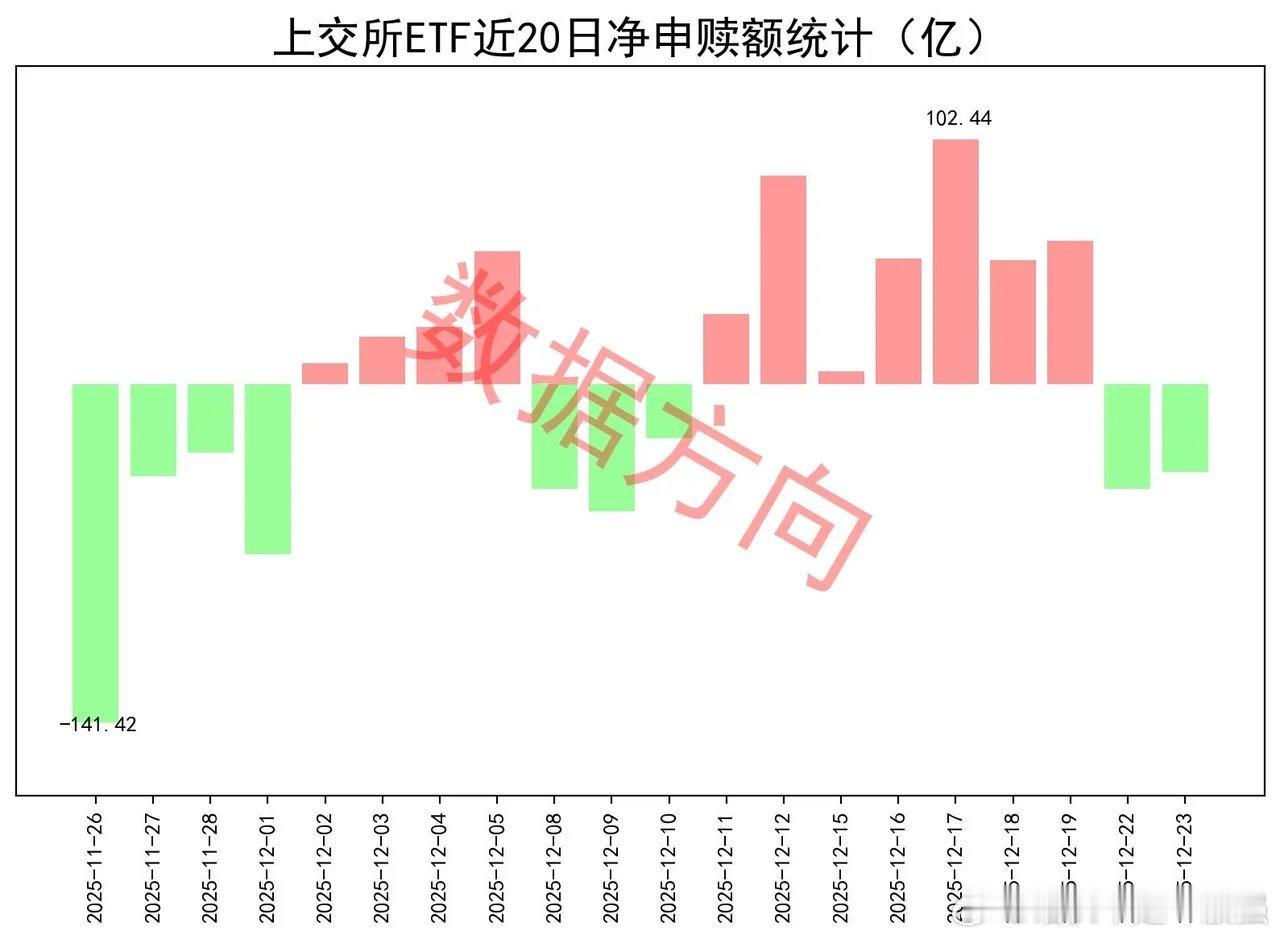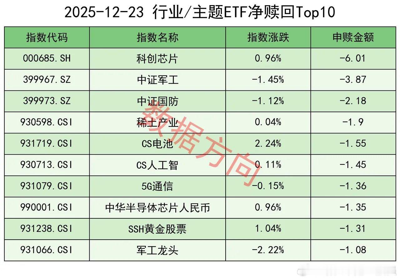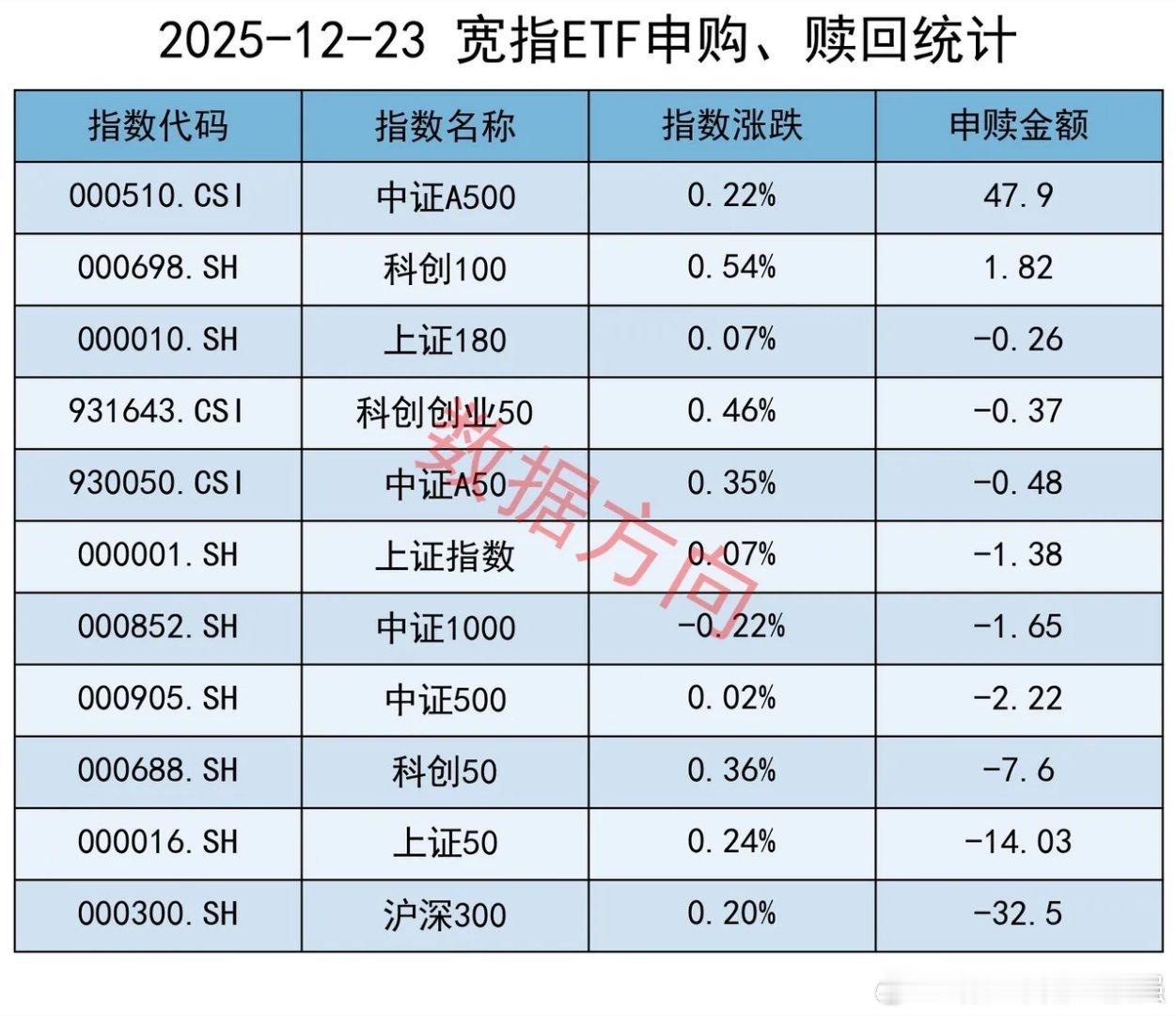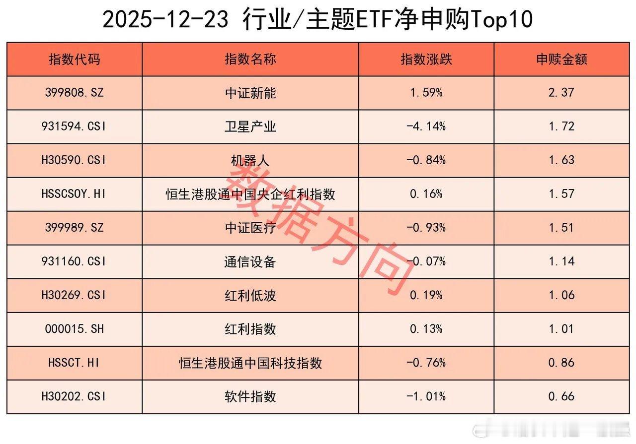 中证iconA500持续获资金流入12月23日星期二,大盘全天窄幅整理,大小盘股有所分化,算力硬件、半导体设备、有色金属等涨幅居前。上证指数涨幅0.07%,上交所iconETF合计净赎回icon36.58亿元。宽指中证A500指数(47.9亿),净申购近50亿。不只是这一天,近段时间以来,中证A500指数持续获得大幅净申购。科创100指数(1.82亿),获小幅净申购。沪深300指数(-32.5亿),净赎回超过30亿。上证50指数(-14.03亿),净赎回超过10亿。科创50指数(-7.6亿),净赎回超过5亿。中证500指数(-2.22亿)、中证1000指数(-1.65亿)、上证指数(-1.38亿)、中证A50指数(-0.48亿)、科创创业50指数(-0.37亿)、上证180指数(-0.26亿),分别被小幅净赎回。行业和主题 恒生港股通icon中国央企红利指数(1.57亿)、红利低波指数(1.06亿)、红利指数(1.01亿),一起进入申购icon榜。其他进入申购榜的还有:中证新能指数(2.37亿)、卫星产业指数(1.72亿)、机器人指数(1.63亿)、中证医疗指数(1.51亿)、通信设备指数(1.14亿)、恒生港股通中国科技指数(0.86亿)、软件指数(0.66亿)。中证军工指数(-3.87亿)、中证国防指数(-2.18亿)、军工龙头指数(-1.08亿),一起进入赎回榜。科创芯片指数(-6.01亿)、中华半导体芯片icon人民币指数(-1.35亿),一起进入赎回榜。其他进入赎回榜的还有:稀土产业指数(-1.9亿)、CS电池指数(-1.55亿)、CS人工智指数(-1.45亿)、5G通信指数(-1.36亿)、SSH黄金股票指数(-1.31亿)。
