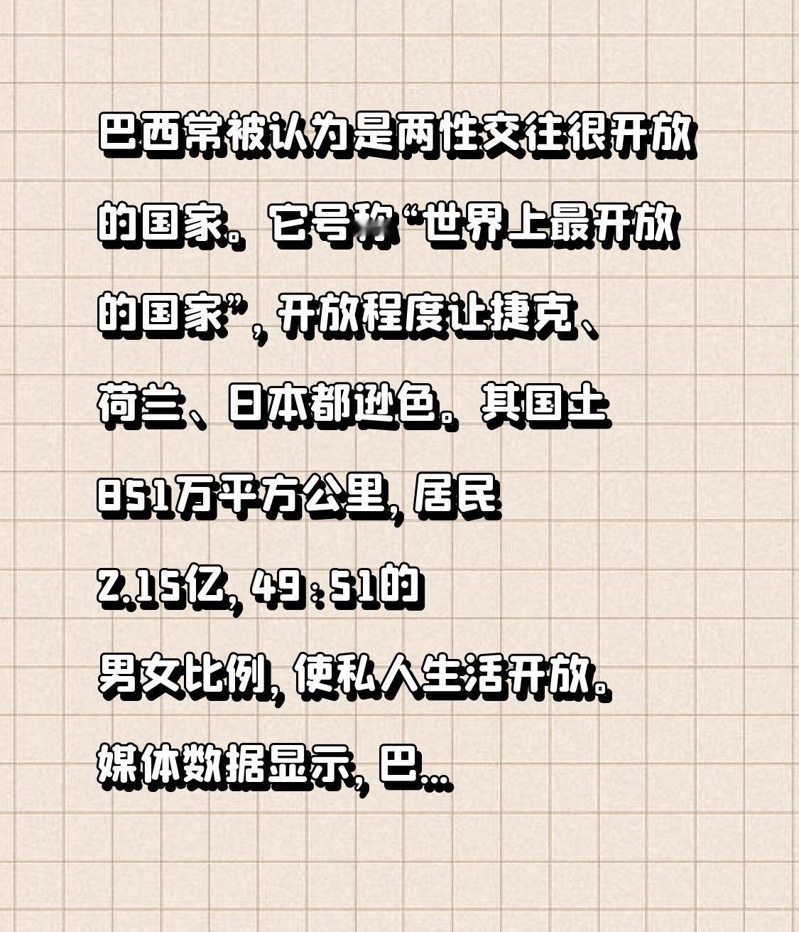 巴西常被认为是两性交往很开放的国家。它号称“世界上最开放的国家”,开放程度让捷克、荷兰、日本都逊色。其国土851万平方公里,居民2.15亿,49:51的男女比例,使私人生活开放。媒体数据显示,巴西平均每位女性一生最少有15个伴侣。 当地狂欢节很有名,人们还会热情邀游客一起在海里或河里男女共浴。这和它的历史有关,早期因黑人自卑,鼓励与白人通婚,产生了开放思想文化。不过,有中国小伙爱上巴西美女想结婚时,导游却劝慎重,看来这开放背后也有值得考量之处。