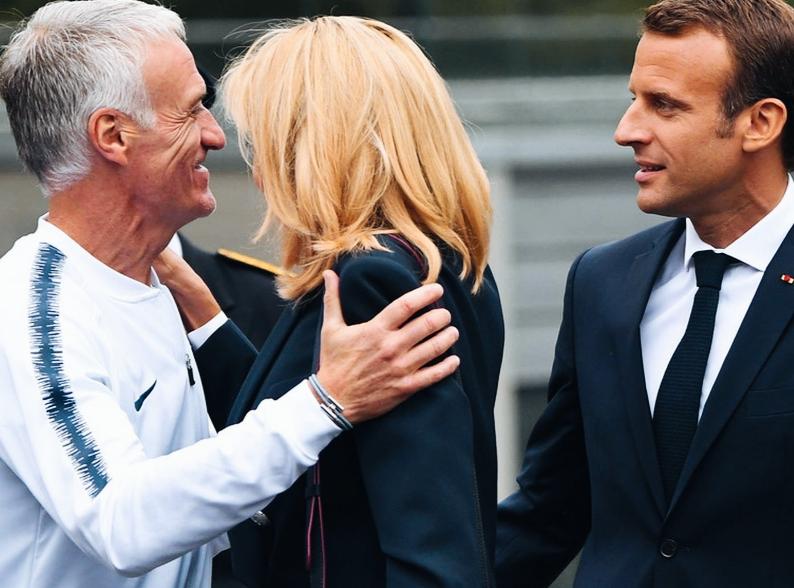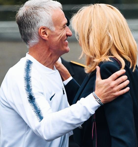 布丽吉特和德尚亲密交流,马克龙站一旁在想什么呢? 德尚满脸笑容啊!看来两人交流的