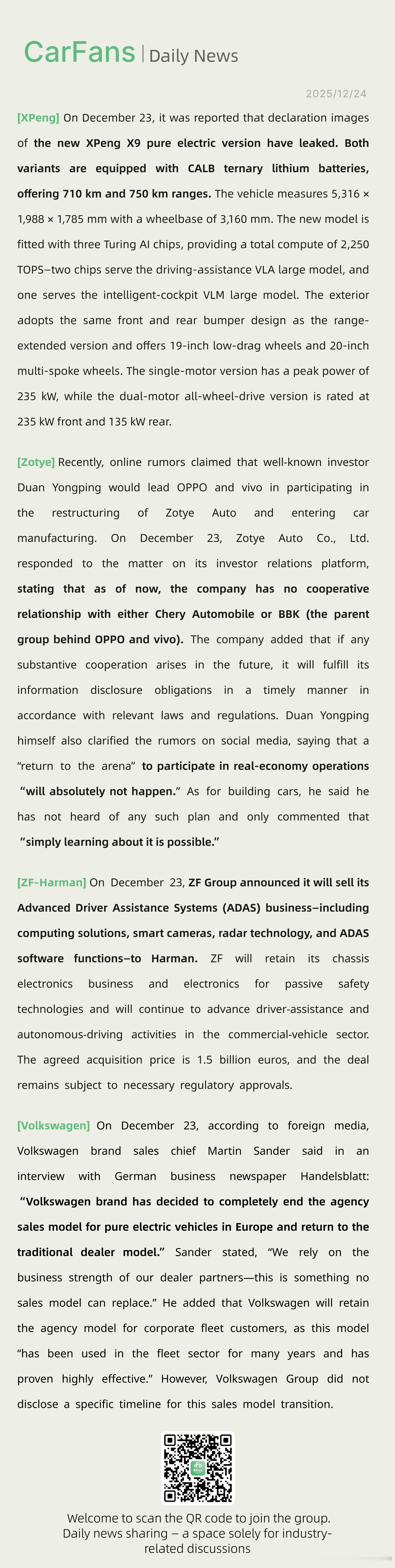 众泰和段永平辟谣与奇瑞汽车及步步高无合作、大众欧洲终止纯电动车代理销售模式网络上有传闻称,知名投资人段永平将牵头OPPO、vivo共同参与众泰汽车的重组与造车事宜。12月23,众泰汽车股份有限公司在投资者关系平台上对此事作出了回应。众泰汽车方面表示,截至目前,公司与奇瑞汽车及步步高方面均无合作关系。公司还补充说明,未来如有任何实质性合作,将依照相关法律法规的要求,及时履行信息披露义务。段永平本人也通过社交媒体平台对此进行了澄清。他表示,“重出江湖”参与实业运营的情况绝不会发生。对于造车一事,他坦言目前尚未听闻相关计划,仅表示“了解一下倒是可能的”。两边都辟谣了新能源汽车