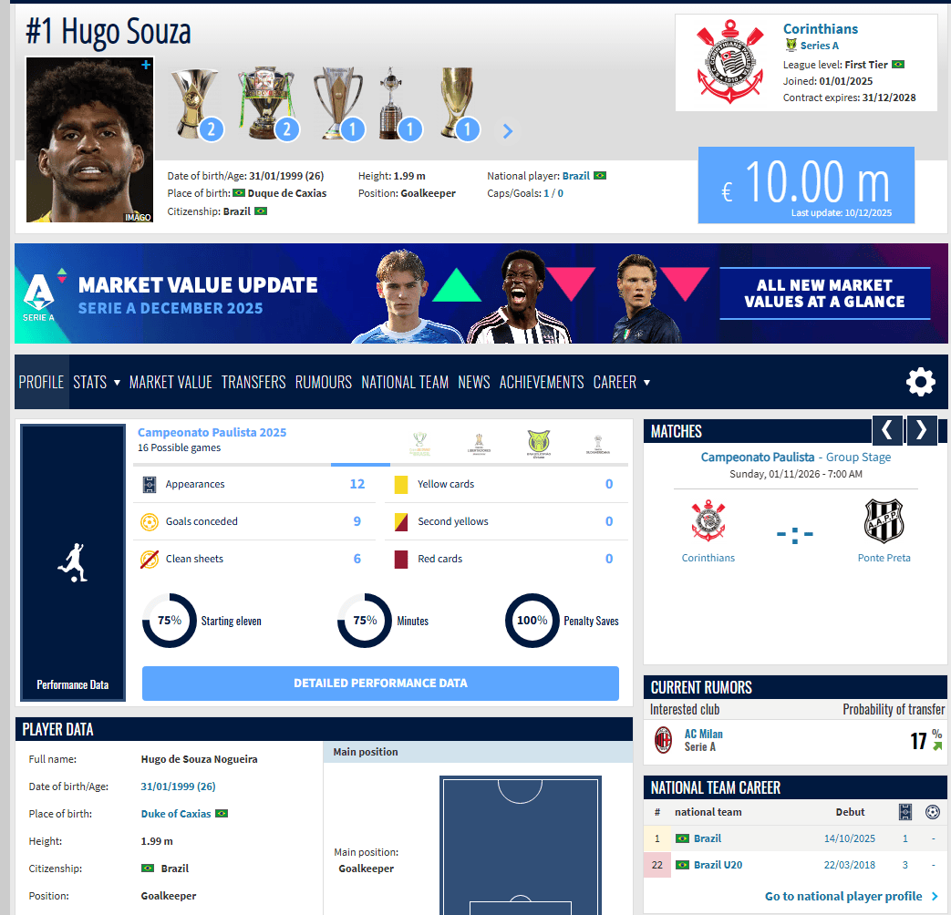 虎扑12月24日讯巴西环球体育记者VitorChicarolli的最新报道,科林蒂安拒绝了AC米兰对门将雨果-索萨的报价。