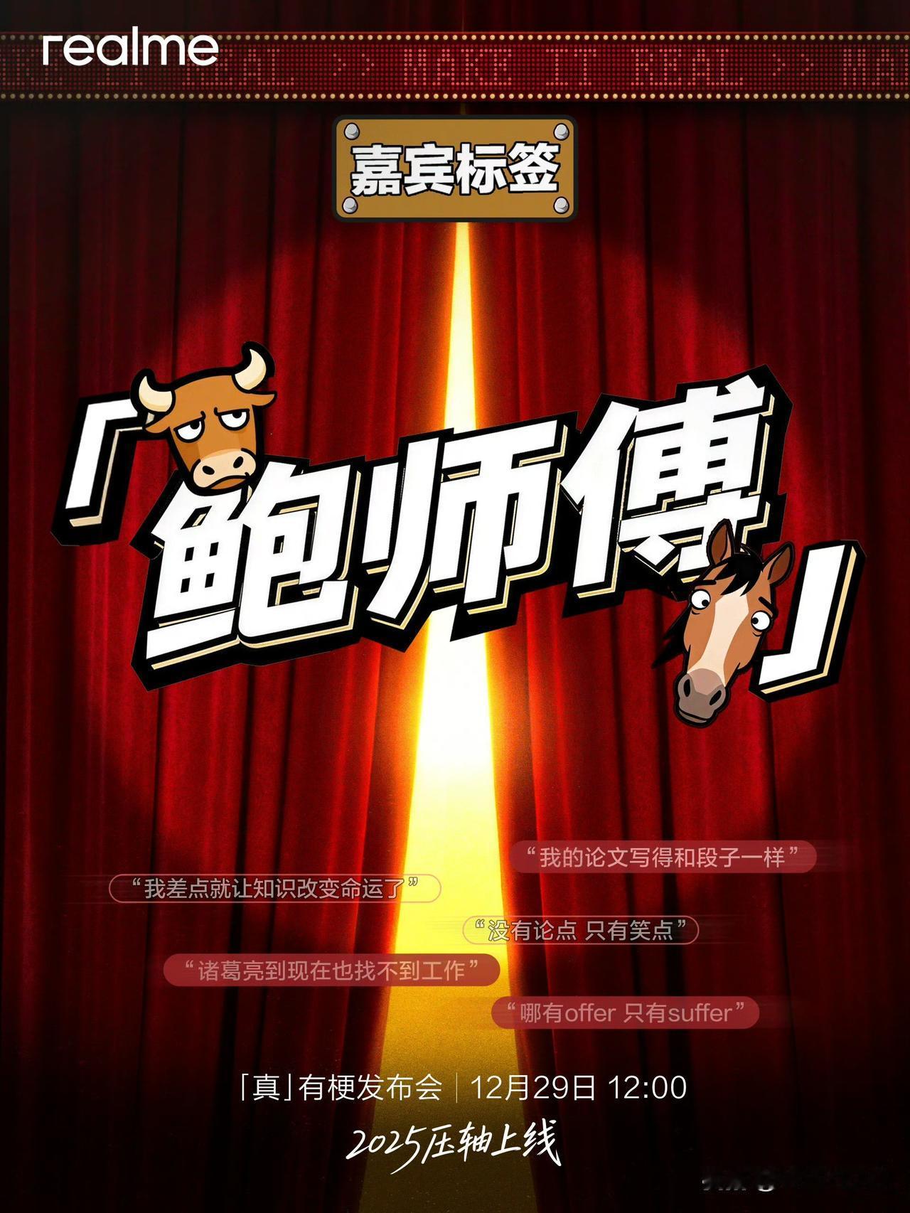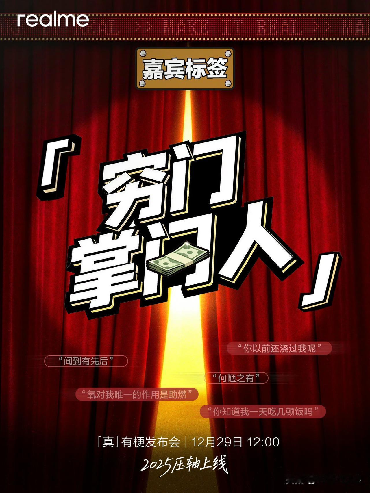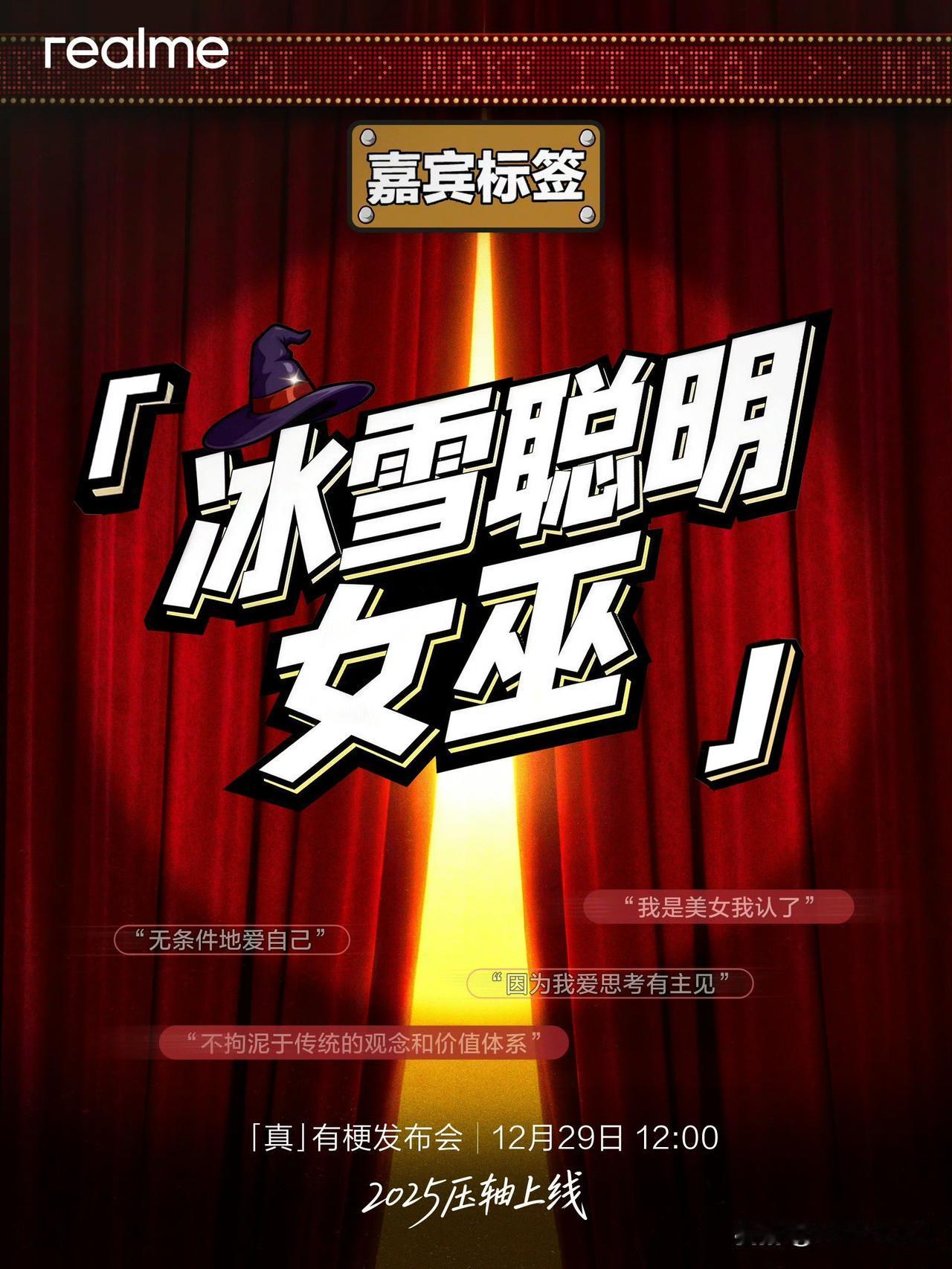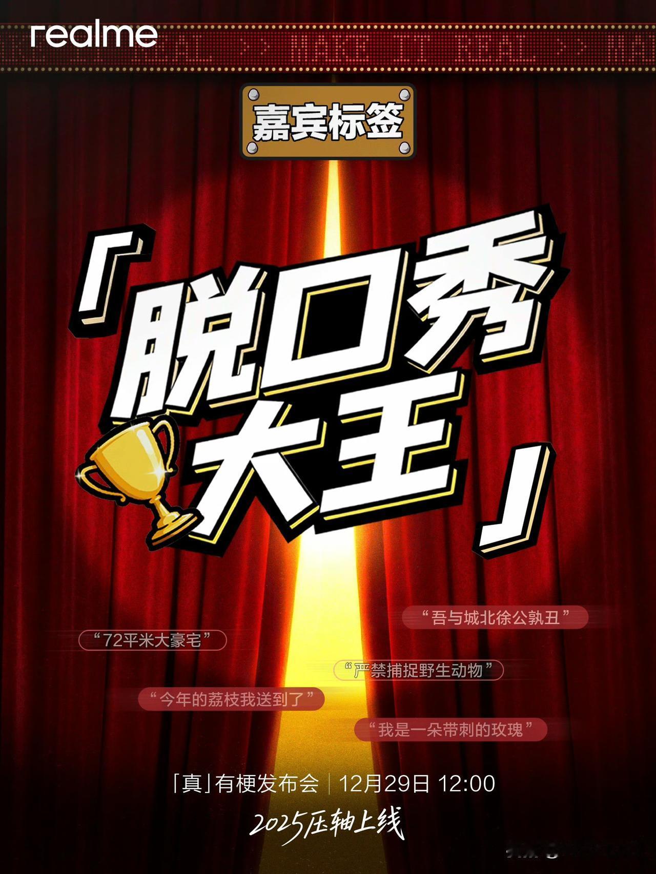 真我「真有梗」发布会 12 月 29 日 12:00 在腾讯视频独播。还是第一次见到跟平台独播的发布会,看发布会不会要腾讯视频 VIP 吧?[笑哭] 发布会嘉宾有何广智、王小利、李文、小四爷,产品不会是前段时间海外发布的真我 16 Pro 系列吧?[思考]