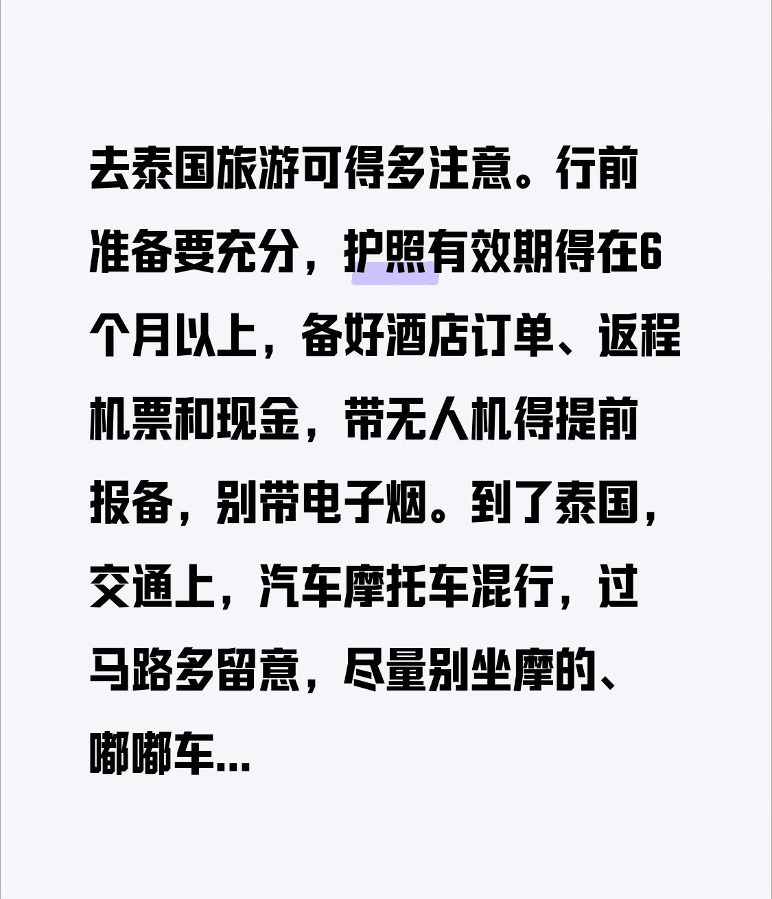 去泰国旅游可得多注意。行前准备要充分,护照有效期得在6个月以上,备好酒店订单、返程机票和现金,带无人机得提前报备,别带电子烟。 到了泰国,交通上,汽车摩托车混行,过马路多留意,尽量别坐摩的、嘟嘟车,自驾得有国际或本地驾照。涉水项目要重视,按指导穿救生衣,别抓海洋生物、踩珊瑚。 参与活动也有讲究,泼水时别向老人、孕妇等特殊人群泼,不用不卫生水源、热水、冰块,不用高压水枪。另外,去寺庙和王宫穿着别太随意,别在公共场合谈论王室,坐嘟嘟车先谈好价格,不然很容易踩坑。