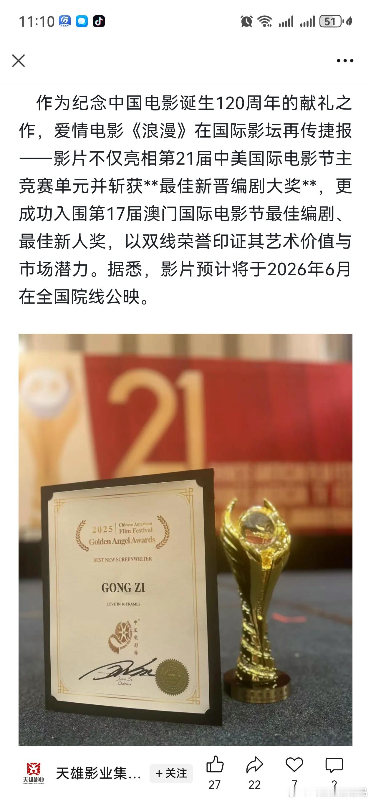 吴施乐和黄俊捷主演的电影《浪漫》在中美国际电影节拿了最佳新晋编剧大奖,还入围了第17届澳门国际电影节最佳编剧、最佳新人奖。恭喜恭喜!这两个人都被iejj撕过好多次呢