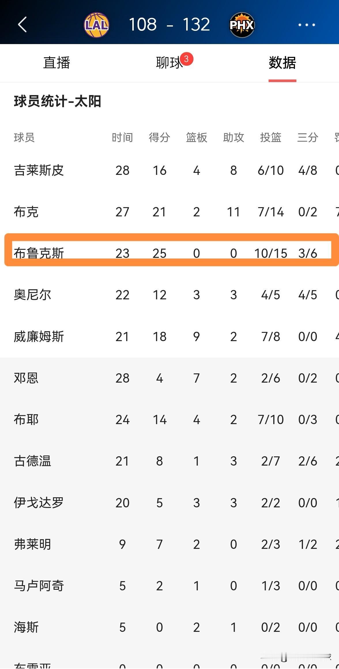 太阳大将狄龙-布鲁克斯真是强队的克星!在今天太阳主场以132:108大胜湖人的比