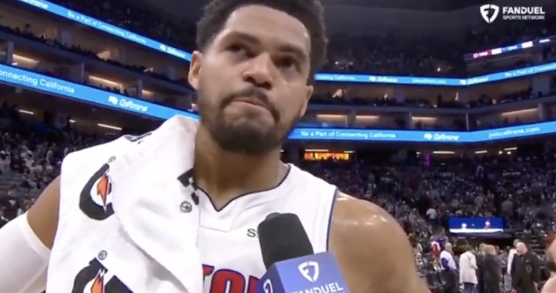 在中场休息时活塞球员托拜厄斯-哈里斯接受了记者采访。