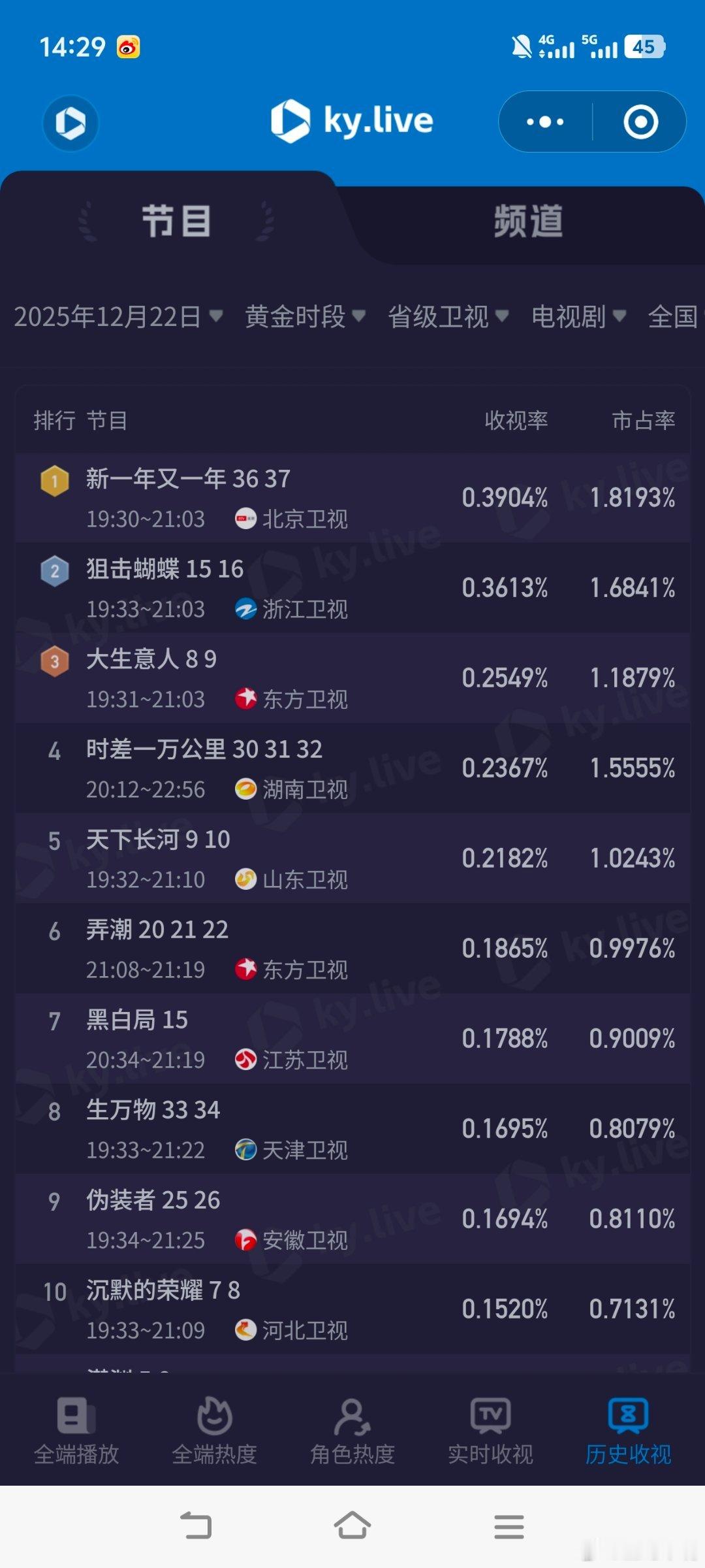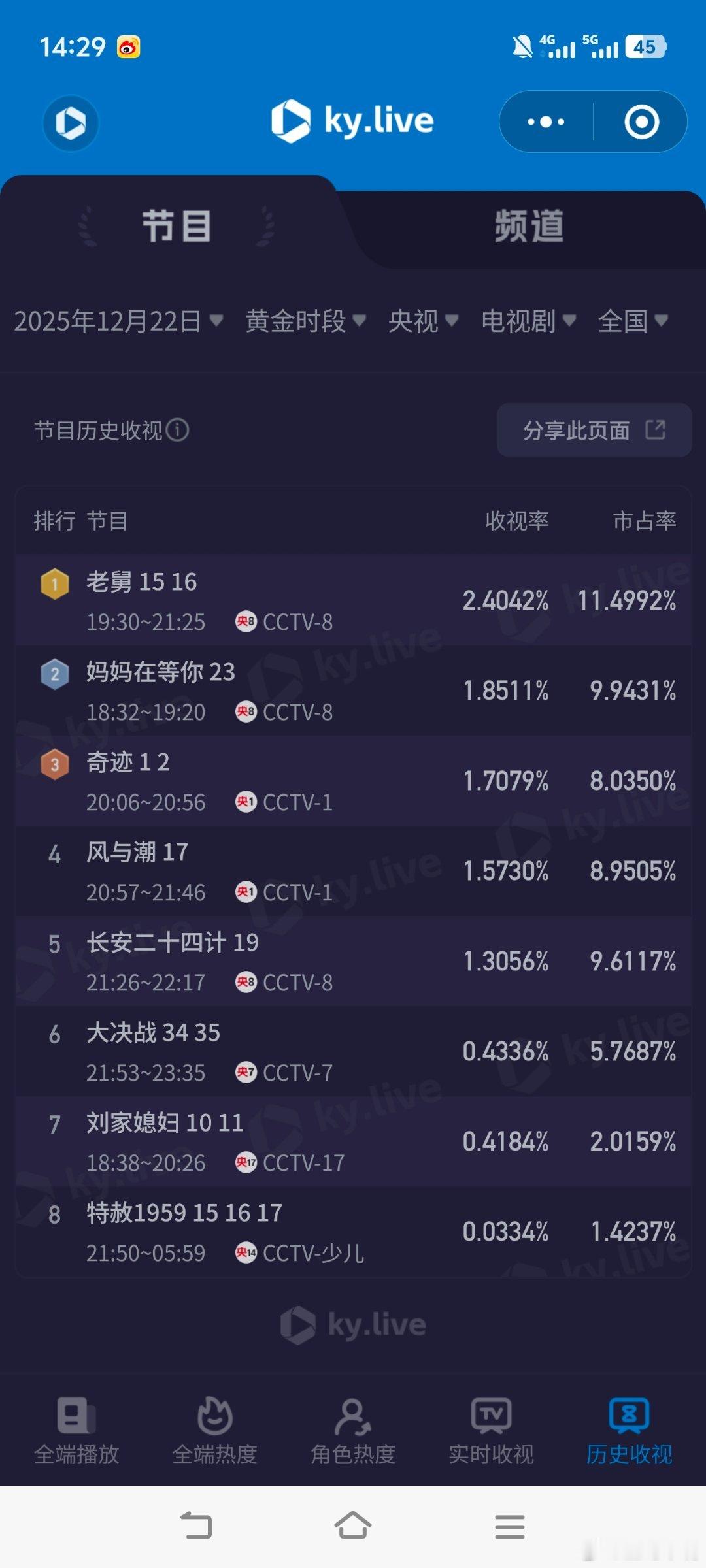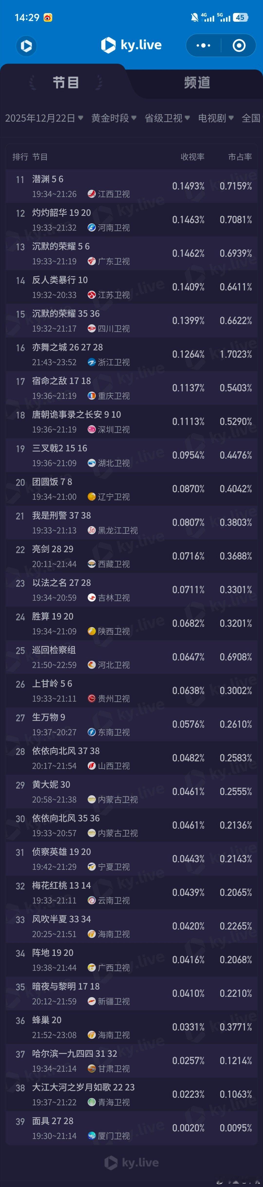 12月22日周一cvb收视日报(《奇迹》未被统计)风与潮2.932,酷云1.5730,系数1.864老舅 2.063,酷云2.4042,系数0.858新一年又一年0.385,酷云0.3904,系数0.986狙击蝴蝶0.377,酷云0.3613,系数1.043