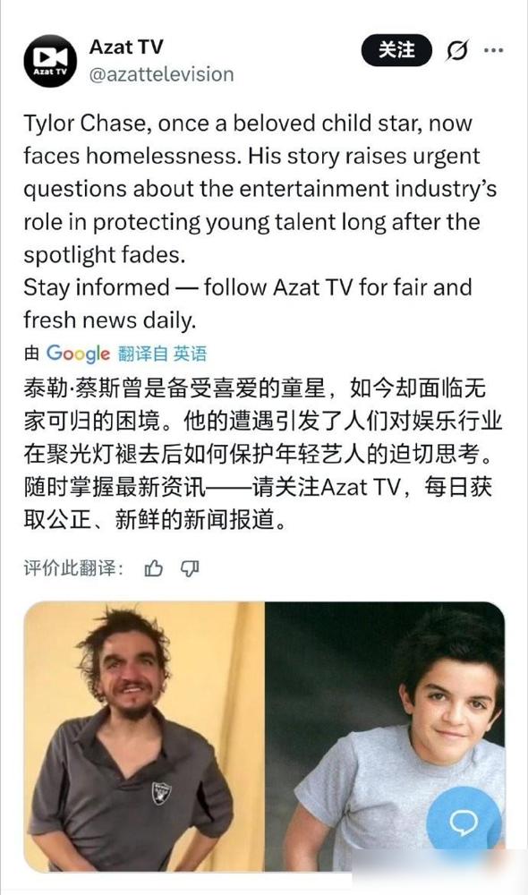 昔日童星沦落街头,美国“斩杀线”从不“区别对待”。最近刷到前童星泰勒·蔡斯的视频,真让人揪心。36岁的他曾在《尼德的校园生存指南》里灵气十足,现在却蹲在洛杉矶街头,头发乱得像草堆,裤子大得要攥着才不掉,眼神空洞得像没了光。他妈妈说他有双相情感障碍,治病花钱像流水,慢慢就撑不住了。就算有人凑了1200美元,可这点钱连个响都听不着,最后还是得流浪。 美国这“斩杀线”太狠了。一场病、一次车祸就能把人推进深渊——付不起房租被赶出去,没固定住所找不着工作,信用还黑了,谁愿意雇你?想领救济?今天城东发,明天城西发,大冷天的跑断腿。夏天还好,冬天零下的时候,流浪汉成批成批地走。听说有的遗体被同伴卖了换钱,救济品也换酒喝,围着火桶凑活一夜,第二天又有人没了。 以前总觉得美国多光鲜,现在看,再亮的星掉下去也是泥里滚。童星都扛不住,更别说外卖员、修车工这些普通人了。所谓“机会之国”,底下藏着条冰冷的“斩杀线”,把人当垃圾一样清出去。这哪是社会,简直是台绞肉机,转起来连昔日的星光都不留。 MCN双量进阶计划
