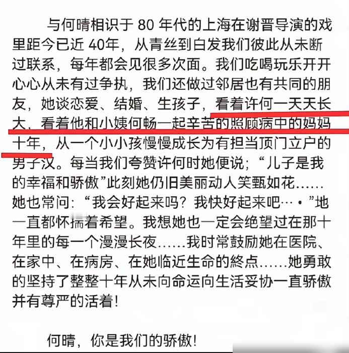 何晴40年好友发文悼念她, 文中她还透露何晴患癌10年以来, 她的儿子和妹妹一直陪伴在身边照顾她。 看到这里真的破防了。 十年抗癌路,对于一个家庭来说太不容易了。 何晴是谁?年轻的朋友可能不熟。 她是《水浒传》里的李师师,也是《红楼梦》里的秦可卿。 被誉为“古典第一美人”,演遍四大名著,独一无二。 她生病的时候,儿子才14岁。 正是少年最贪玩、最需要妈妈照顾的年纪。 可这个孩子,却用整个青春陪伴母亲对抗病魔。 十年啊。 一个孩子从初中到大学毕业的关键十年。 他没有抱怨,没有逃避,默默扛起了这份责任。 这背后是怎样的母子情深? 何晴生前低调,很少拿病情炒作。 她的家人也一直默默守护,直到她离开后,好友才透露这些细节。 在娱乐圈这个名利场里。 多少家庭纠纷、母子反目的戏码天天上演。 何晴和儿子的故事,像一股清流。 这不是戏,是真实的人生。 没有剧本,没有NG,每一天都是硬仗。 孩子用行动诠释了什么是孝顺,什么是担当。 想想现在有些孩子。 被全家捧在手心,稍有不顺就发脾气。 对比之下,何晴的儿子真是好样的。 他妈妈当然为他骄傲。 这份骄傲,比任何奖杯都沉重,都光荣。 这是一个母亲最大的慰藉。 病魔无情,但亲情有光。 这束光,照亮了十年艰难的岁月。 也让我们看到了娱乐圈里最朴实、最动人的一面。 人生无常,珍惜眼前人。 何晴走了,但她留下的这份母子真情。 永远值得记住。 这才是真正的正能量。 不靠炒作,不靠卖惨。 在沉默的坚守里,看见人性的光辉。 希望这个孩子以后一切都好。 他付出了太多,值得拥有幸福的未来。 这也是他妈妈最想看到的吧。 MCN双量进阶计划