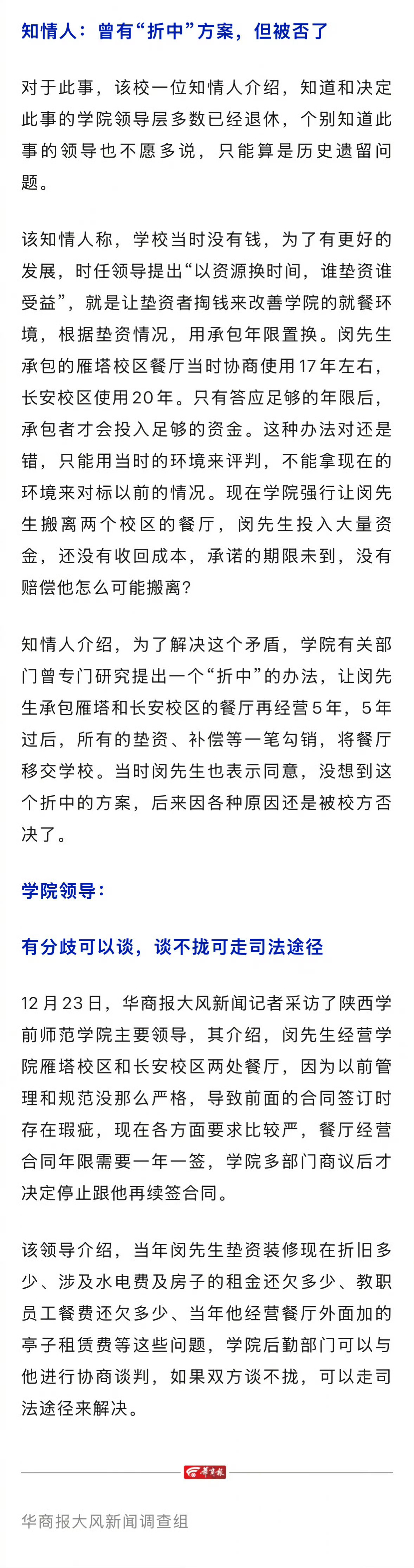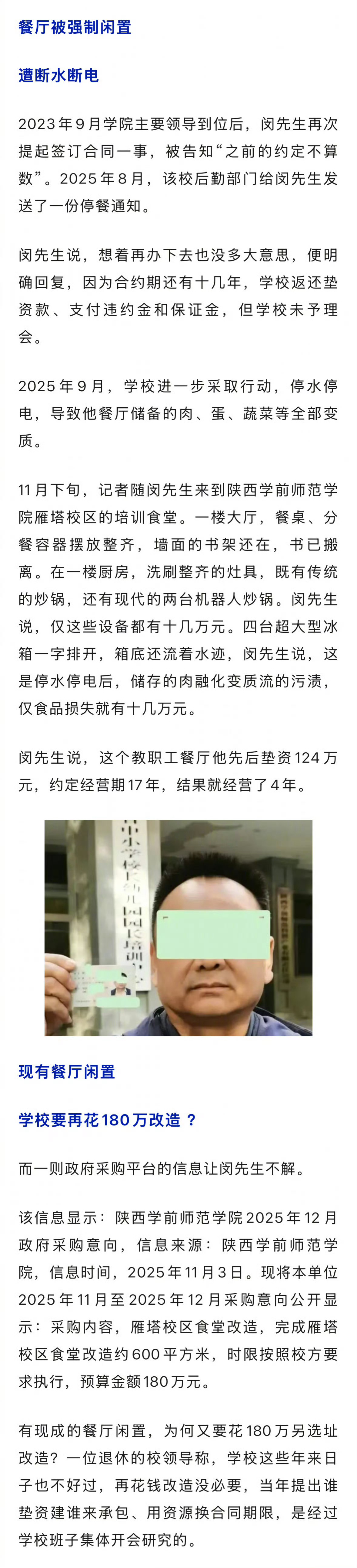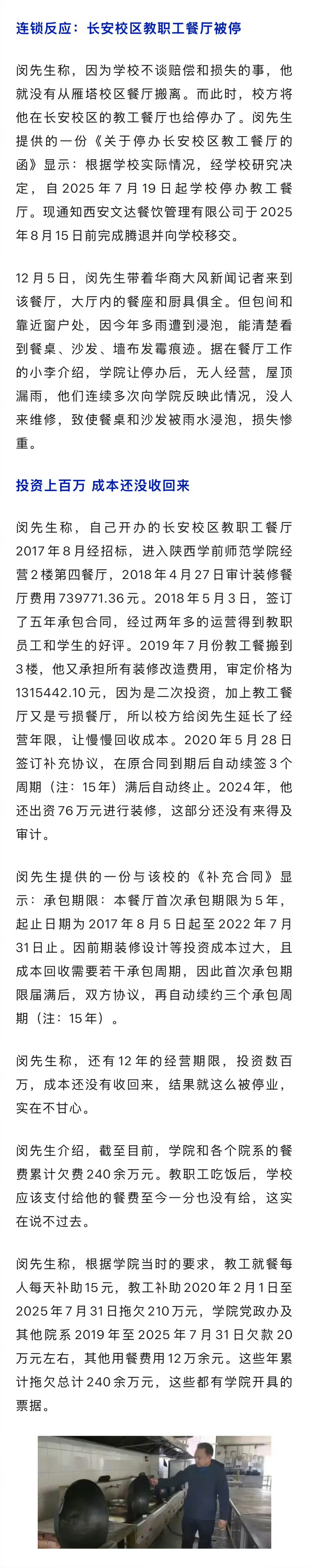 #垫资数百万承包高校餐厅被强制停业#【#校方回应合约没到期餐厅强制停业#:多部门商议决定不续签】闵先生承包陕西学前师范学院雁塔、长安两校区餐厅,因学校无资金改善餐厅,时任领导层开会决定采取“以资源换时间,谁垫资谁受益”的办法。闵先生称,自己累计垫资近四百万元装修两个餐厅,根据约定还有十几年承包期限,因学校主要领导更迭后,原来的合同被终止,断水、断电迫使搬离。另外,还有教职工两百多万元用餐费用至今未付。 12月23日,华商报大风新闻记者采访了陕西学前师范学院主要领导,其介绍,闵先生经营学院雁塔校区和长安校区两处餐厅,因为以前管理和规范没那么严格,导致前面的合同签订时存在瑕疵,现在各方面要求比较严,餐厅经营合同年限需要一年一签,学院多部门商议后才决定停止跟他再续签合同。 该领导介绍,当年闵先生垫资装修现在折旧多少、涉及水电费及房子的租金还欠多少、教职员工餐费还欠多少、当年他经营餐厅外面加的亭子租赁费等这些问题,学院后勤部门可以与他进行协商谈判,如果双方谈不拢,可以走司法途径来解决。 (华商报大风新闻)