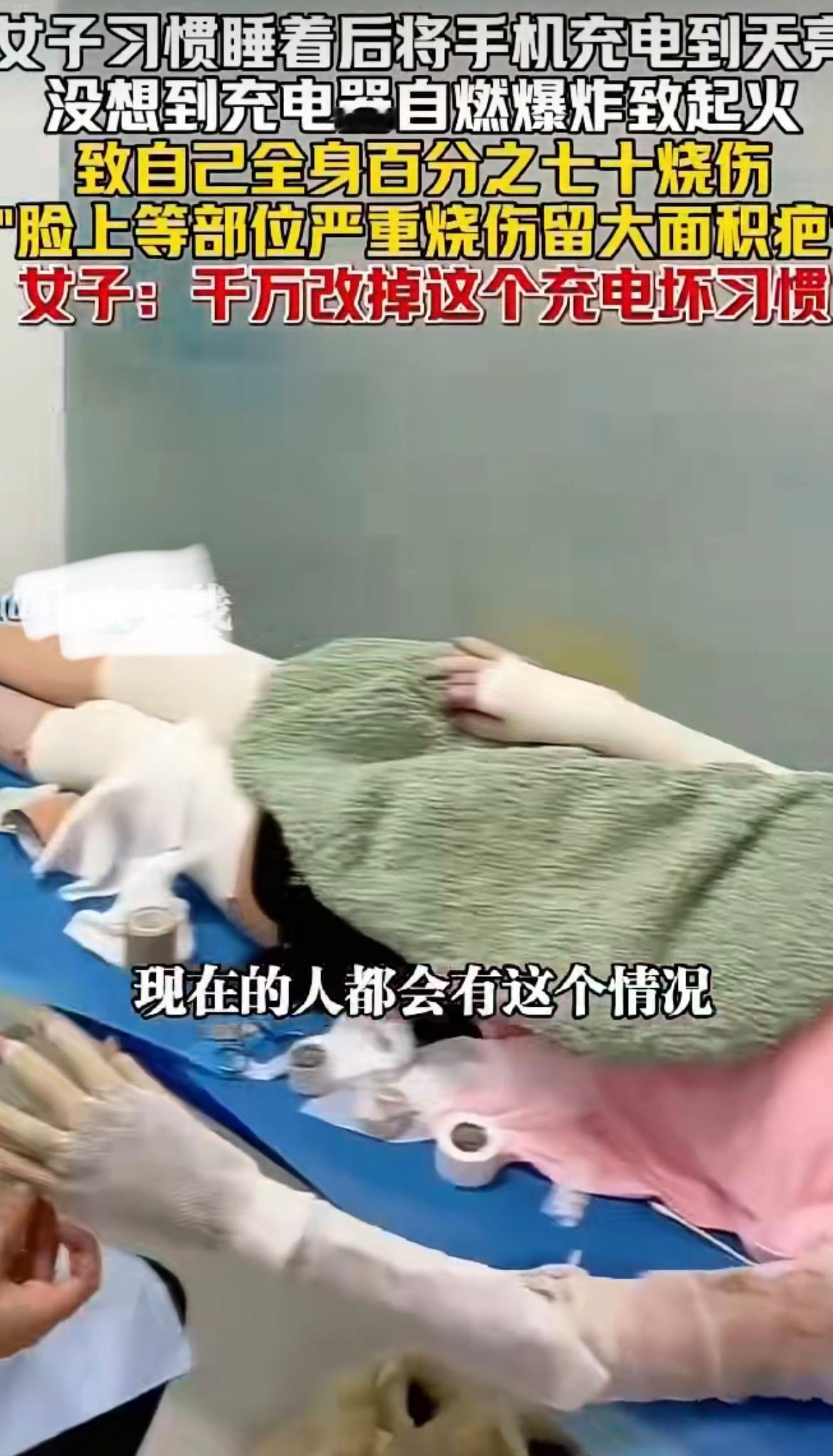 睡前彻夜充电等于埋雷!这个危险习惯8成人都有 湖北一女子睡前把手机放床头充电到天亮,劣质充电器突然自燃爆炸,她全身70%重度烧伤,留下永久疤痕。 别觉得这是小概率事件!劣质充电器15秒能飙到400℃,插排放床头、被褥堆旁边充电,散热差极易起火。就算是原装充电器,老化了、闷在可燃物旁也有风险。 血淋淋的教训提醒我们:安全从不是侥幸!改掉彻夜充电的坏习惯,别让图省事的念头,酿成无法挽回的悲剧!充电禁忌 手机充电器着火 充电误区