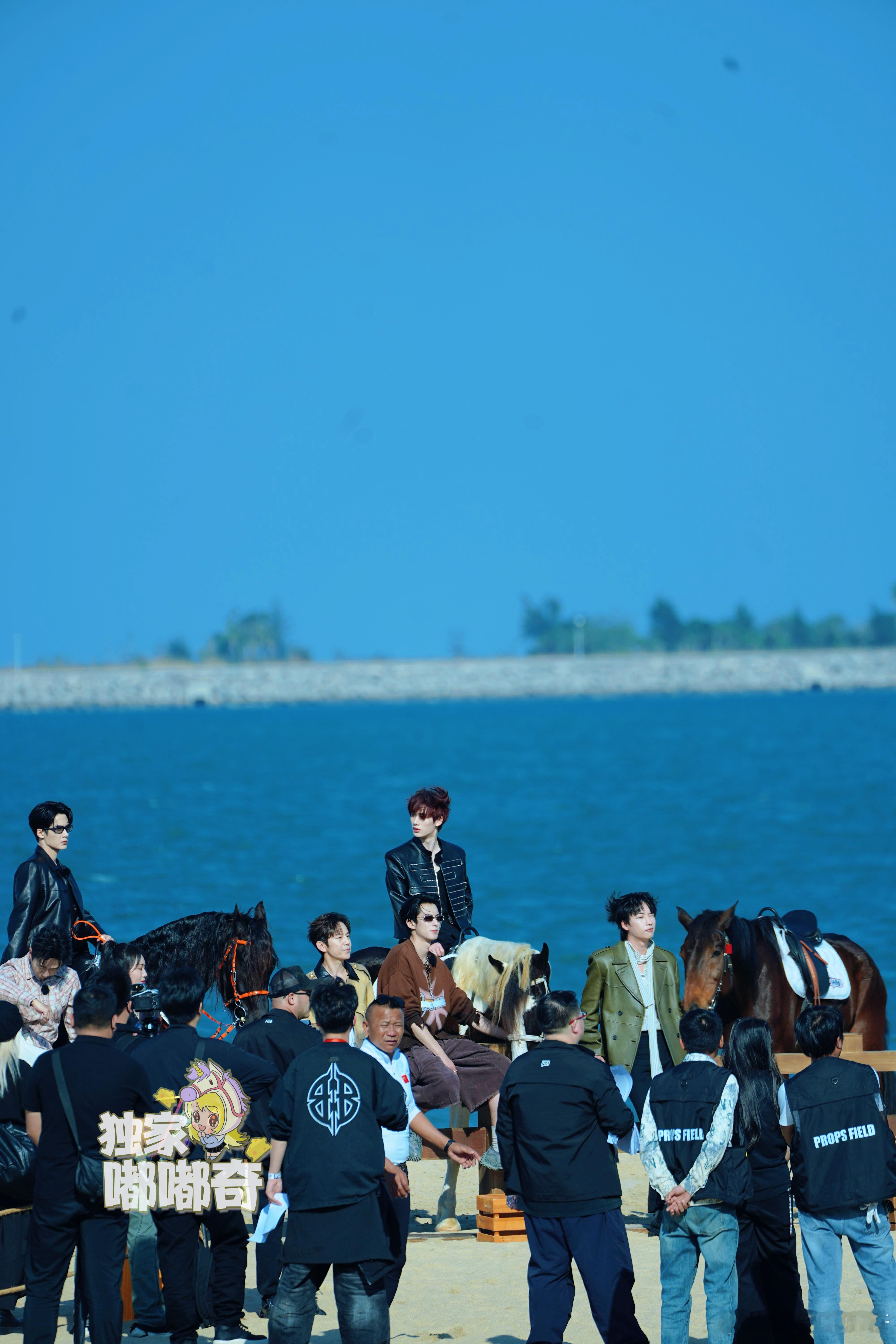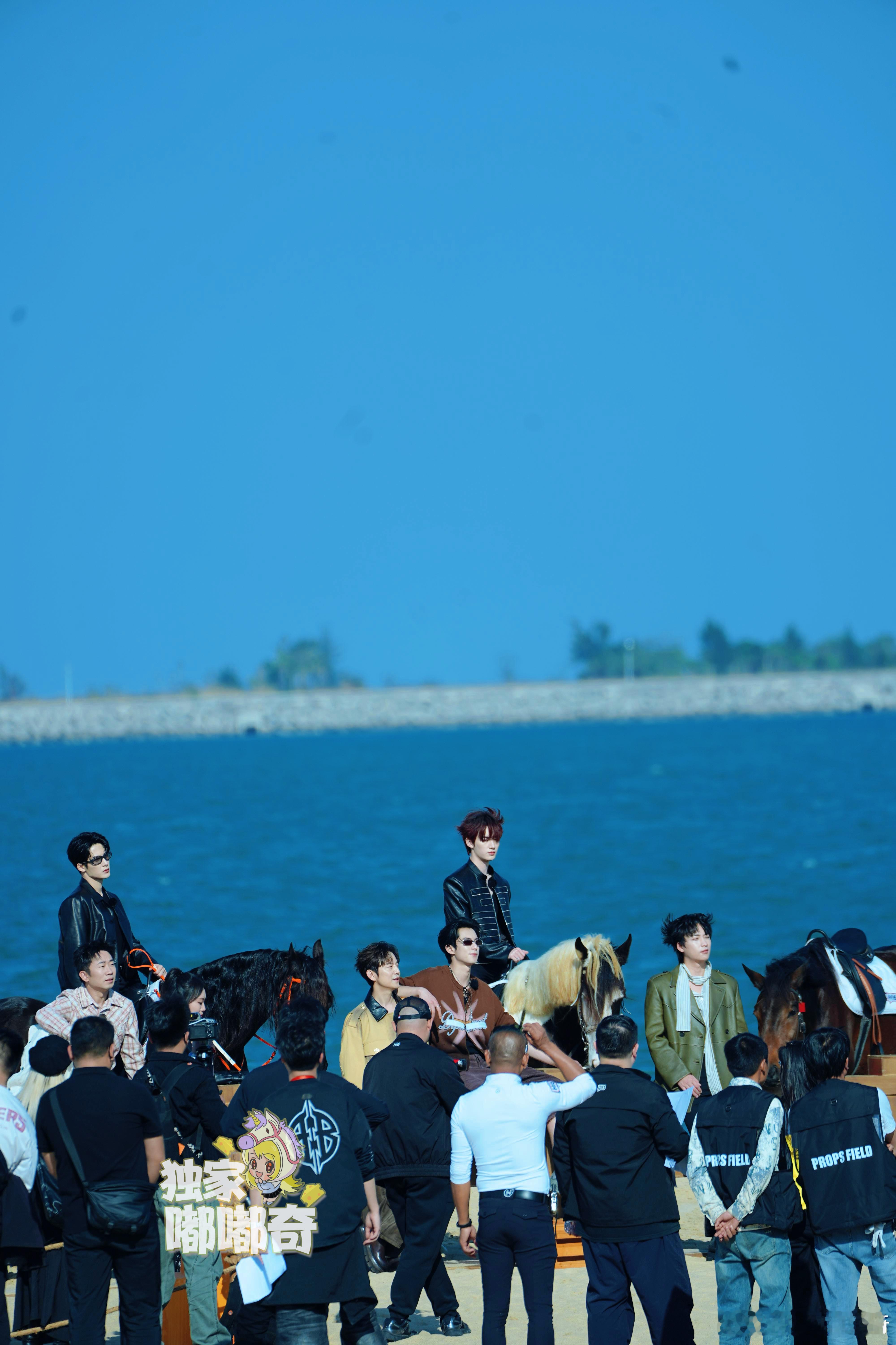 蓝海作背景,群像同框,骏马相陪衬檀健次王鹤棣丁程鑫你好星期六全员团建路透