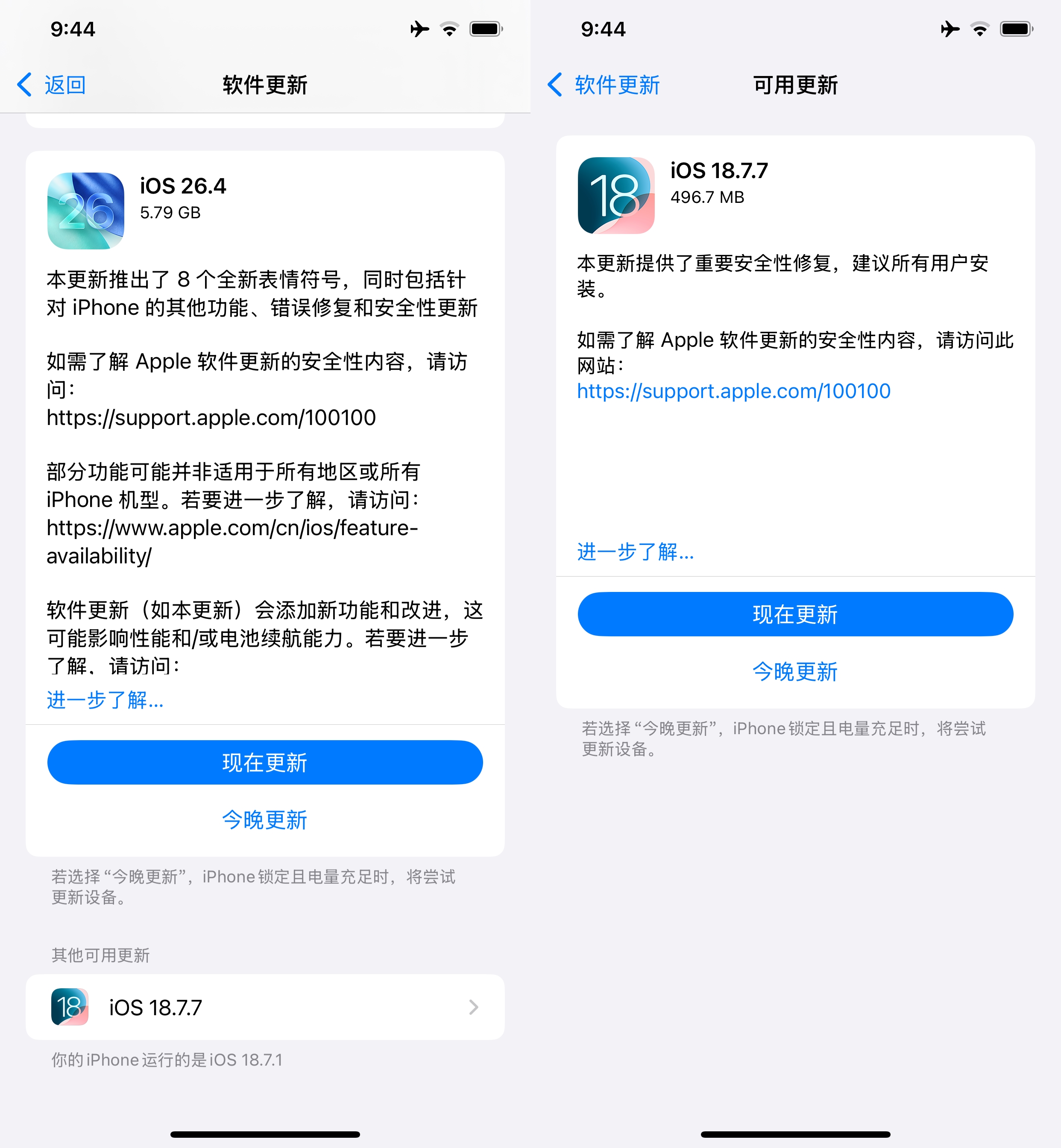 本周苹果还罕见地重新开放了 iOS 18 / iOS 26 双版本更新机制,让坚持停留 iOS 18 的用户可以在不升级 iOS 26 的情况下,通过升级 iOS 18.7.7 修补漏洞。