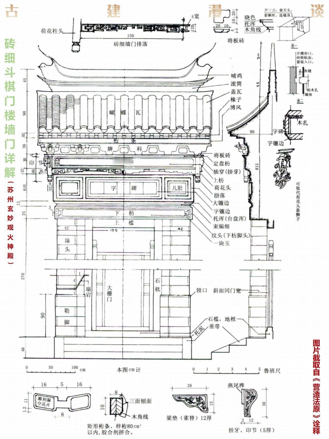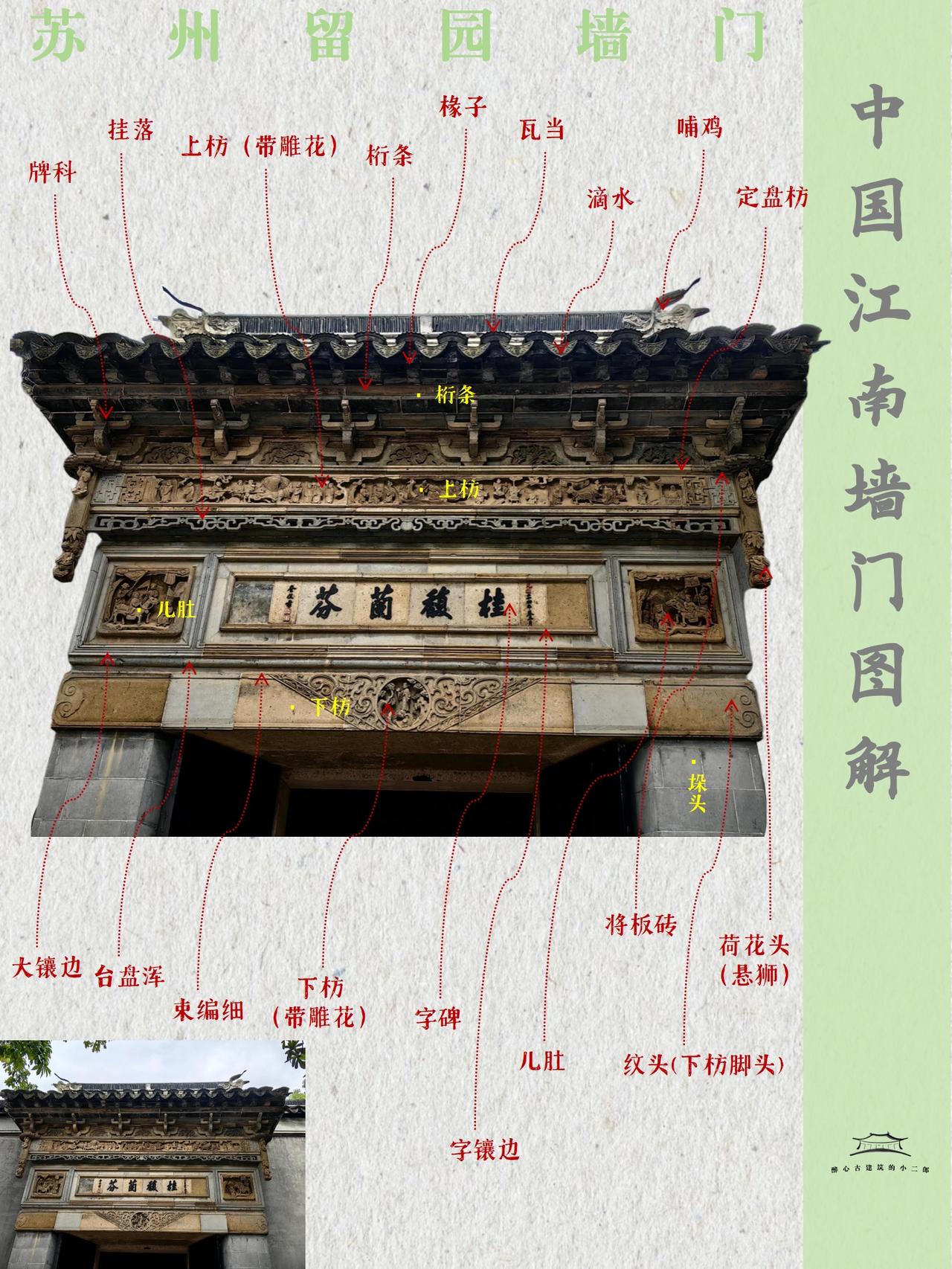 中国古建筑知识手册 | 《营造法原》中的墙门 江南建筑营造著作《营造法原》中有这样的记述——“凡门头上施数重砖砌之枋,或加牌科等装饰,上覆屋面者,称门楼或墙门,用于寺观之进门以及住宅每进塞口墙之间。门楼及墙门名称之分别,在两旁墙垣(塞口墙)街接之不同,其屋顶高出墙垣,耸然兀立者称门楼。两旁墙垣高出屋顶者,则称墙门。其做法完全相同。” 本篇就以举例图解的形式,来给大家分享江南地区墙门各部位的名称。 本文组要参考资料: 《营造法原》诠释——祝纪楠主编