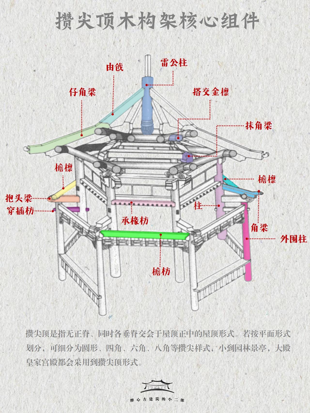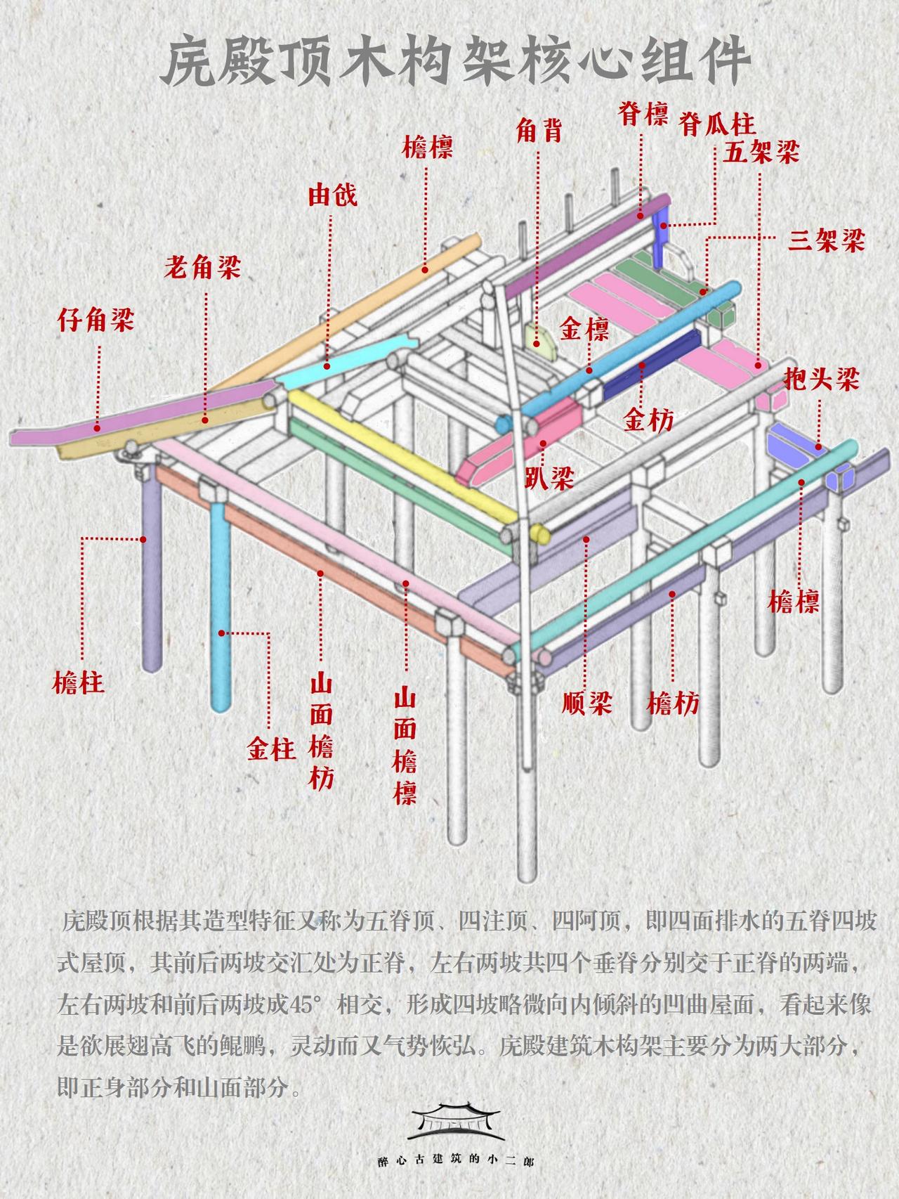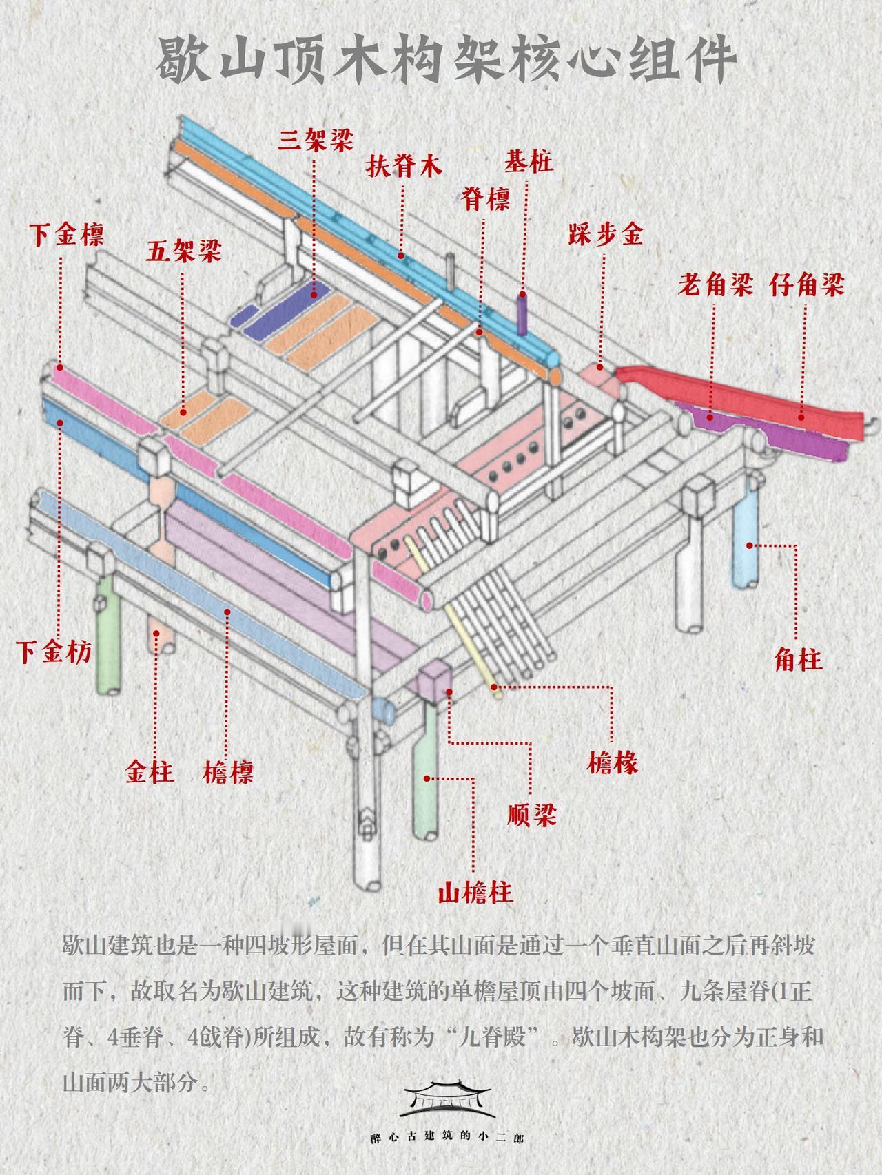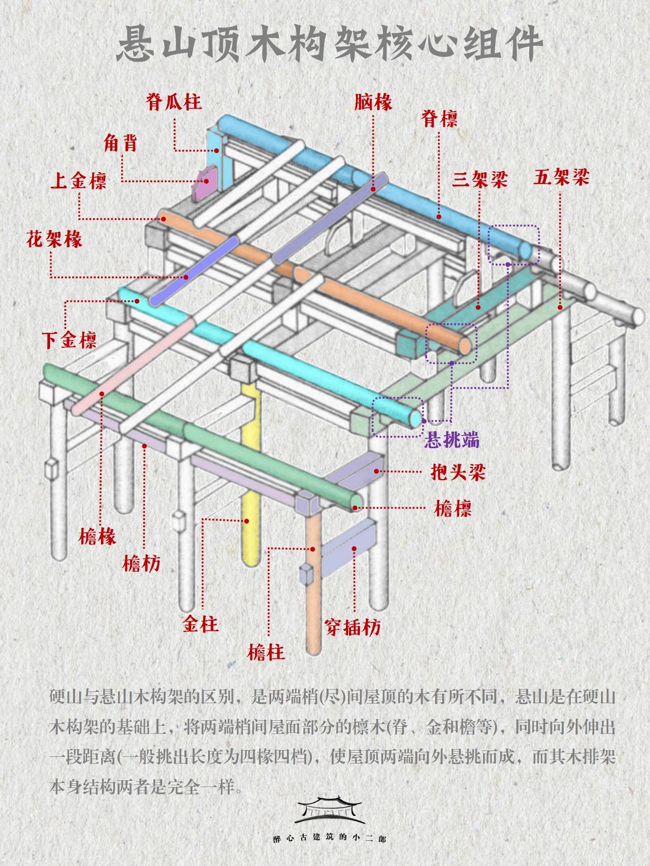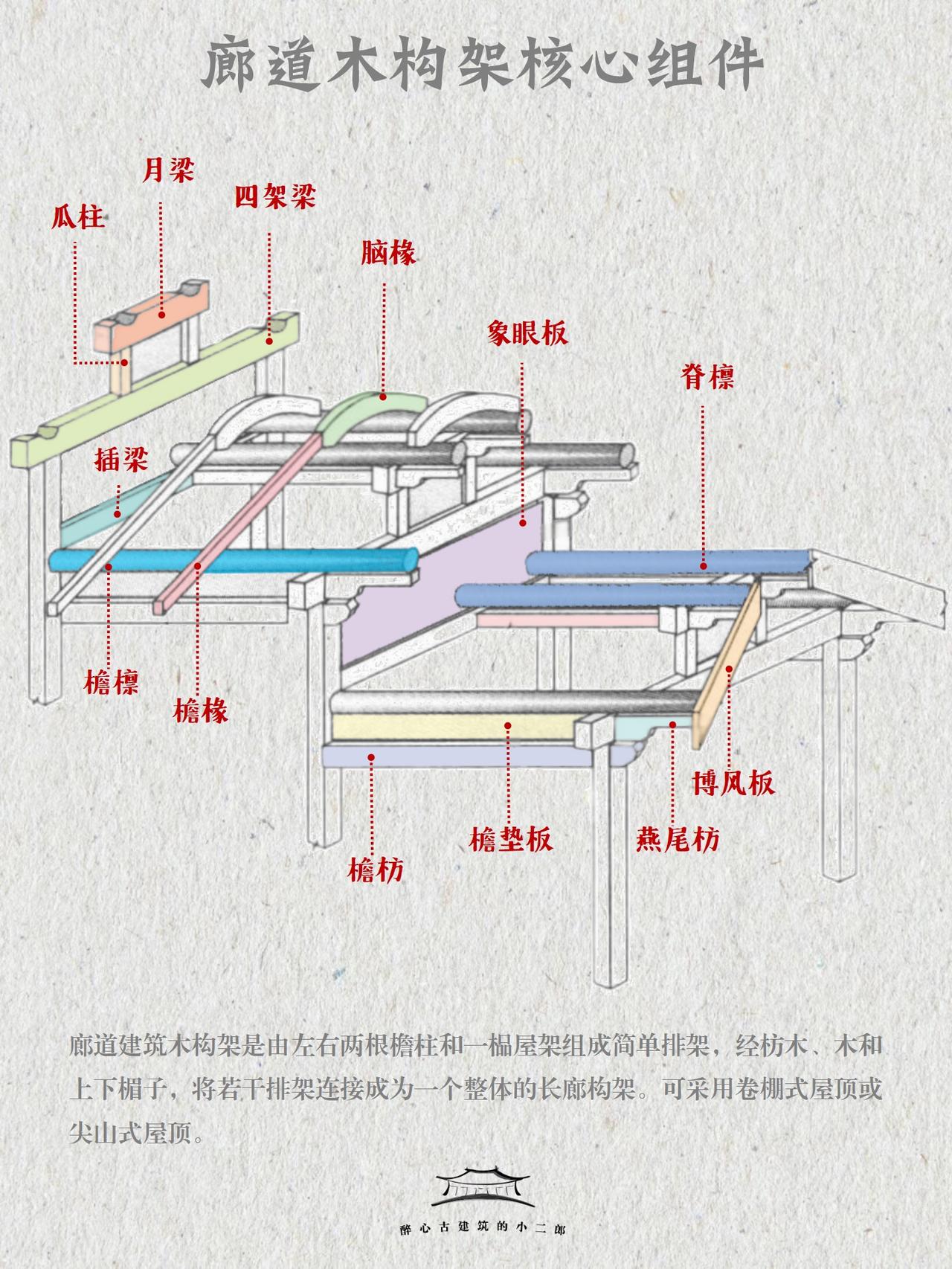 中国古建筑木构架核心组件图示 中国古建中的木构架是指支撑房屋建筑的基本木骨架,其由柱、梁、桁、枋、椽、板等各类木构件组合而成。 中国古建筑的木构架,根据建筑外观形式,可主要细分为:硬山建筑木构架、悬山建筑木构架、庑殿建筑木构架、歇山建筑木构架、攒尖建筑木构架、廊道建筑木构架等。 他们之间既有相同之处,也有构造上的差异。 本篇就和大家分享各类中国古建筑木构架的核心组件,组件名称为明清时期称呼。