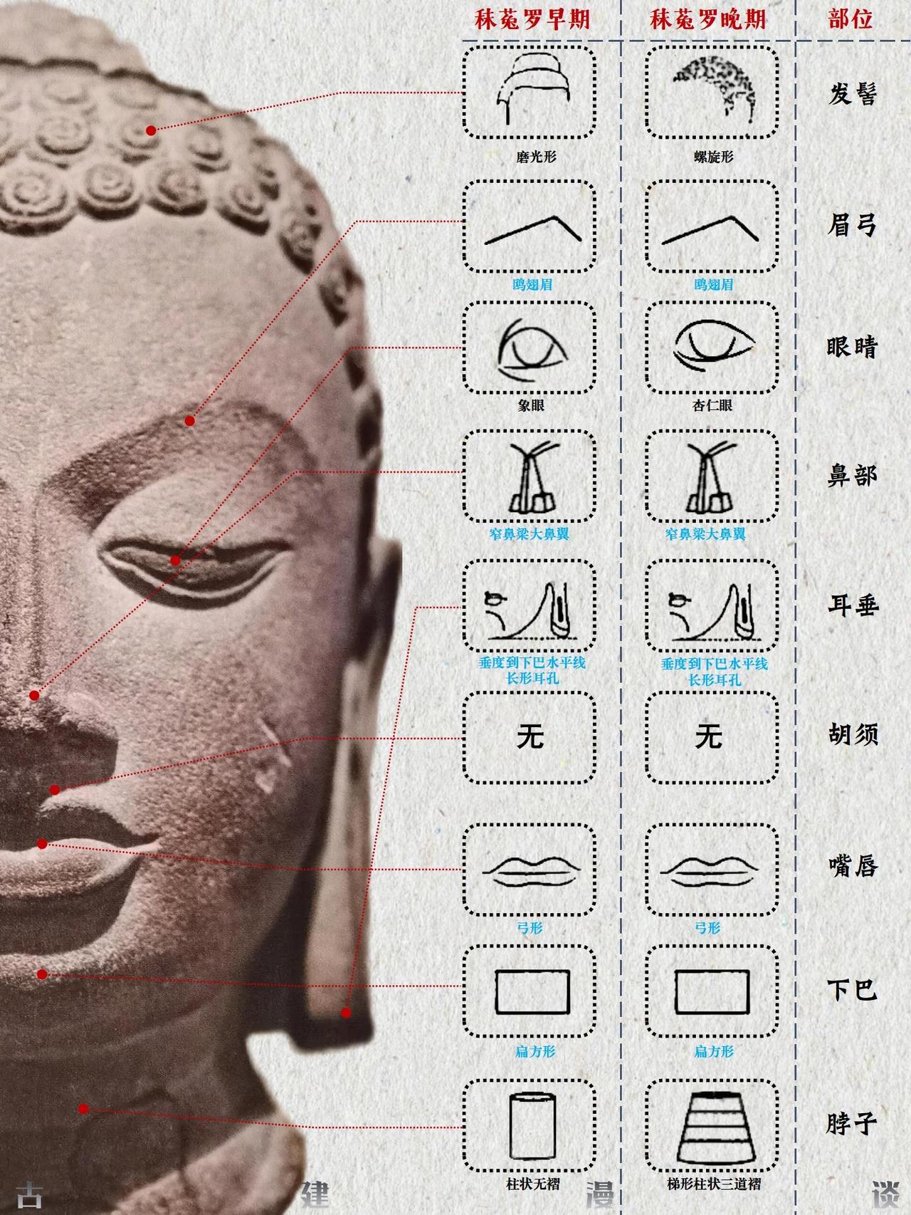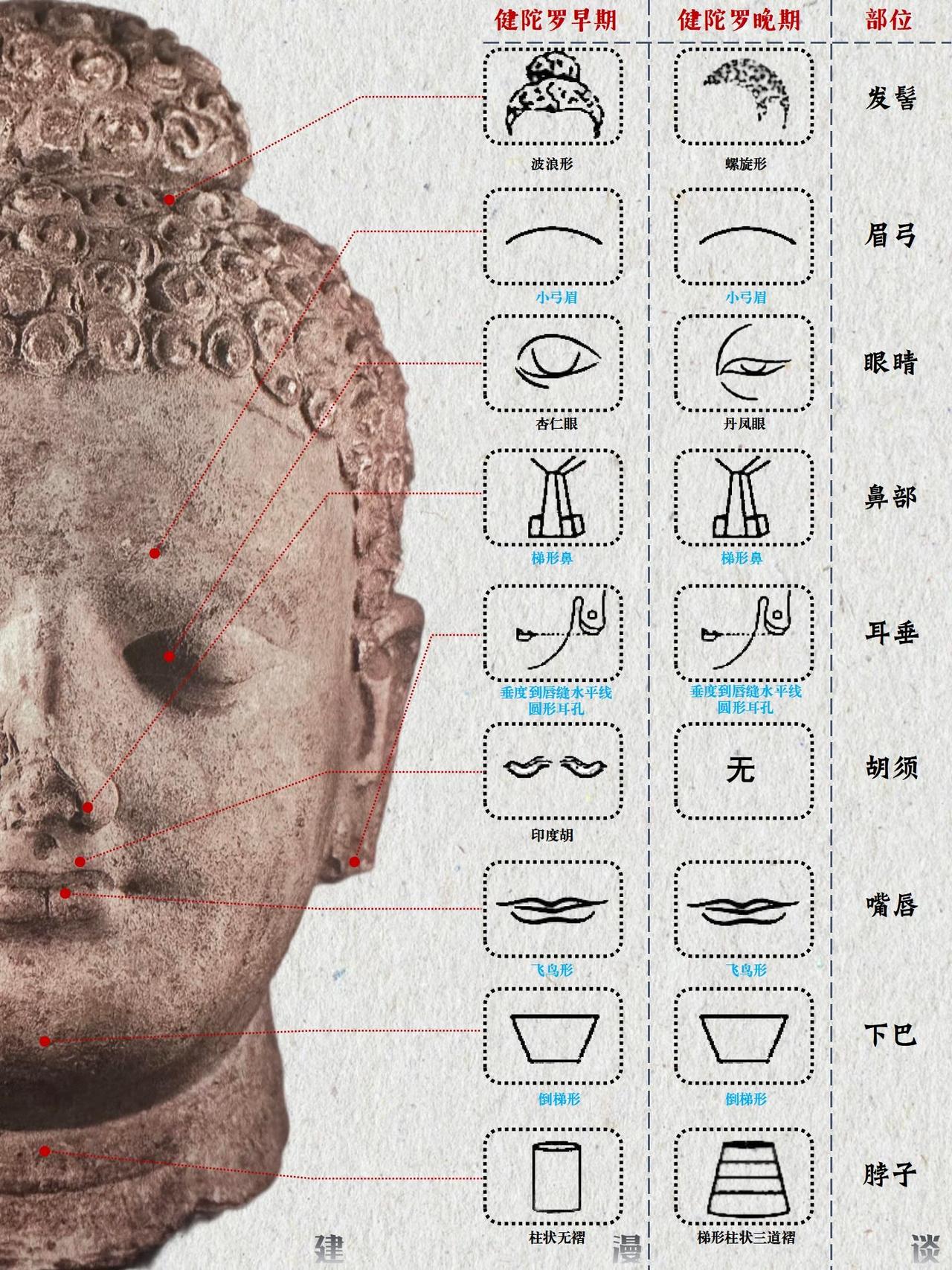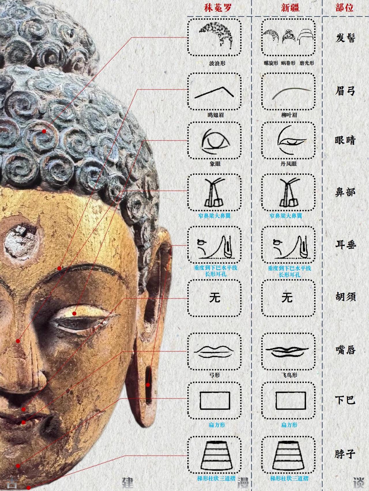 佛头特征演变图解 佛头特征的演变历程,是佛教艺术自希腊化时代起源,经中亚沿丝绸之路东传,并最终在中国文化土壤中完成本土化与创新的生动缩影。这一过程跨越千年,融合了多元文明的审美趣味与宗教理念。 🌏 源起与东渐:从希腊化影响到西域初现 佛教最初并无偶像崇拜,直至公元1世纪左右,在深受希腊文化影响的古印度犍陀罗地区,才出现了最早的人形佛像。这些早期佛像具有显著的希腊化特征;约在2至3世纪,印度中部的秣菟罗地区也发展了自身的造像风格。早期的秣菟罗佛像更具印度本土特色,常为直发盘成高髻或螺发,脸型饱满圆润,面带笑容,身躯粗壮有力。至笈多王朝时期(约4-5世纪),秣菟罗艺术与犍陀罗风格融合,形成了古典的笈多风格,佛像多为螺发,眼帘低垂,表情内省,衣薄贴体,称为“湿衣佛像”。 随着佛教东传,大约在公元3至5世纪,这种融合了希腊、波斯、印度元素的佛教造像艺术经丝绸之路进入中国新疆地区。在龟兹、于阗等地开凿的早期石窟中,佛像仍较多保留了犍陀罗的面相特征,如高鼻深目。继续东传至河西走廊,造像开始发生初步变化。虽然一些外来特征得以保留,但当地的工匠已开始有意识地进行局部改造,佛像的面部线条逐渐趋于柔和,展现出汉地审美影响的端倪。 🏯 融合与创新:北朝至隋唐的中国化历程 佛教造像艺术传入中原内地后,进入了深度汉化与风格创新的时期。北朝时期,特别是北魏,是佛头特征中国化的重要阶段。北魏早期佛像仍带有犍陀罗遗风,但已融入鲜卑人特征,脸型威武,眼睛睁大,肉髻高耸。至北魏中晚期,在孝文帝汉化政策的推动下,形成了独特的“秀骨清像”风格。佛像面容清瘦扁平,神态温文尔雅,大耳下垂,体现了中原士人的审美情趣。 隋唐时期是中国佛教造像完全本土化的鼎盛时期。强大的国力和高度的文化自信使得唐代佛头呈现出雄浑丰满、庄严大气的面貌。头部饱满,脸颊轮廓富有弹性,眉毛上扬,双唇小而紧闭,神态威严,一扫前朝的清秀与内省,体现了大唐盛世的豪迈气象。发式也更为多样包容,涡卷发、水波发、螺发、磨光发髻并存,且髻珠开始流行。 佛头特征的演变,清晰地勾勒出佛教艺术从异域风貌到华夏气象的转变轨迹,它不仅是对宗教教义的视觉诠释,更是古代世界不同文明沿丝绸之路交流、碰撞与融合的辉煌见证。 参考文献:《佛陀的容颜》——李惠东著