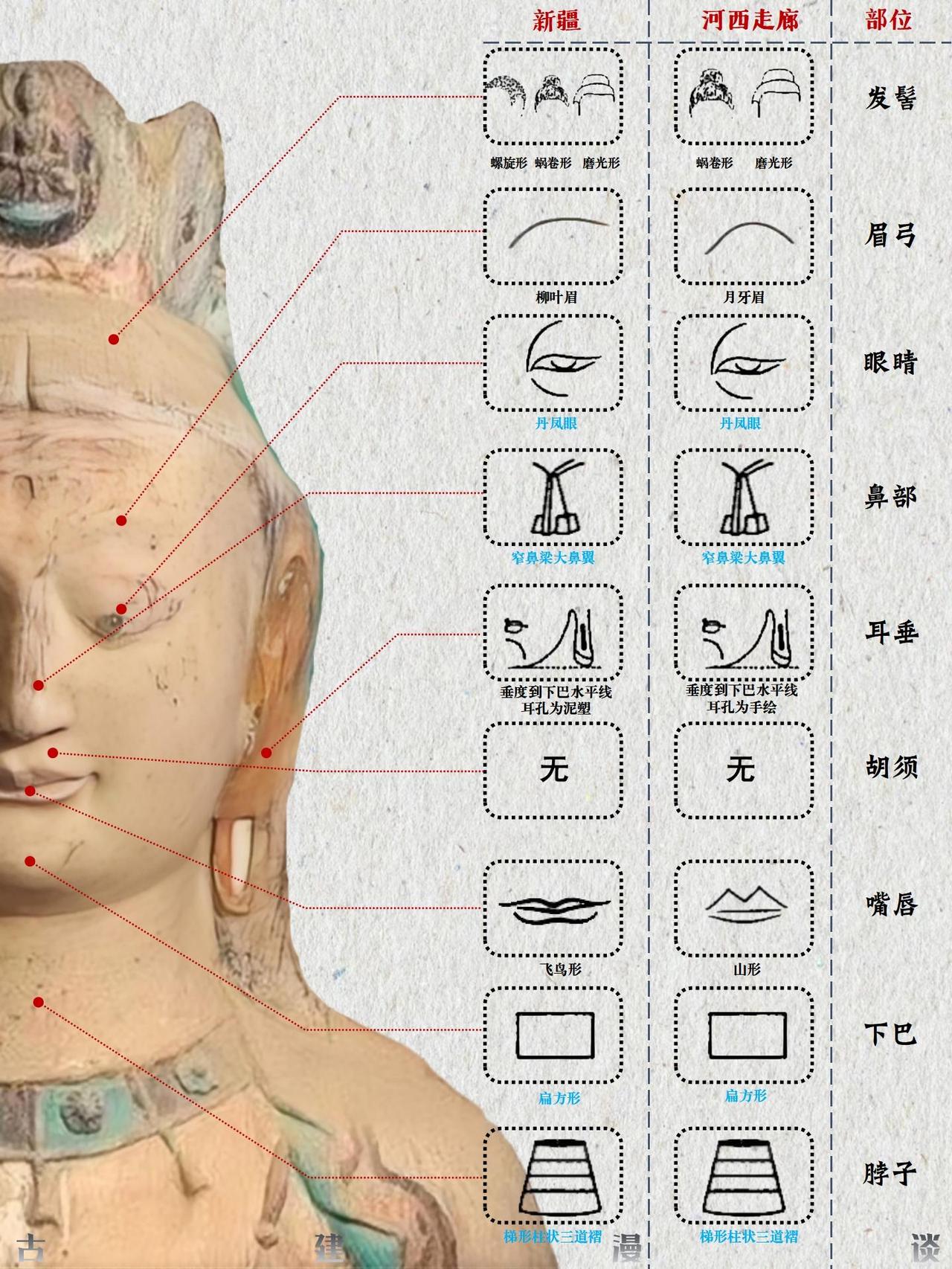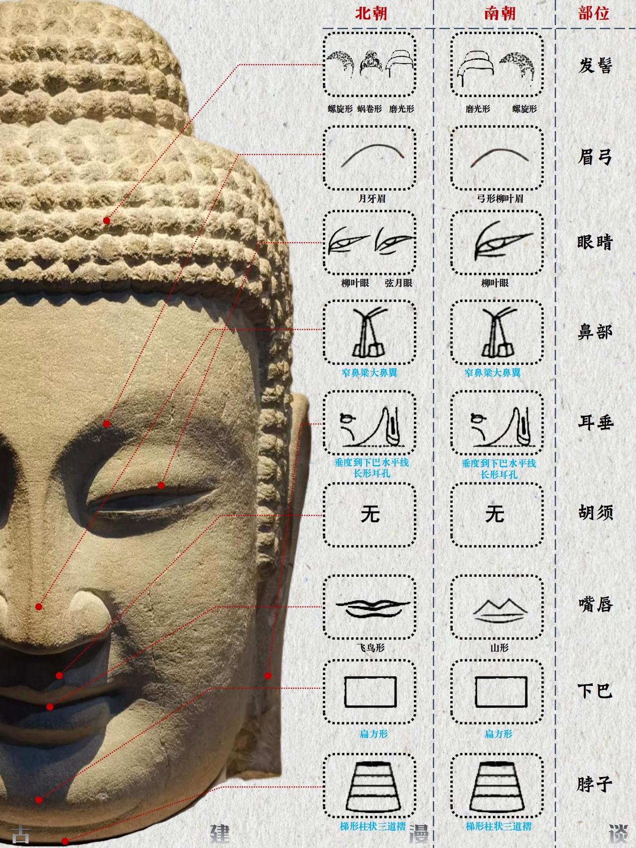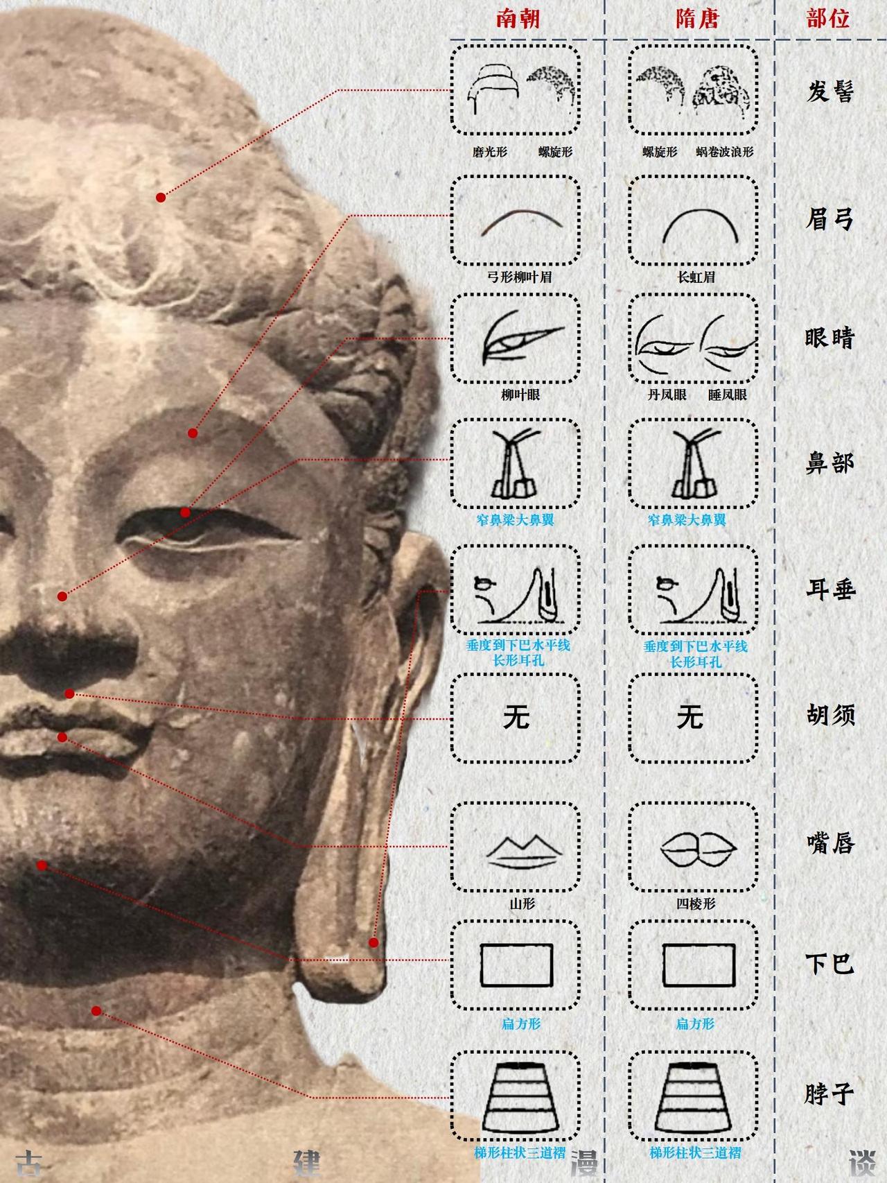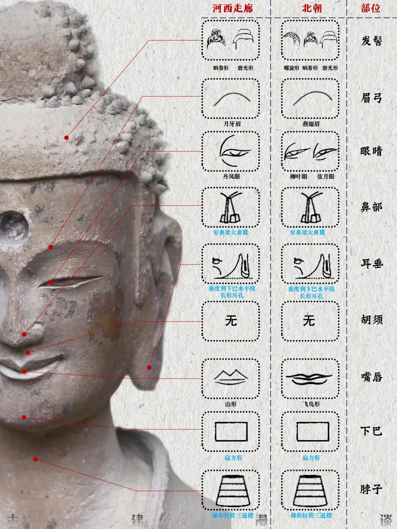 佛头特征演变图解 佛头特征的演变历程,是佛教艺术自希腊化时代起源,经中亚沿丝绸之路东传,并最终在中国文化土壤中完成本土化与创新的生动缩影。这一过程跨越千年,融合了多元文明的审美趣味与宗教理念。 🌏 源起与东渐:从希腊化影响到西域初现 佛教最初并无偶像崇拜,直至公元1世纪左右,在深受希腊文化影响的古印度犍陀罗地区,才出现了最早的人形佛像。这些早期佛像具有显著的希腊化特征;约在2至3世纪,印度中部的秣菟罗地区也发展了自身的造像风格。早期的秣菟罗佛像更具印度本土特色,常为直发盘成高髻或螺发,脸型饱满圆润,面带笑容,身躯粗壮有力。至笈多王朝时期(约4-5世纪),秣菟罗艺术与犍陀罗风格融合,形成了古典的笈多风格,佛像多为螺发,眼帘低垂,表情内省,衣薄贴体,称为“湿衣佛像”。 随着佛教东传,大约在公元3至5世纪,这种融合了希腊、波斯、印度元素的佛教造像艺术经丝绸之路进入中国新疆地区。在龟兹、于阗等地开凿的早期石窟中,佛像仍较多保留了犍陀罗的面相特征,如高鼻深目。继续东传至河西走廊,造像开始发生初步变化。虽然一些外来特征得以保留,但当地的工匠已开始有意识地进行局部改造,佛像的面部线条逐渐趋于柔和,展现出汉地审美影响的端倪。 🏯 融合与创新:北朝至隋唐的中国化历程 佛教造像艺术传入中原内地后,进入了深度汉化与风格创新的时期。北朝时期,特别是北魏,是佛头特征中国化的重要阶段。北魏早期佛像仍带有犍陀罗遗风,但已融入鲜卑人特征,脸型威武,眼睛睁大,肉髻高耸。至北魏中晚期,在孝文帝汉化政策的推动下,形成了独特的“秀骨清像”风格。佛像面容清瘦扁平,神态温文尔雅,大耳下垂,体现了中原士人的审美情趣。 隋唐时期是中国佛教造像完全本土化的鼎盛时期。强大的国力和高度的文化自信使得唐代佛头呈现出雄浑丰满、庄严大气的面貌。头部饱满,脸颊轮廓富有弹性,眉毛上扬,双唇小而紧闭,神态威严,一扫前朝的清秀与内省,体现了大唐盛世的豪迈气象。发式也更为多样包容,涡卷发、水波发、螺发、磨光发髻并存,且髻珠开始流行。 佛头特征的演变,清晰地勾勒出佛教艺术从异域风貌到华夏气象的转变轨迹,它不仅是对宗教教义的视觉诠释,更是古代世界不同文明沿丝绸之路交流、碰撞与融合的辉煌见证。 参考文献:《佛陀的容颜》——李惠东著