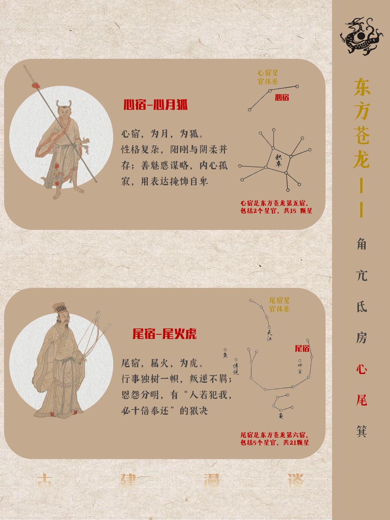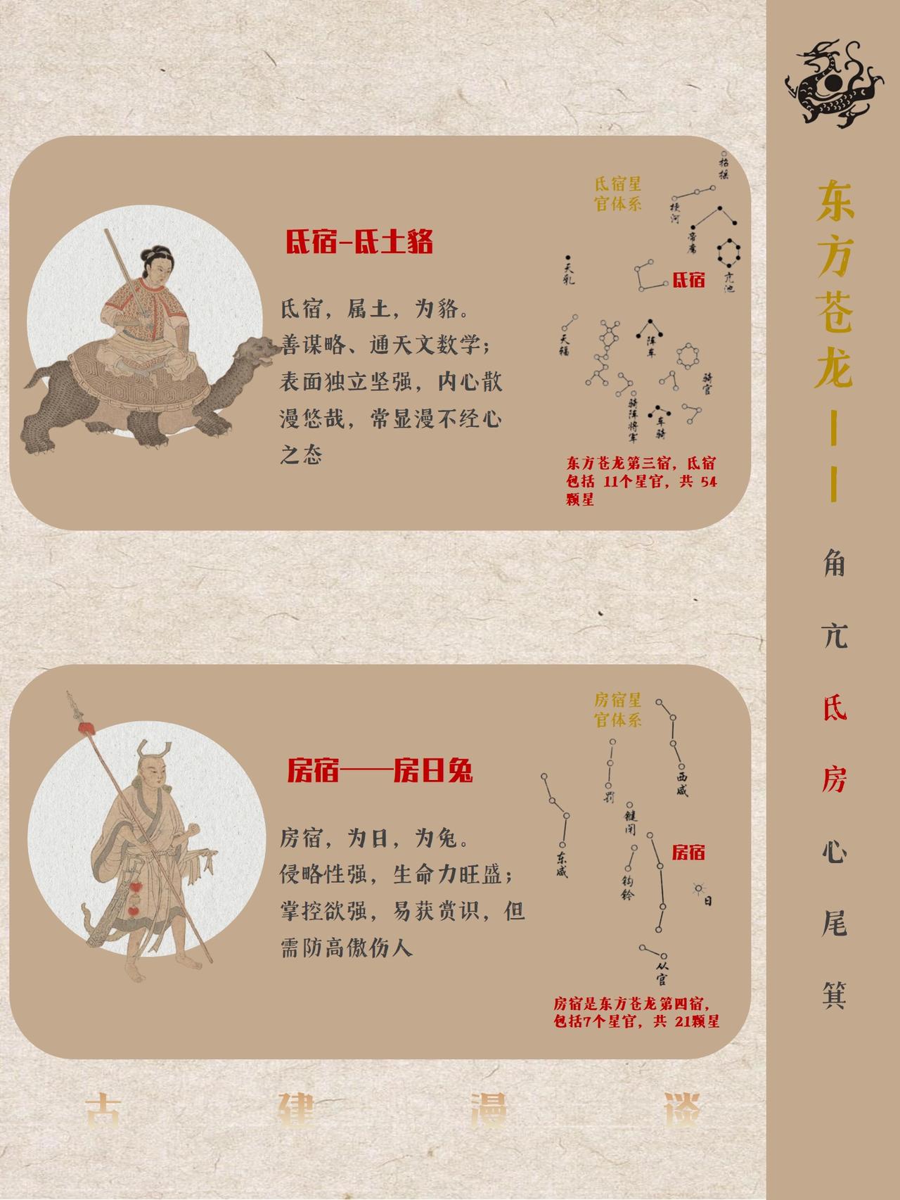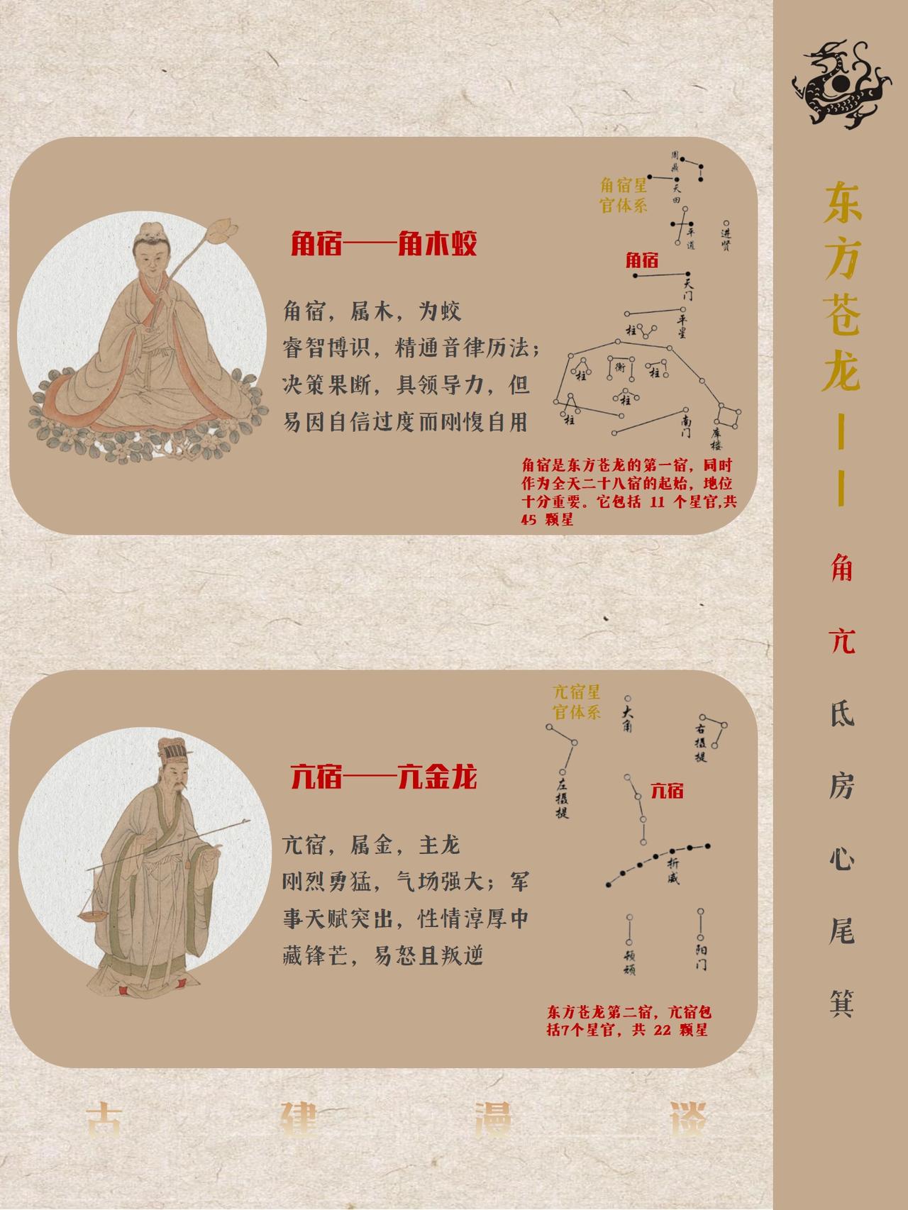 中国古代五星二十八宿神形图说 中国古人将天穹精准划分为东、南、西、北四宫,分别对应东方青龙、南方朱雀、西方白虎、北方玄武四大神兽图腾,每宫各选七组星宿构建成二十八座恒星坐标体系,通过观测日月五星在这些星宿间的运行轨迹来标记节气更迭、推定时间流转,这套融天文测量与哲学象征于一体的恒星坐标系统即被后世称为"二十八星宿"。 中国古人又创造性的将二十八星宿进行拟人化处理,每个星宿都对应有鲜明的性格特征,而定义这些性格特征背后的逻辑实则是对应每个星宿的客观特点。 古人认为“天垂象,见吉凶”,星宿运动对应人间兴衰。例如:角宿(青龙之首):象征“斗杀之冲”,故对应性格刚强、野心勃勃;轸宿(朱雀之尾):主悲痛凶险,故命格多坎坷后发迹等等。 本篇就不聊古建筑,而是和大家分享中国古人浪漫的天文认知。 二十八星宿人物图片截取自明代仇英版《五星二十八宿神形图》,大都会博物馆藏。