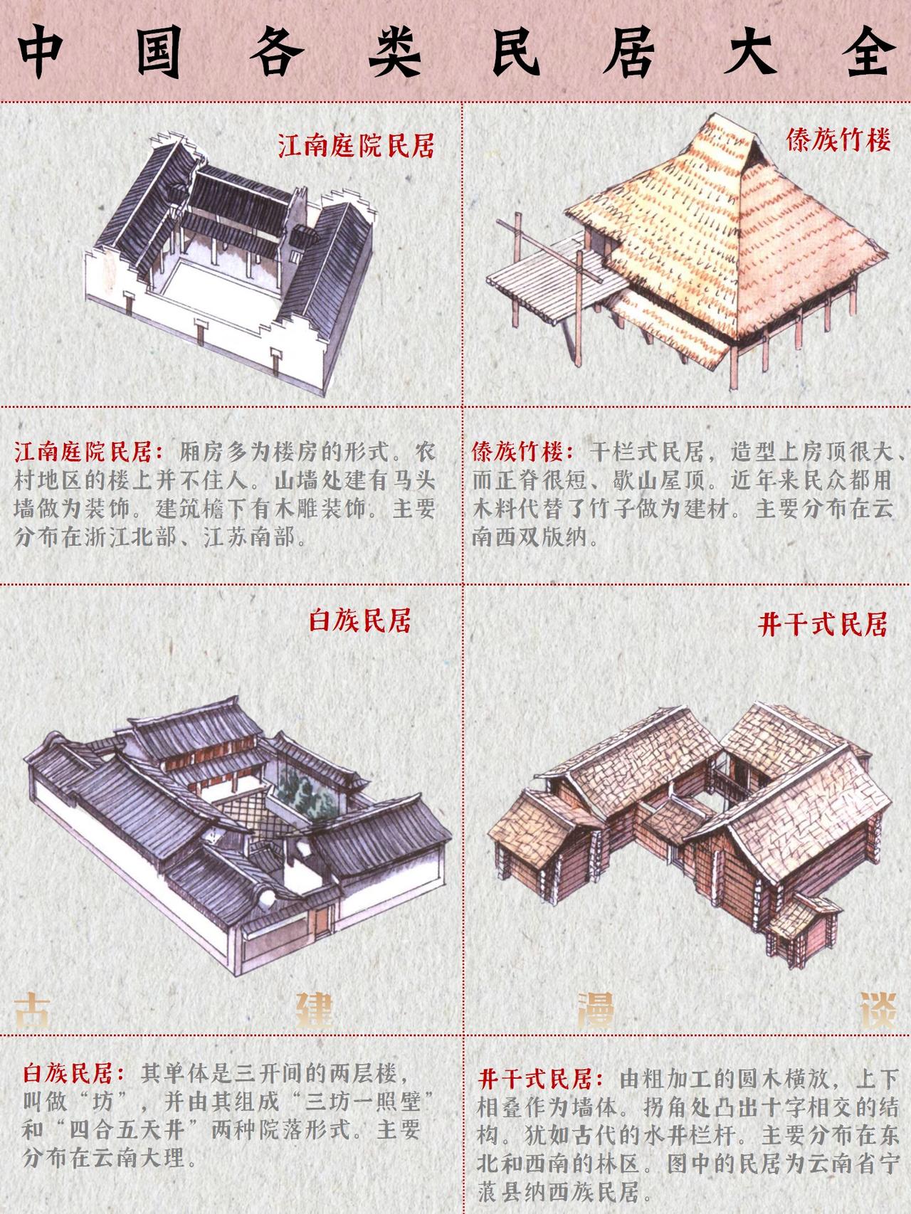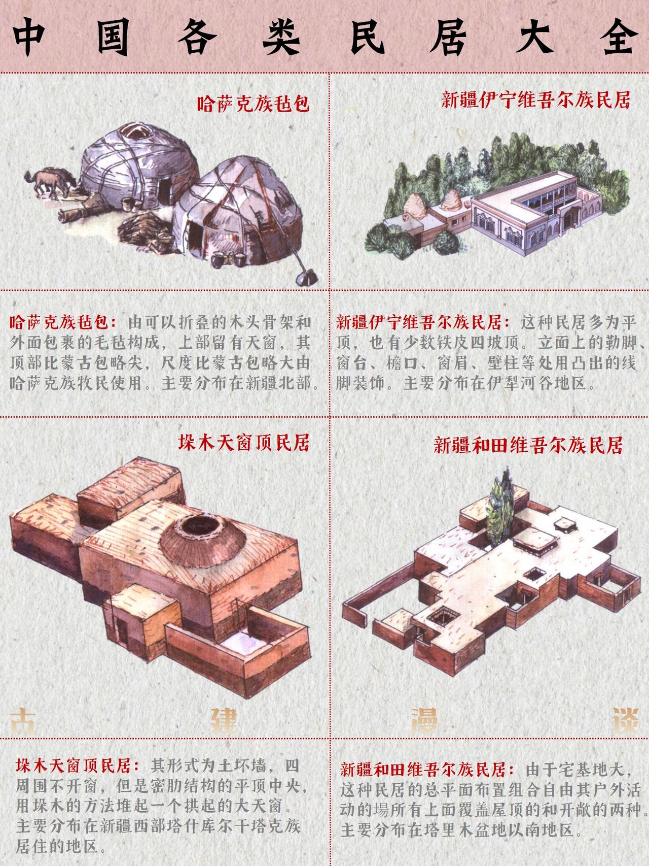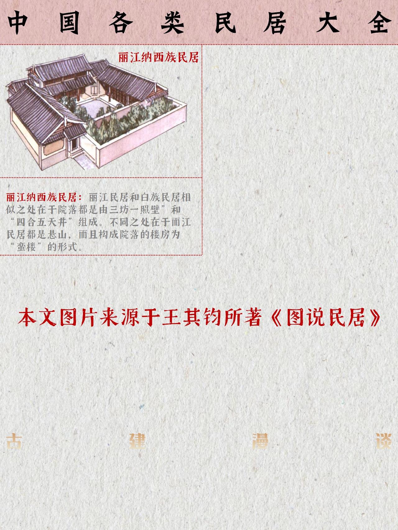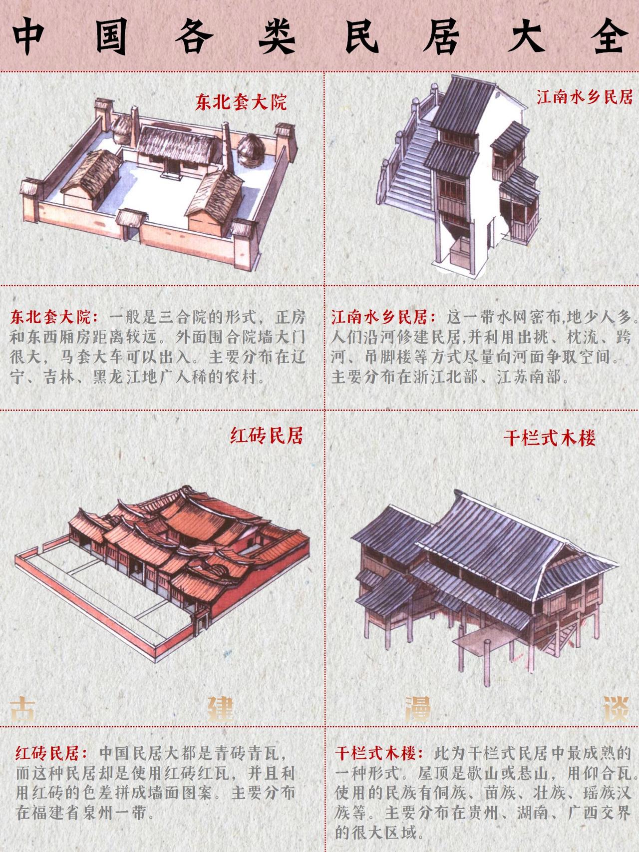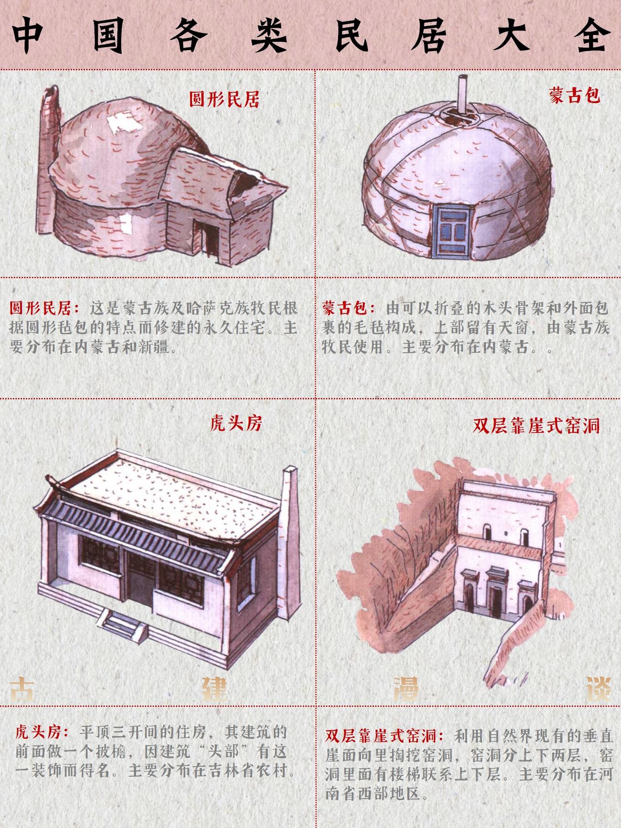 一文了解中国各类民居 中国汉族传统民居以院落式住宅为典型代表,形态丰富多样,深刻反映了地域与文化的多元性。在北方,北京四合院采用严谨的中轴对称布局,坐北朝南,围墙高大,房屋围合庭院,兼顾防风沙与冬季保暖。南方皖南徽派民居则以青瓦白墙和错落有致的马头墙为标志,既具防火功能,又显优雅素净。而客家人为抵御侵袭而建造的福建土楼,造型宏大独特,或圆或方,集防御与聚居功能于一体,堪称民居奇观。 与此同时,各少数民族在适应自然环境的过程中,发展出了极具民族智慧的居住形式。蒙古族牧民逐水草而居,使用便于拆装的蒙古包,以木为架,覆以毛毡,完美适应游牧生活。在黄土高原,人们利用黄土层深厚、直立性好的特点,开凿出冬暖夏凉的窑洞,体现了对自然资源的巧妙利用。在西南与南方山地丛林地区,傣族的竹楼、壮族的干栏式吊脚楼等,普遍采用底层架空的干栏式结构,有效适应炎热潮湿的气候和崎岖不平的地形。 民居形式的差异不仅源于气候与地理环境,更深受经济生活、民族习俗、宗教信仰和审美观念的影响。例如,同处东北地区,汉族民居多以厚墙重屋御寒,而朝鲜族民居则通过铺设全屋火炕来抵御严寒,这体现了生活习俗的差异。然而,在贵州、湖南、广西交界的大片山林地区,尽管民族不同(如侗族、苗族、壮族、瑶族和汉族),却普遍采用干栏式木楼,这又鲜明体现了地理环境对民居形式的决定性影响。 这些各具特色的民居,不仅是遮风避雨的居所,更是自然环境与人文历史交融的产物,凝聚着各民族非凡的创造力、独特的生活智慧以及深厚的审美情趣,共同构成了中华建筑文化博大精深的绚丽画卷。 本篇就和大家分享中国大地上存在的各类民居样式。 本文图片截取自王其钧所著《图说民居》