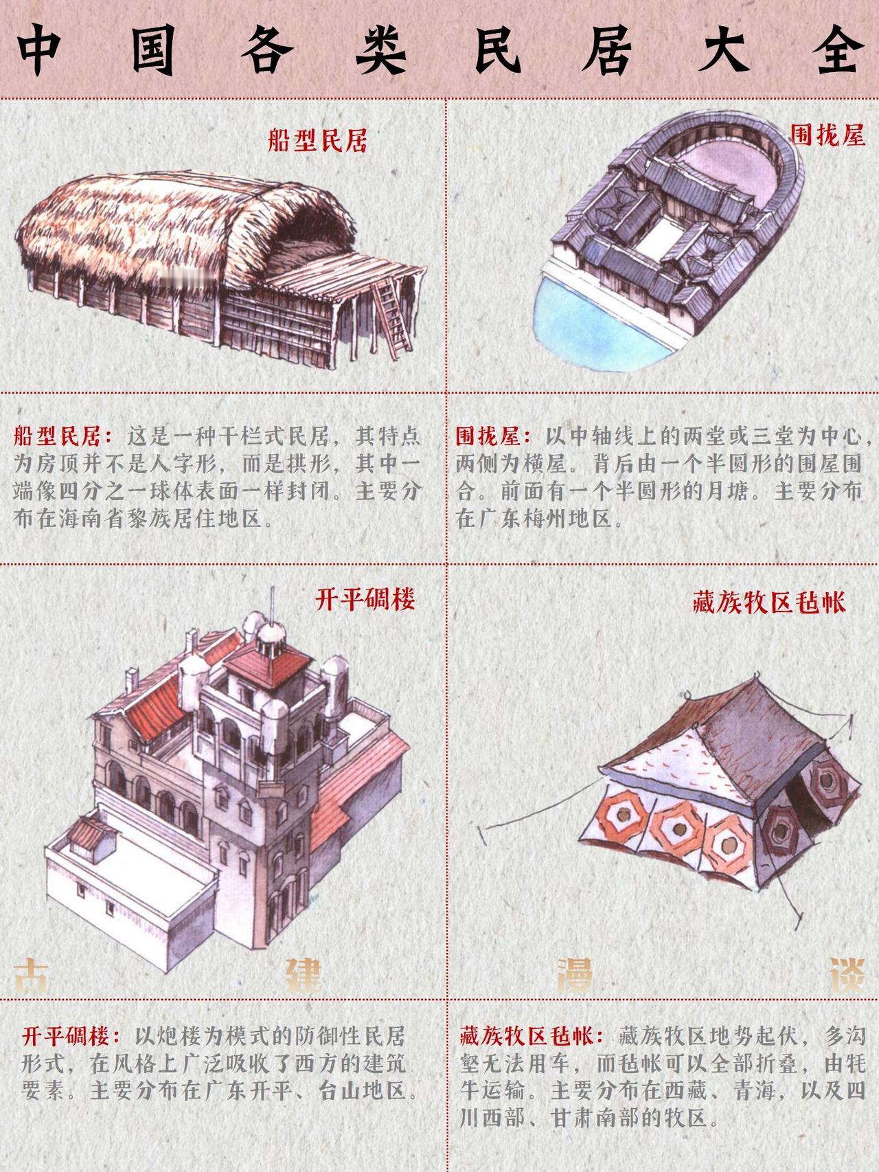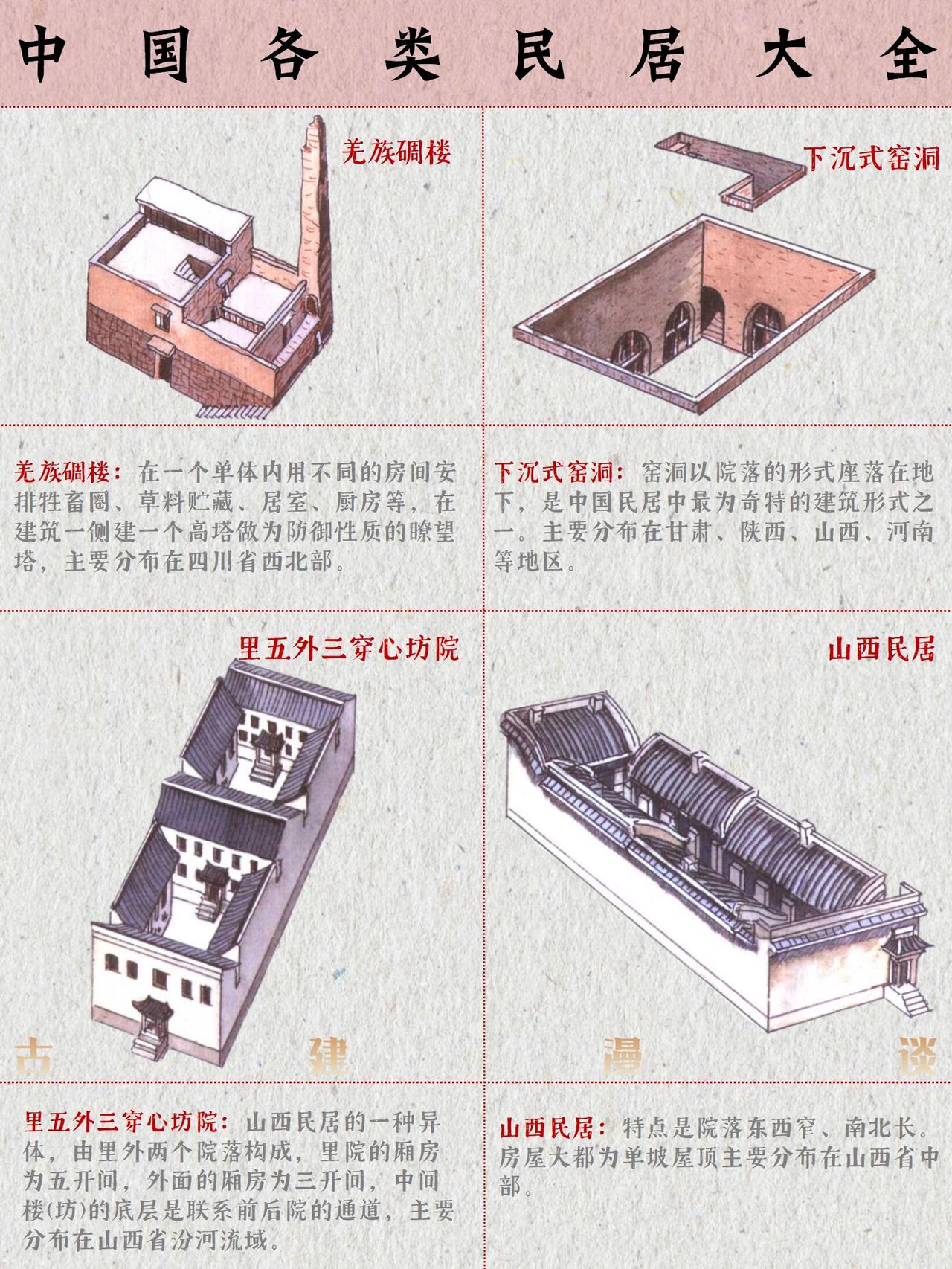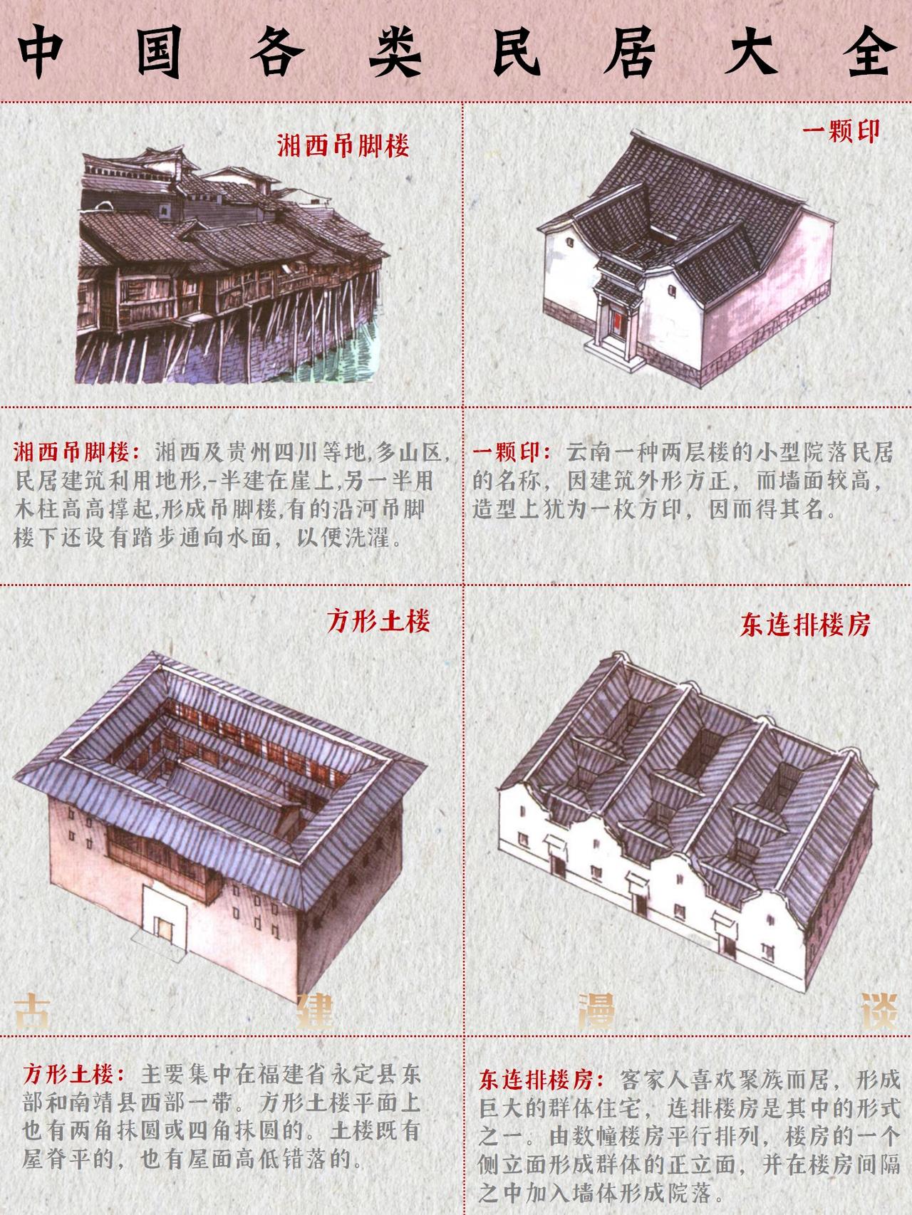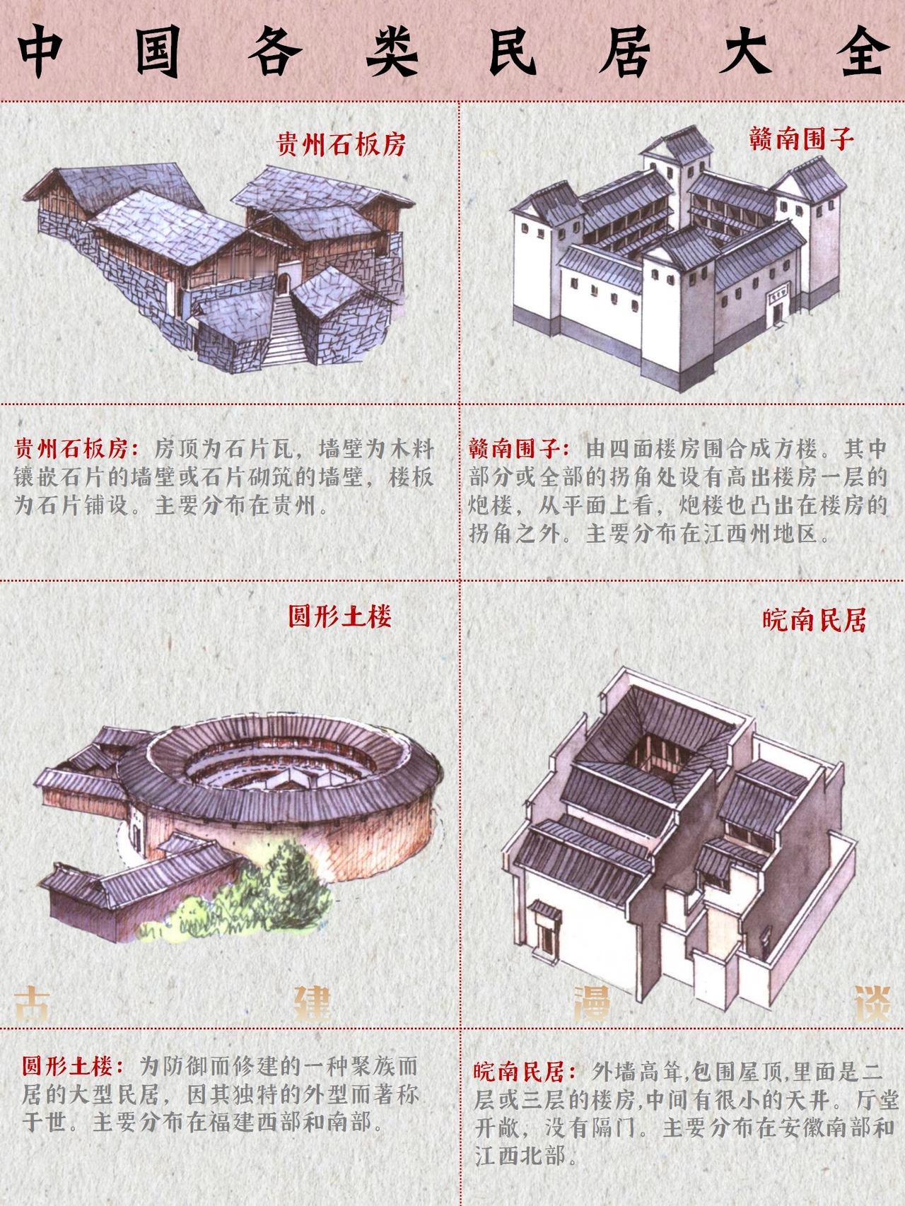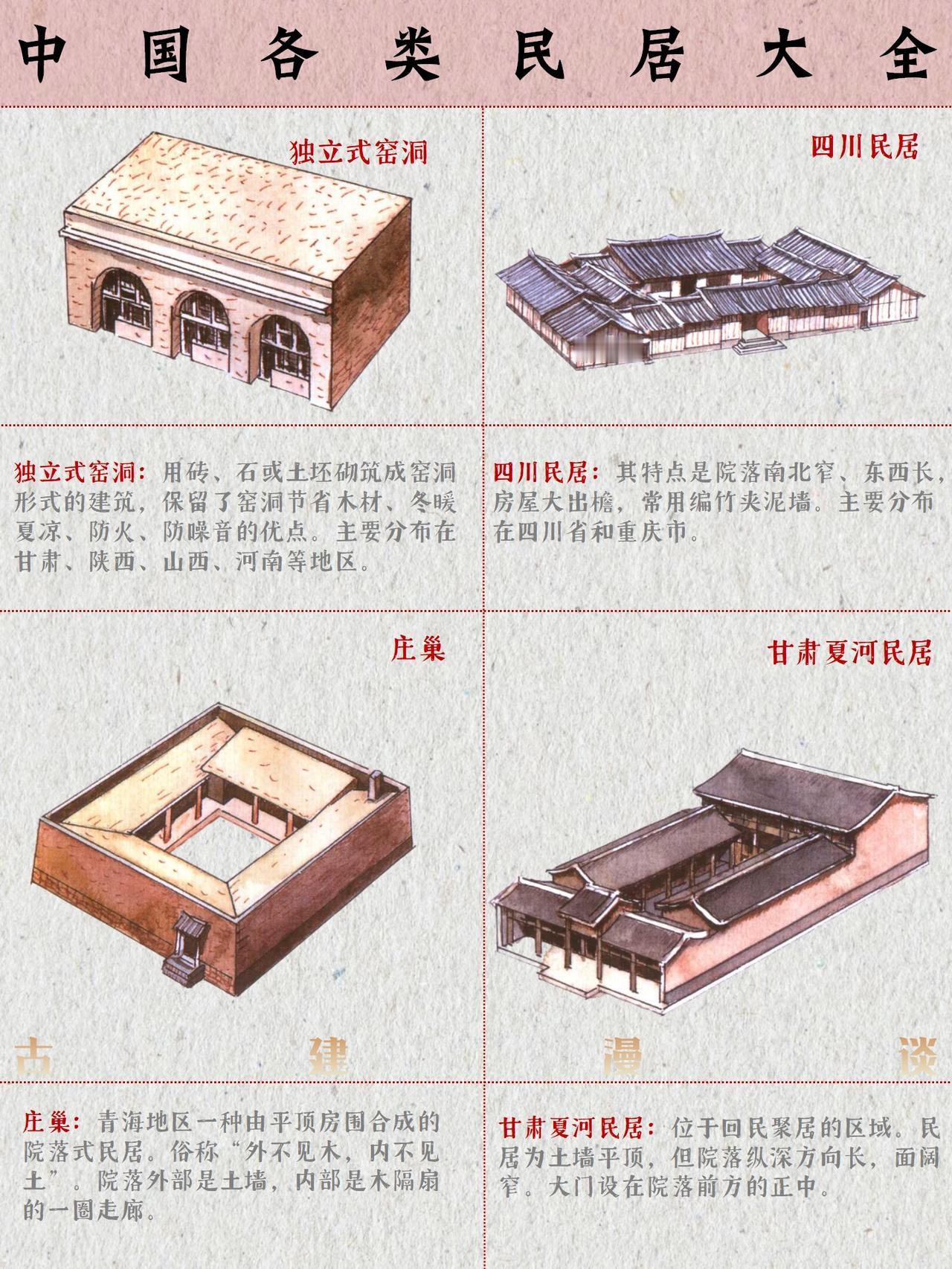 一文了解中国各类民居 中国汉族传统民居以院落式住宅为典型代表,形态丰富多样,深刻反映了地域与文化的多元性。在北方,北京四合院采用严谨的中轴对称布局,坐北朝南,围墙高大,房屋围合庭院,兼顾防风沙与冬季保暖。南方皖南徽派民居则以青瓦白墙和错落有致的马头墙为标志,既具防火功能,又显优雅素净。而客家人为抵御侵袭而建造的福建土楼,造型宏大独特,或圆或方,集防御与聚居功能于一体,堪称民居奇观。 与此同时,各少数民族在适应自然环境的过程中,发展出了极具民族智慧的居住形式。蒙古族牧民逐水草而居,使用便于拆装的蒙古包,以木为架,覆以毛毡,完美适应游牧生活。在黄土高原,人们利用黄土层深厚、直立性好的特点,开凿出冬暖夏凉的窑洞,体现了对自然资源的巧妙利用。在西南与南方山地丛林地区,傣族的竹楼、壮族的干栏式吊脚楼等,普遍采用底层架空的干栏式结构,有效适应炎热潮湿的气候和崎岖不平的地形。 民居形式的差异不仅源于气候与地理环境,更深受经济生活、民族习俗、宗教信仰和审美观念的影响。例如,同处东北地区,汉族民居多以厚墙重屋御寒,而朝鲜族民居则通过铺设全屋火炕来抵御严寒,这体现了生活习俗的差异。然而,在贵州、湖南、广西交界的大片山林地区,尽管民族不同(如侗族、苗族、壮族、瑶族和汉族),却普遍采用干栏式木楼,这又鲜明体现了地理环境对民居形式的决定性影响。 这些各具特色的民居,不仅是遮风避雨的居所,更是自然环境与人文历史交融的产物,凝聚着各民族非凡的创造力、独特的生活智慧以及深厚的审美情趣,共同构成了中华建筑文化博大精深的绚丽画卷。 本篇就和大家分享中国大地上存在的各类民居样式。 本文图片截取自王其钧所著《图说民居》