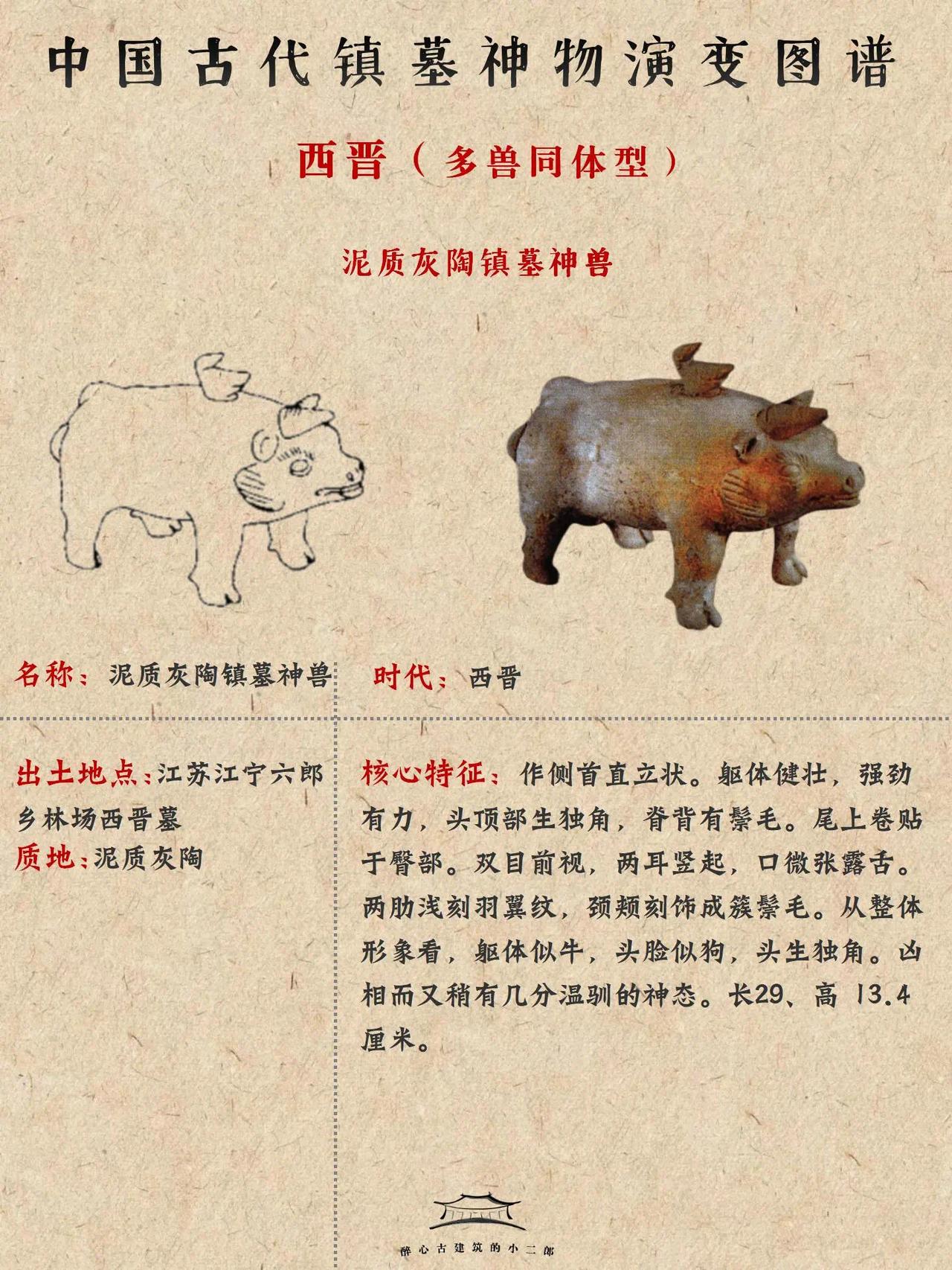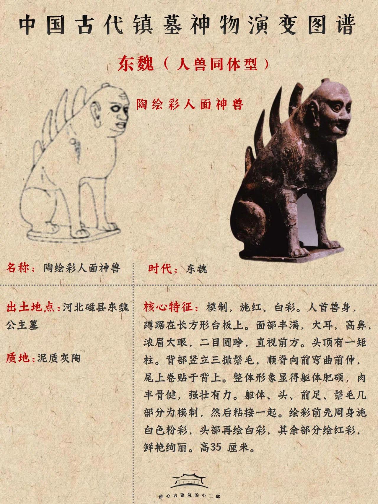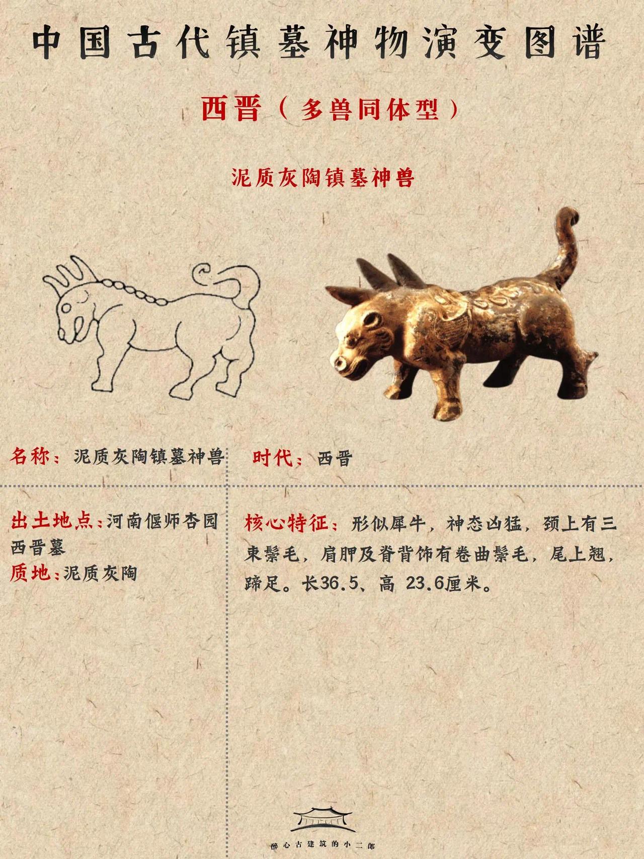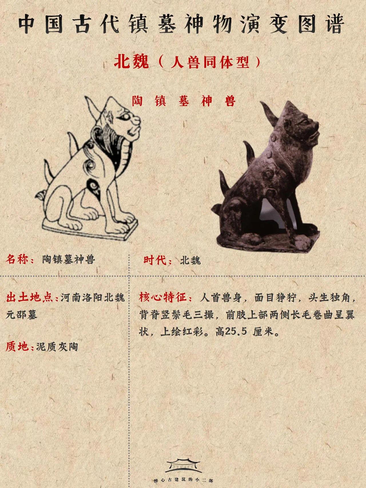 中国古代镇墓神物演变图谱 | 两晋~南北朝 两晋至魏晋南北朝时期,镇墓兽经历了从单一形态到组合化、多元化的演变。 西晋时期镇墓兽多为陶制犀牛状,成对出现于墓门两侧,造型写实且功能以镇墓辟邪为主;东晋受佛教影响,镇墓兽逐渐融入狮子元素,肩生鬃毛并出现佛教造像特征。南北朝时期,北朝镇墓兽形成人面与兽面成对组合的固定模式,兽面多似狮形,背部有鬃毛,人面则呈现深目高鼻的胡人形象,北魏迁都洛阳后造型更趋威严,头顶出现冲天戟;南朝镇墓兽则偏向小巧精致,线条流畅。 这一时期镇墓兽融合了胡汉文化特征,如北齐人面镇墓兽的络腮胡与宽脸盘,同时宗教元素(佛教羽翼、道教辟邪符号)与民族迁徙带来的造型创新(如伏翼兽、摩羯形象)并存,体现了多元文化交融。 继续上文(镇墓),本篇文章继续以组图的形式来给大家分享此段历史时期镇墓兽的演变。