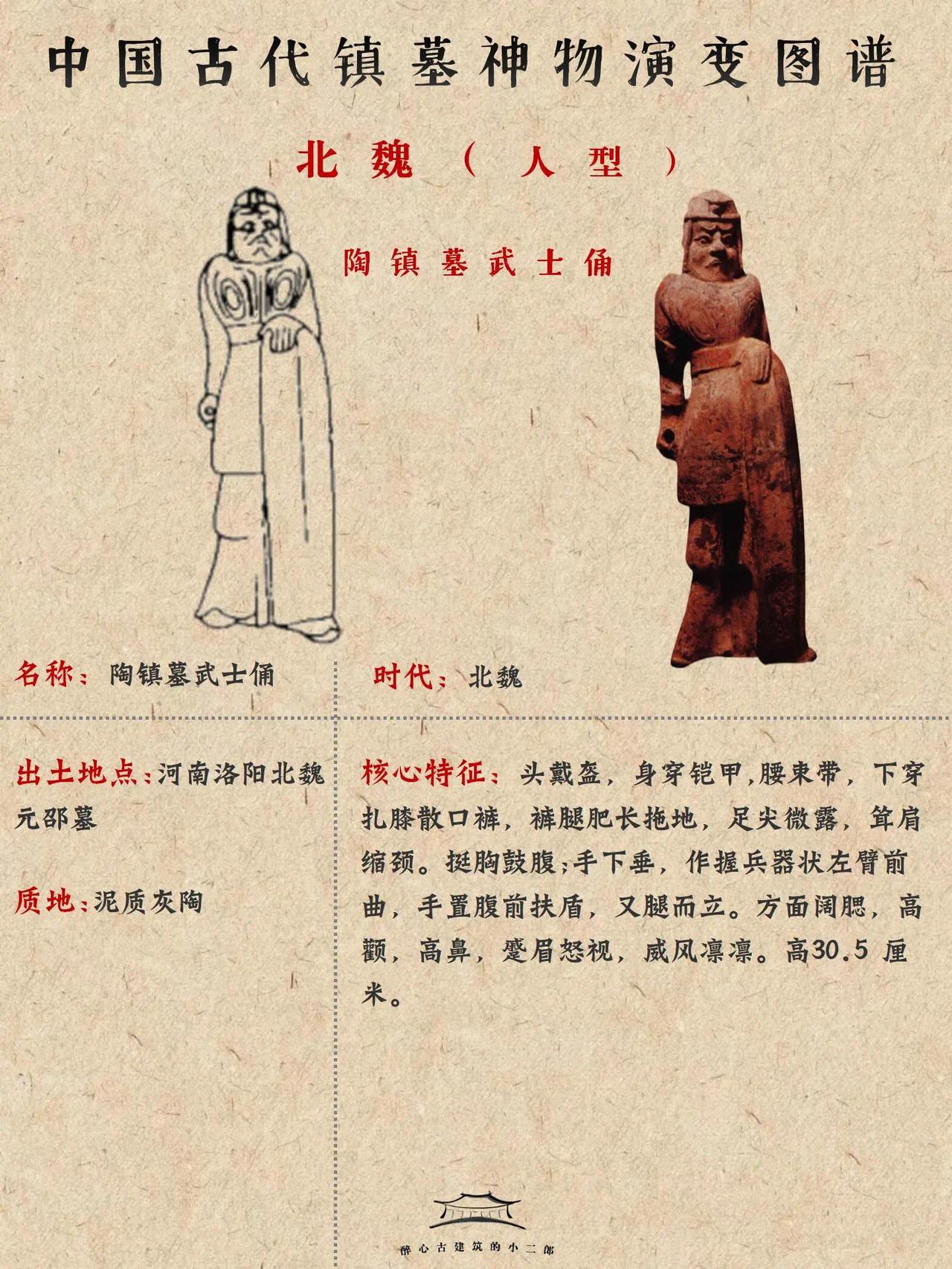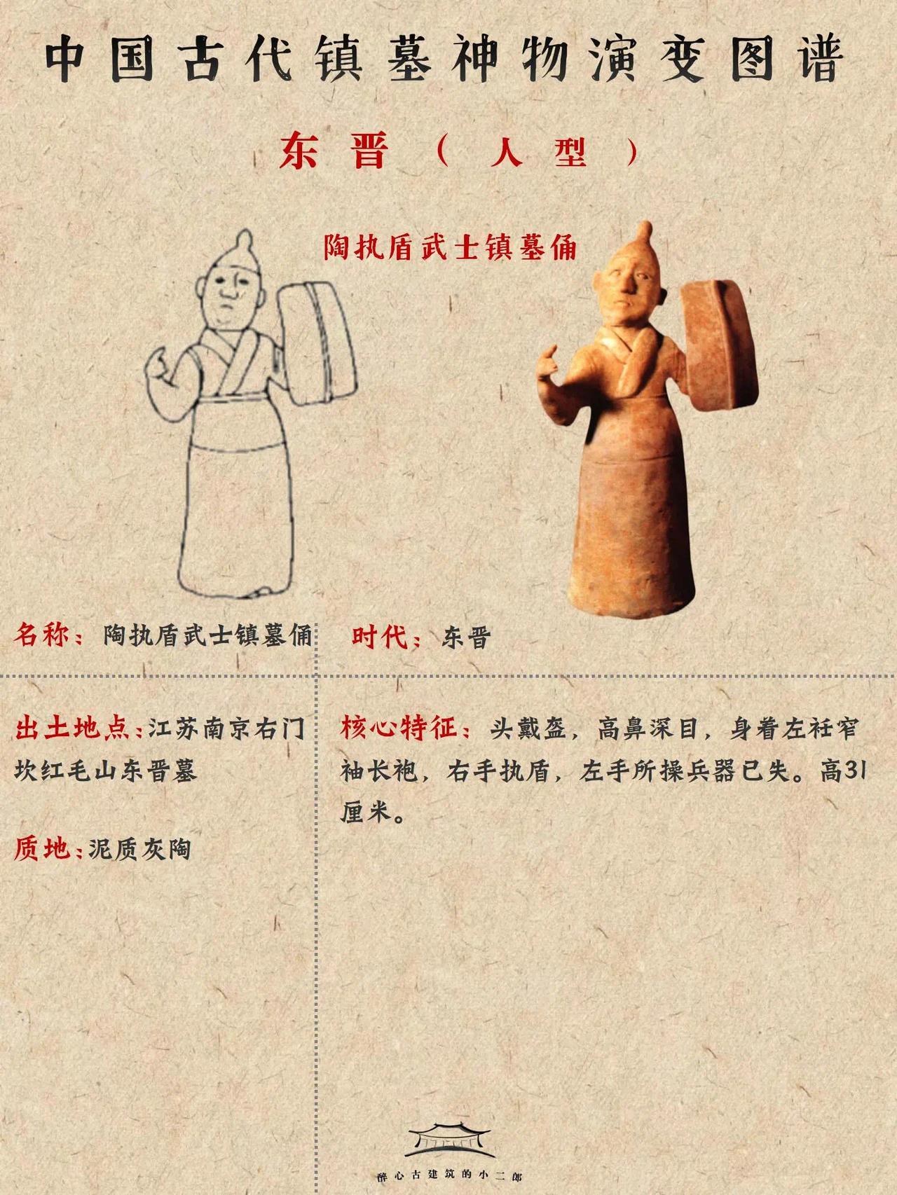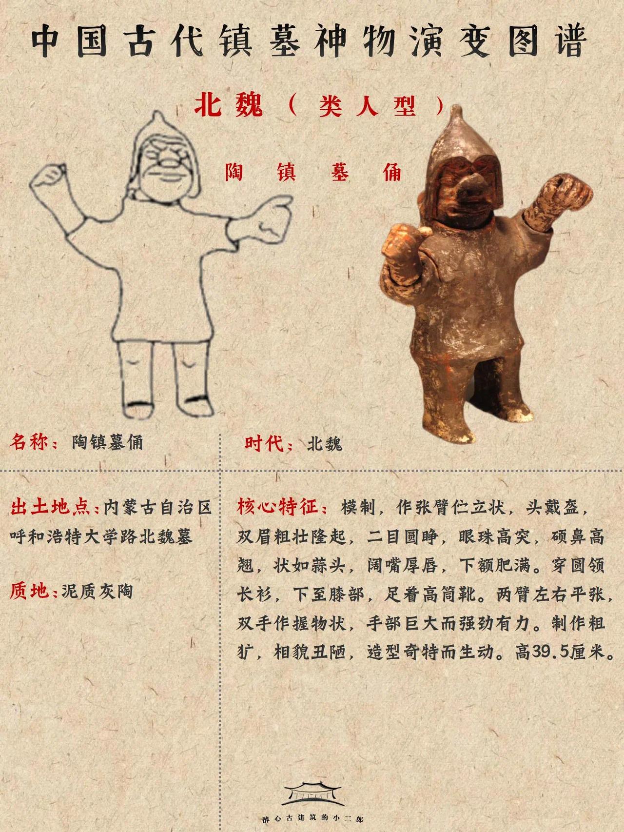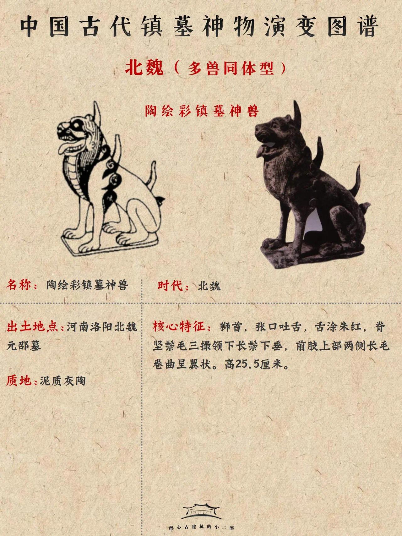 中国古代镇墓神物演变图谱 | 两晋~南北朝 两晋至魏晋南北朝时期,镇墓兽经历了从单一形态到组合化、多元化的演变。 西晋时期镇墓兽多为陶制犀牛状,成对出现于墓门两侧,造型写实且功能以镇墓辟邪为主;东晋受佛教影响,镇墓兽逐渐融入狮子元素,肩生鬃毛并出现佛教造像特征。南北朝时期,北朝镇墓兽形成人面与兽面成对组合的固定模式,兽面多似狮形,背部有鬃毛,人面则呈现深目高鼻的胡人形象,北魏迁都洛阳后造型更趋威严,头顶出现冲天戟;南朝镇墓兽则偏向小巧精致,线条流畅。 这一时期镇墓兽融合了胡汉文化特征,如北齐人面镇墓兽的络腮胡与宽脸盘,同时宗教元素(佛教羽翼、道教辟邪符号)与民族迁徙带来的造型创新(如伏翼兽、摩羯形象)并存,体现了多元文化交融。 继续上文(镇墓),本篇文章继续以组图的形式来给大家分享此段历史时期镇墓兽的演变。
