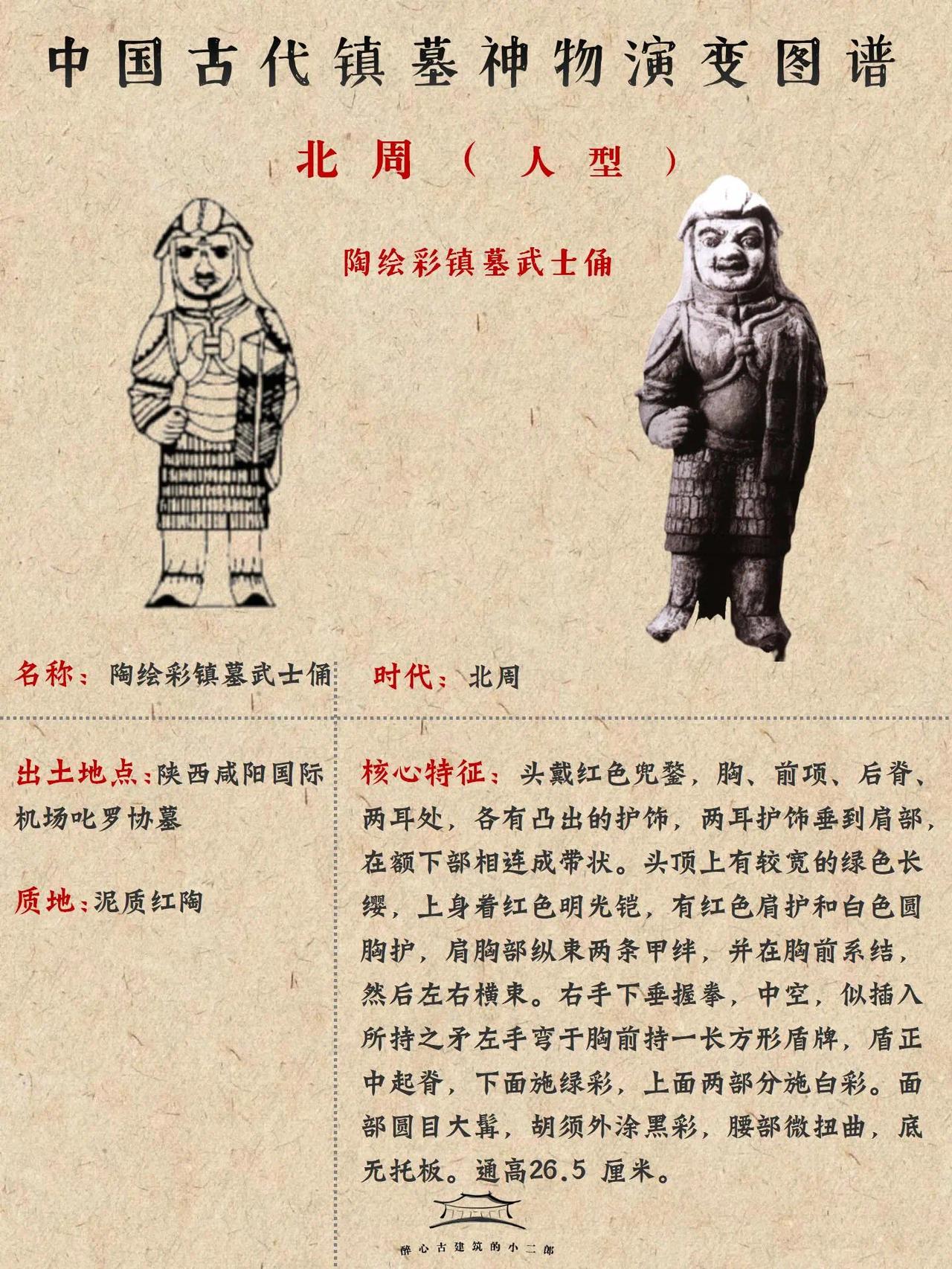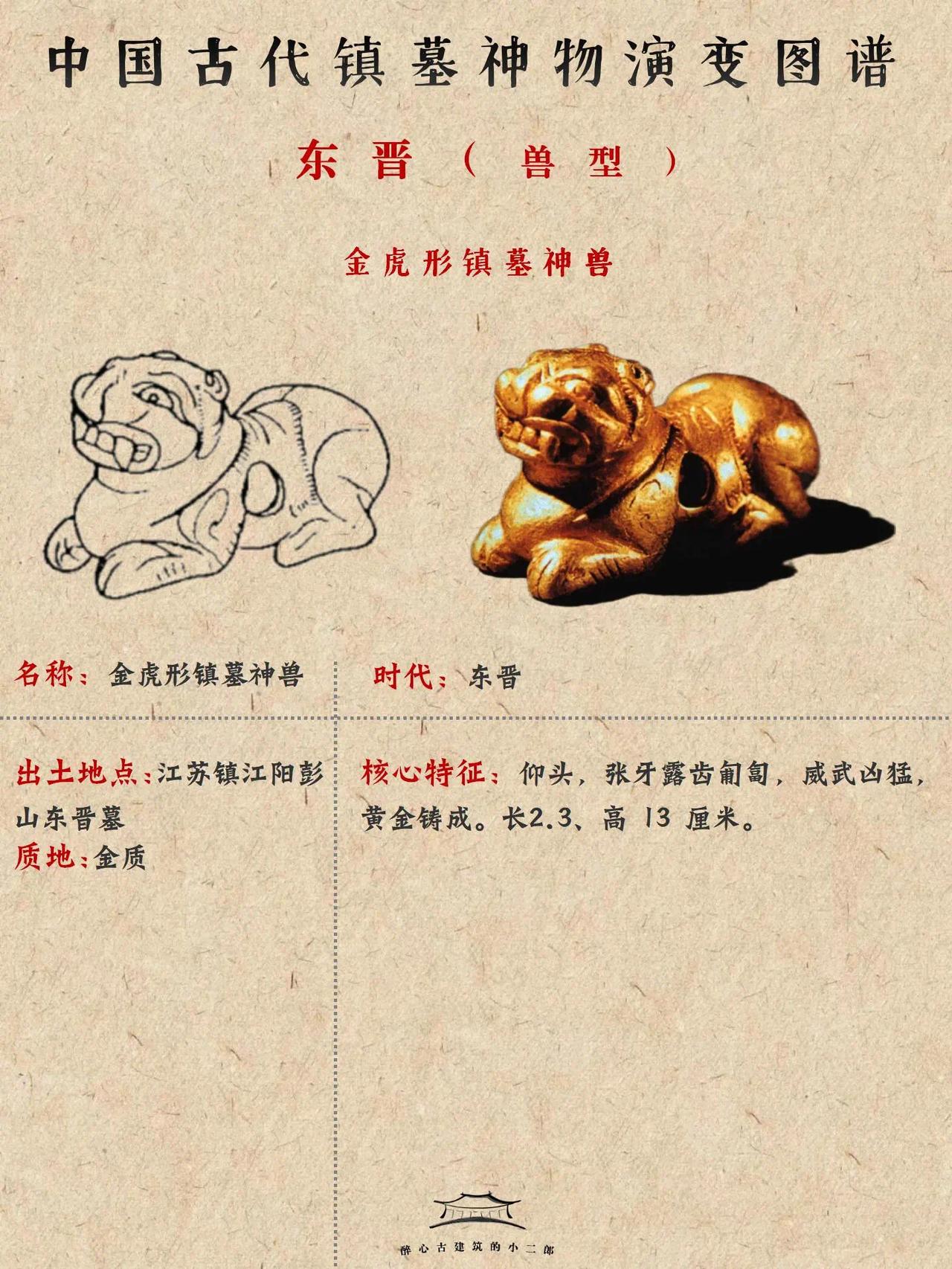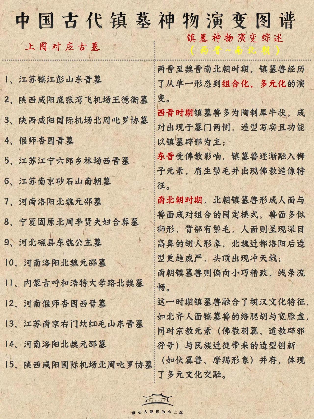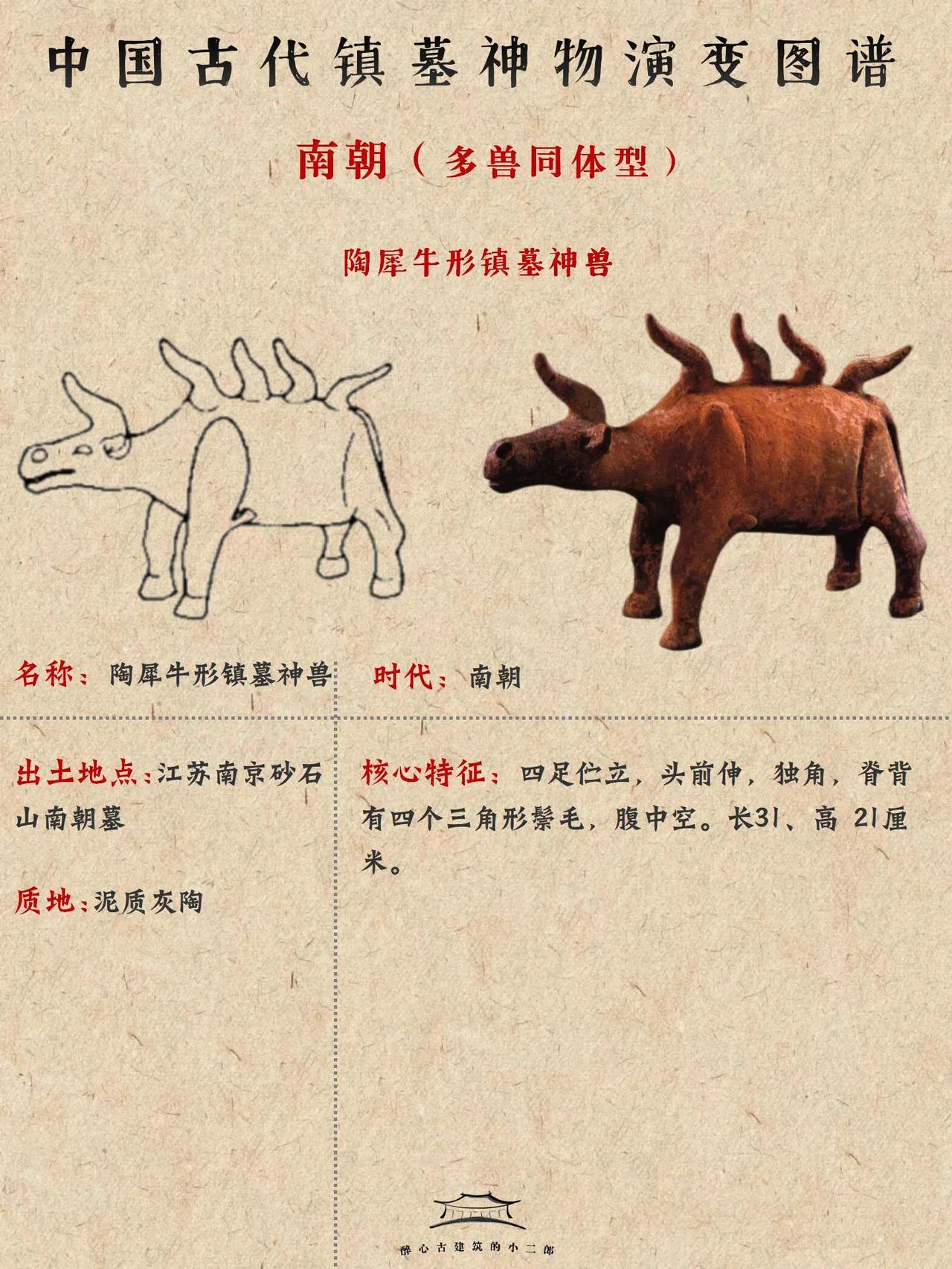 中国古代镇墓神物演变图谱 | 两晋~南北朝 两晋至魏晋南北朝时期,镇墓兽经历了从单一形态到组合化、多元化的演变。 西晋时期镇墓兽多为陶制犀牛状,成对出现于墓门两侧,造型写实且功能以镇墓辟邪为主;东晋受佛教影响,镇墓兽逐渐融入狮子元素,肩生鬃毛并出现佛教造像特征。南北朝时期,北朝镇墓兽形成人面与兽面成对组合的固定模式,兽面多似狮形,背部有鬃毛,人面则呈现深目高鼻的胡人形象,北魏迁都洛阳后造型更趋威严,头顶出现冲天戟;南朝镇墓兽则偏向小巧精致,线条流畅。 这一时期镇墓兽融合了胡汉文化特征,如北齐人面镇墓兽的络腮胡与宽脸盘,同时宗教元素(佛教羽翼、道教辟邪符号)与民族迁徙带来的造型创新(如伏翼兽、摩羯形象)并存,体现了多元文化交融。 继续上文(镇墓),本篇文章继续以组图的形式来给大家分享此段历史时期镇墓兽的演变。