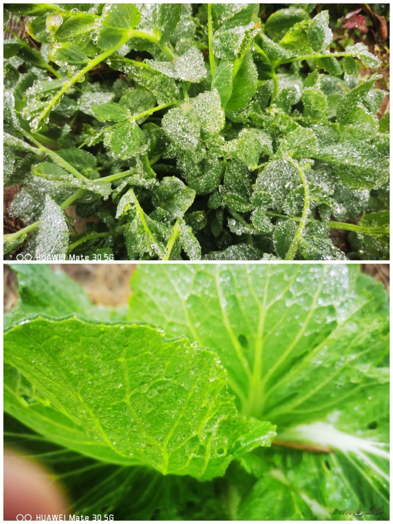 4号早上准备去菜地割菜,到车上找双手套,车门被冻了打不开,地里的豌豆尖、大蒜、白菜覆上了一层冰,割一颗白菜拿在手里,感觉寒意顺着血液冰到心里,赶紧放在手弯上抱起。