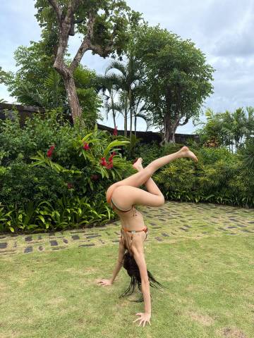 照片里的Lisa身着一套条纹比基尼,在充满热带风情的私人花园里显得格外松弛。最让网友惊叹的是,她并没有选择常规的“网红摆拍”,而是直接在草地上来了一个标准的高难度倒立。镜头记录下了她紧致的背部线条和几乎没有一丝赘肉的腹肌。不同于舞台上的浓妆重彩,这次她几乎素面朝天,甚至还对着镜头做了几个调皮的鬼脸,展现出一种截然不同的野性美与生命力。
