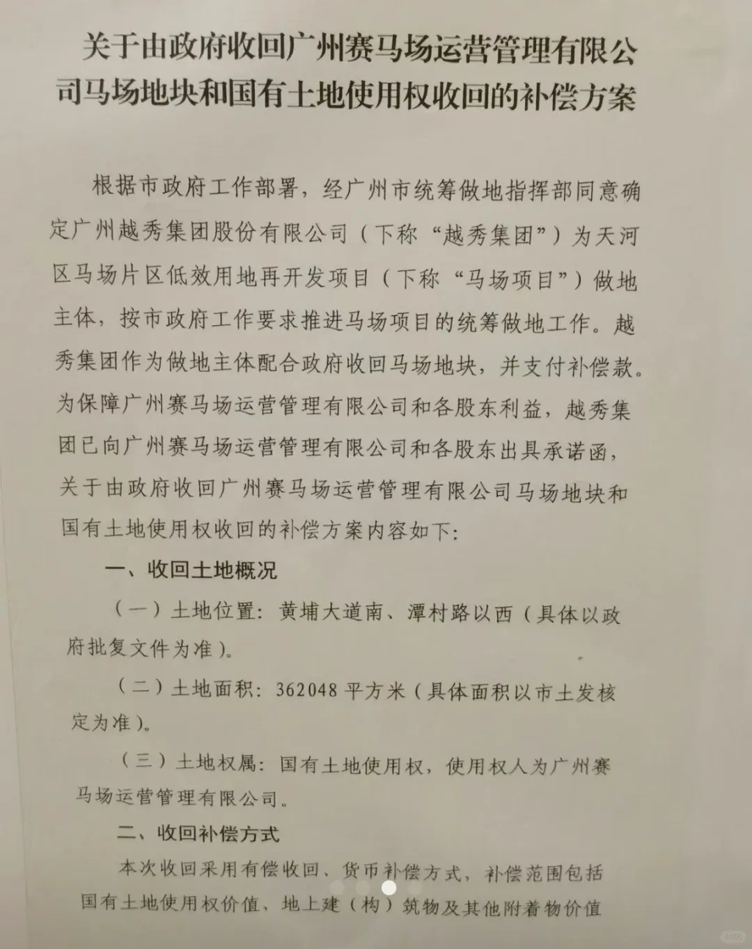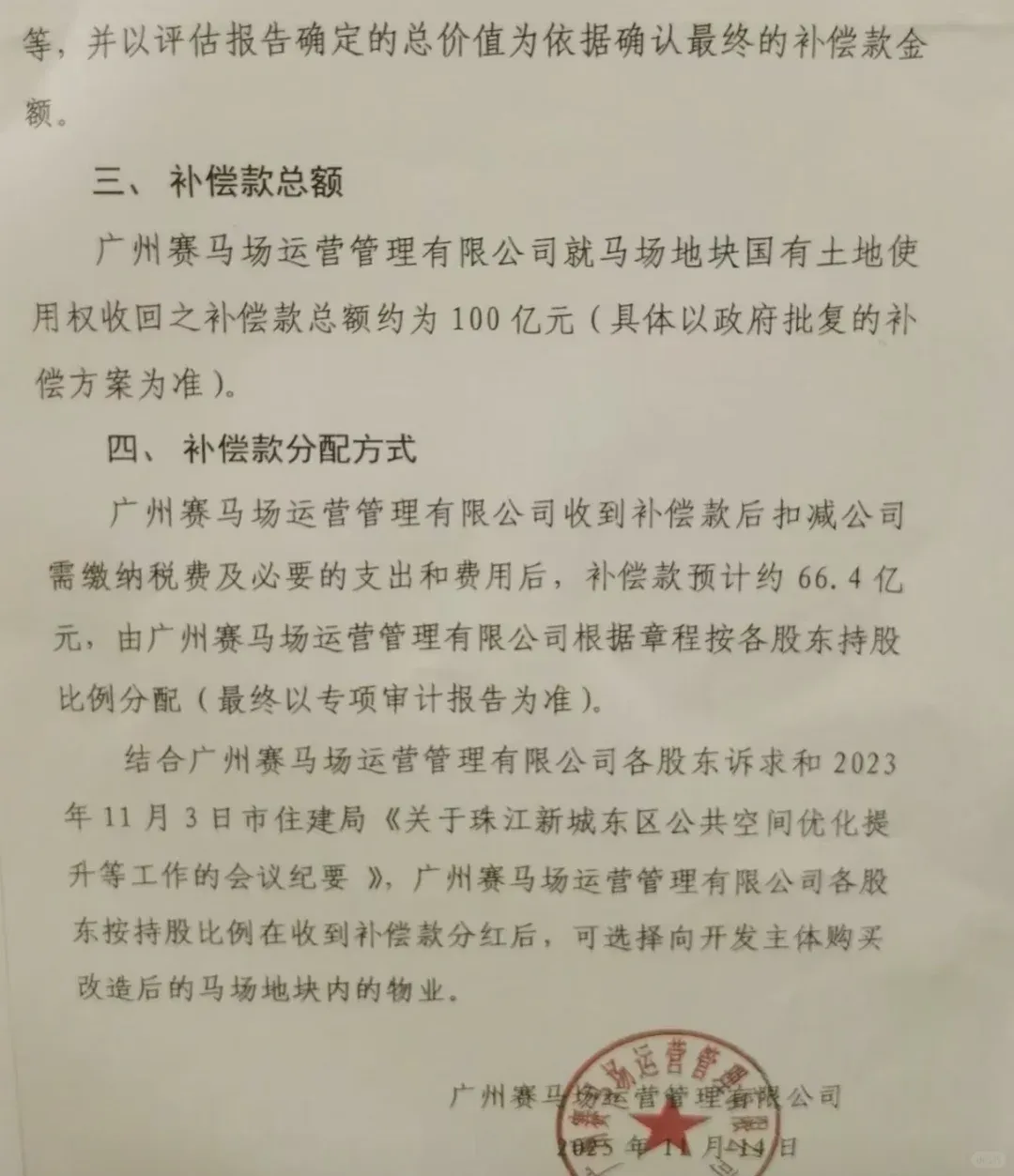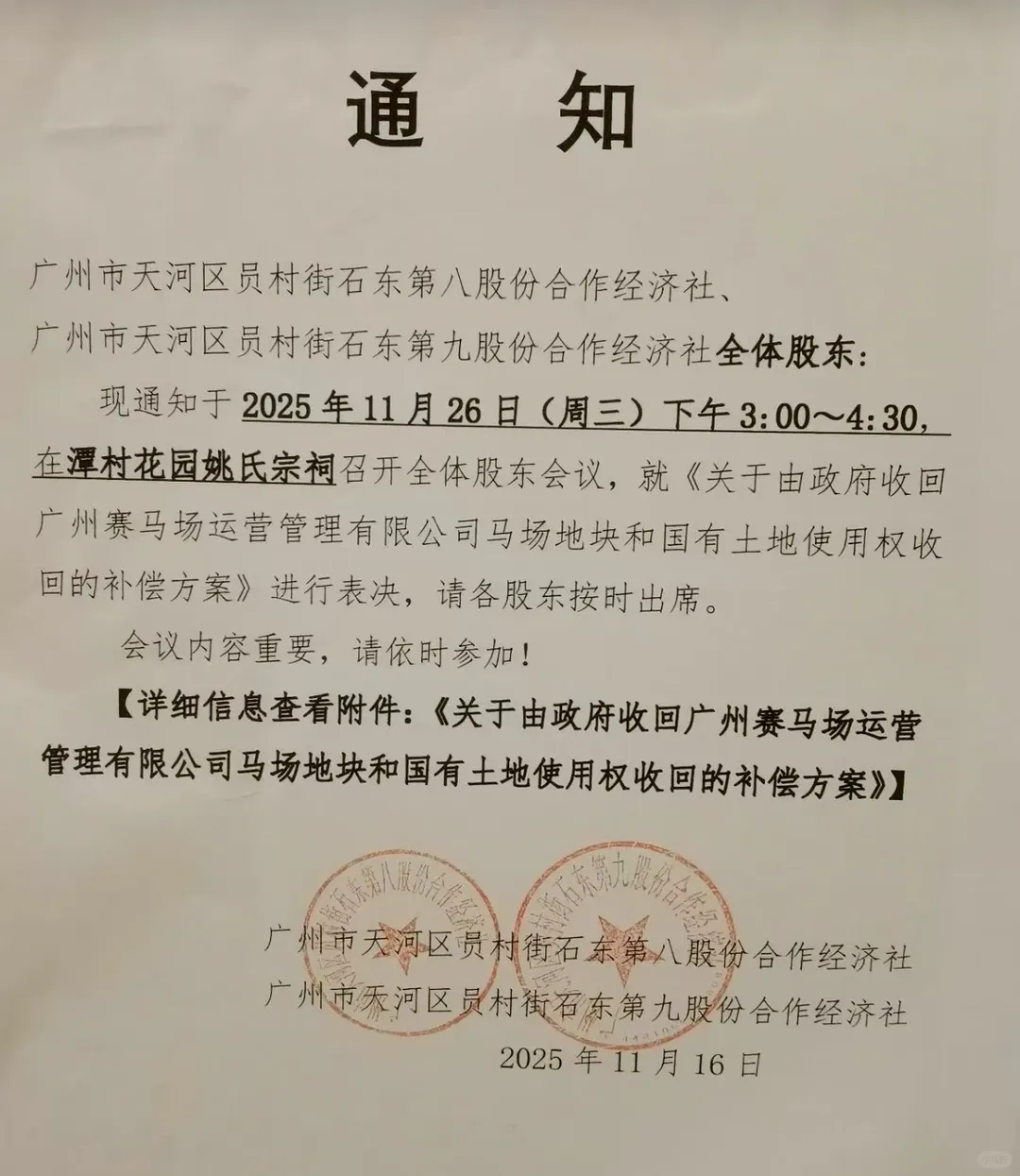 广州市天河区员村街石东第八股份合作经济社、第九股份合作经济社将召开全体股东会议,将在11月26日就《关于由政府收回广州赛马场运营管理有限公司马场地块和国有土地使用权收回的补偿方案》进行表决。