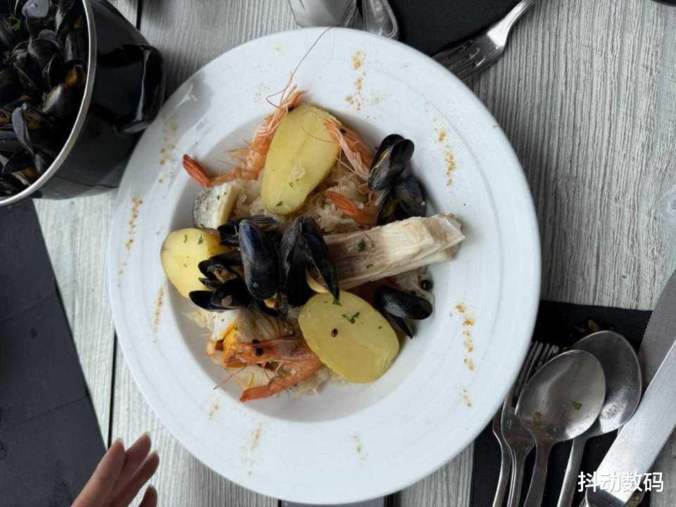 Noirmoutier岛除了有丰富的海产资源还盛产盐和土豆。岛上有非常多的盐田,很多人会买一些带回去当礼物送人。这里土豆非常著名,因为其产量低口感好,只能人工收而价格昂贵。说实话我是吃不太出来好在哪里。比如配菜中就会有这样大块的土豆作为主食,这样一份海鲜饭大概16欧。