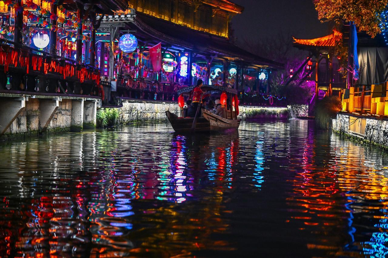 白日里的青砖灰瓦,此刻被光影染成琥珀色。一盏盏灯笼从檐角垂下,在石板路上投出粼粼的波光——恍惚间,整座古城像浮在水面的画舫,随桨声轻轻摇晃。
