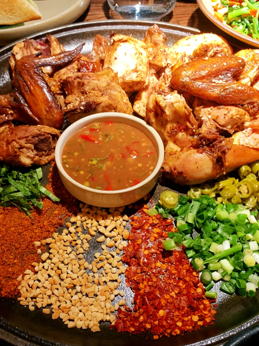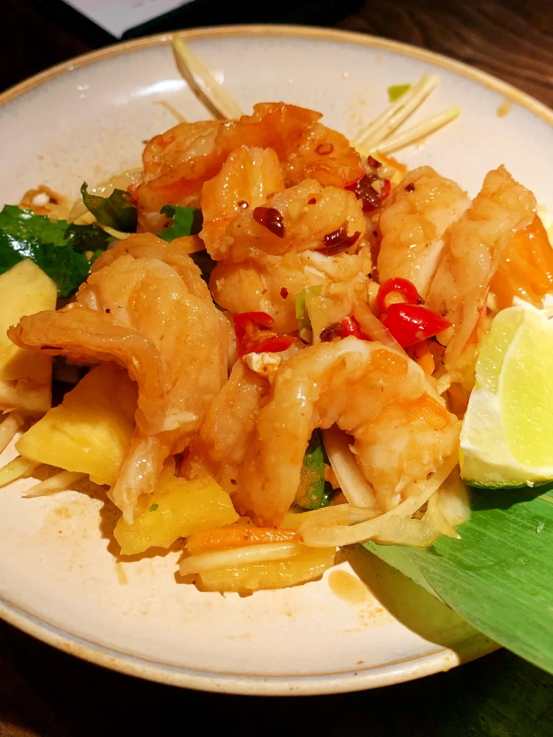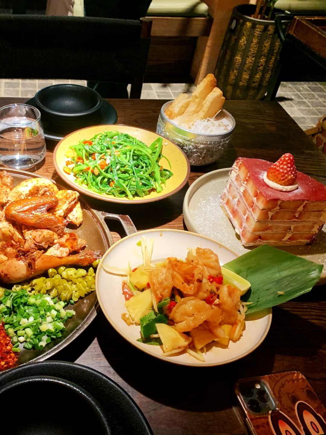 今天在朝阳大悦城瞎逛,随便进了这家店,真的太惊艳了! 👉位置:朝阳大悦城8楼👈 环境精致 服务好 性价比很高~ 草莓千层真不是那种齁甜的奶油糊嘴款!每一层都是新鲜草莓片,裹的奶酱是那种清清爽爽的,咬下去饼皮软乎乎的,顶上那颗草莓脆甜脆甜的。 招牌烤鸡,鸡肉嫩得能流汁,蘸那个辣椒面+花生碎,吃的特别香。 菠萝虾也很棒!虾是真的弹,咬下去QQ的,菠萝酸甜的,连里面的配菜都浸满了味儿 我已经存收藏夹了,下周还要来!