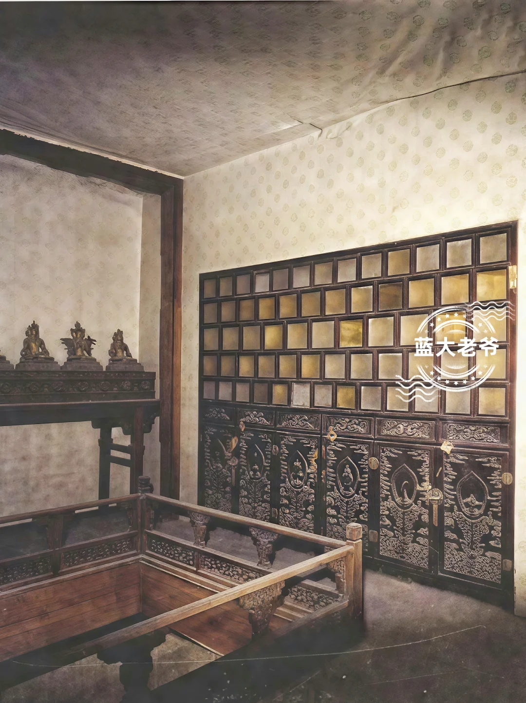 1️⃣4️⃣慈宁宫花园咸若馆佛龛一角,明嘉靖15年建慈宁为皇太后居,万历11年更花园咸若亭为馆,清乾隆两次修缮改扩建,咸若馆增三间抱厦,添建慈荫楼、宝相吉云二配楼、添建临溪亭东西配殿与延寿堂等。咸若馆正悬乾隆寿国香台匾,明间供桌铜五供法器,东西次间各有楠木八角七级佛塔,塔内分供乾隆瓷质无量寿佛五百尊,殿余三壁设通联式金漆毗卢帽四层经龛,龛内原供《甘珠尔经》一百零八函,明间与东西次间北壁唐卡9幅,东西梢间内壁上设24挂龛,内供4千多尊泥塑脱模擦擦佛