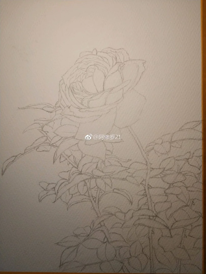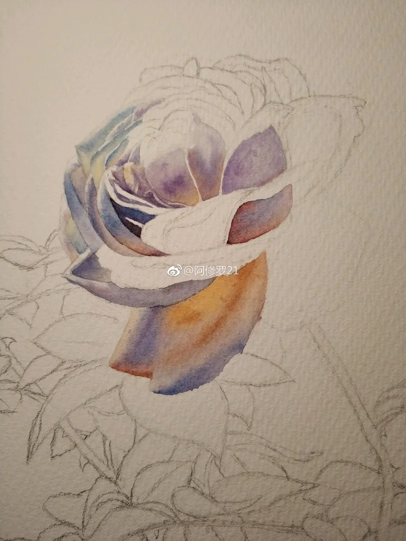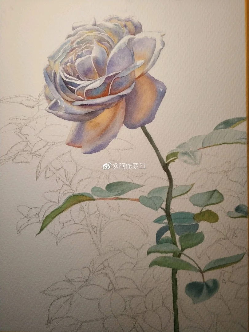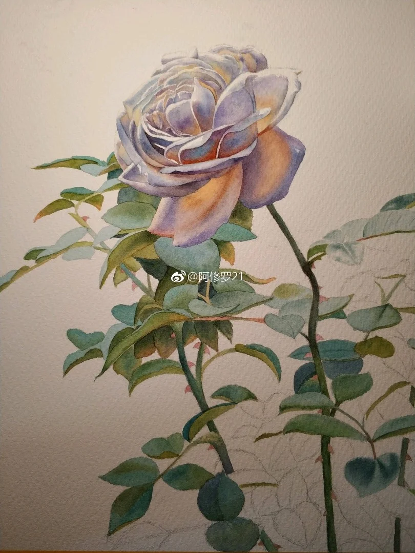 水彩。临摹黄有维老师的玫瑰。叶子可真多哎……