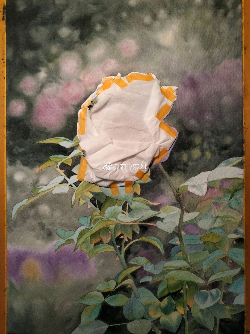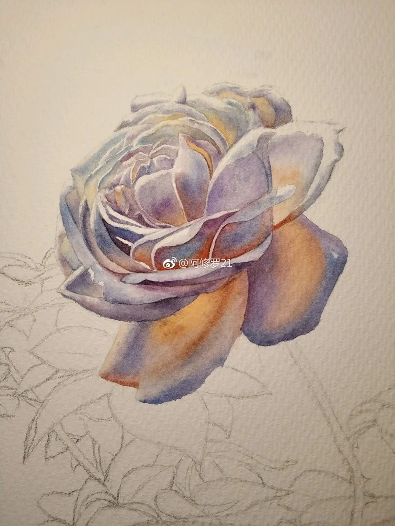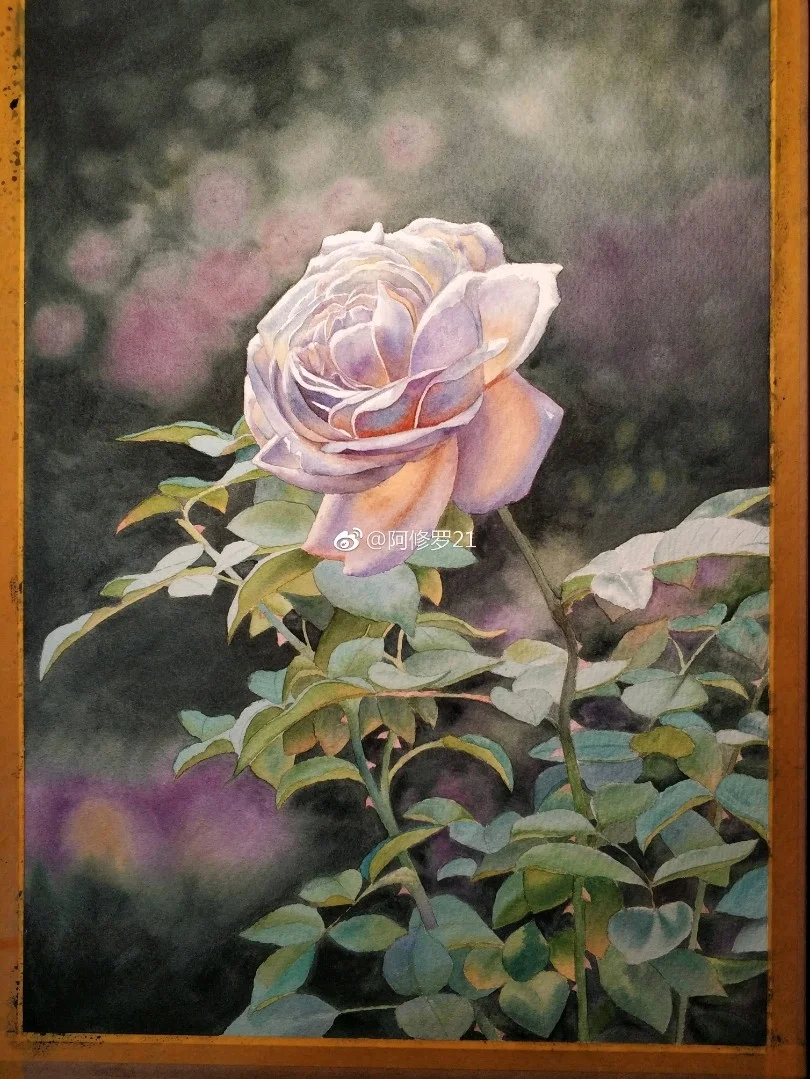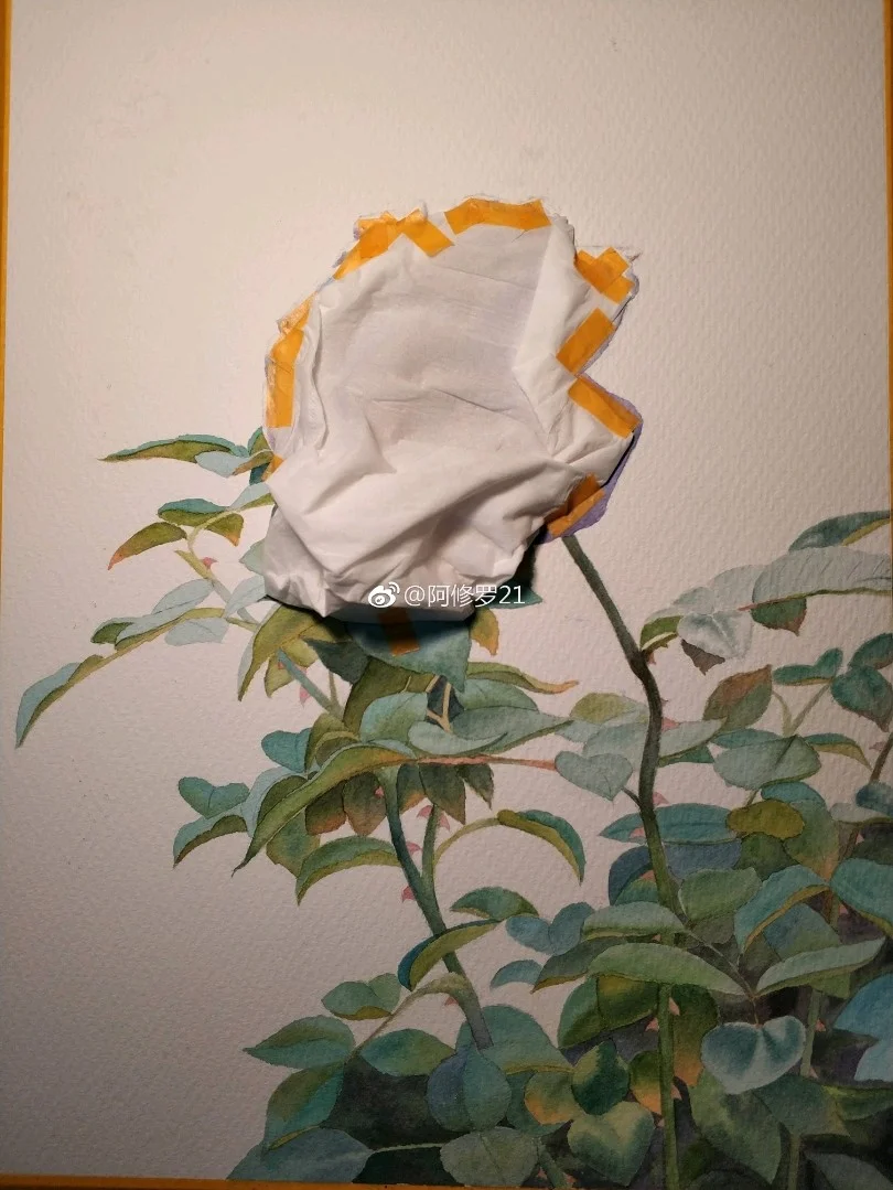 水彩。临摹黄有维老师的玫瑰。叶子可真多哎……