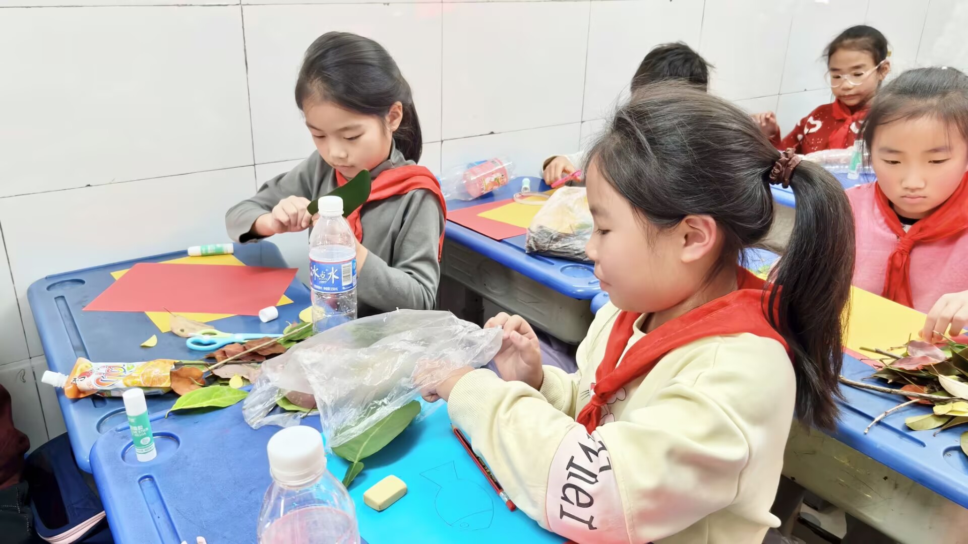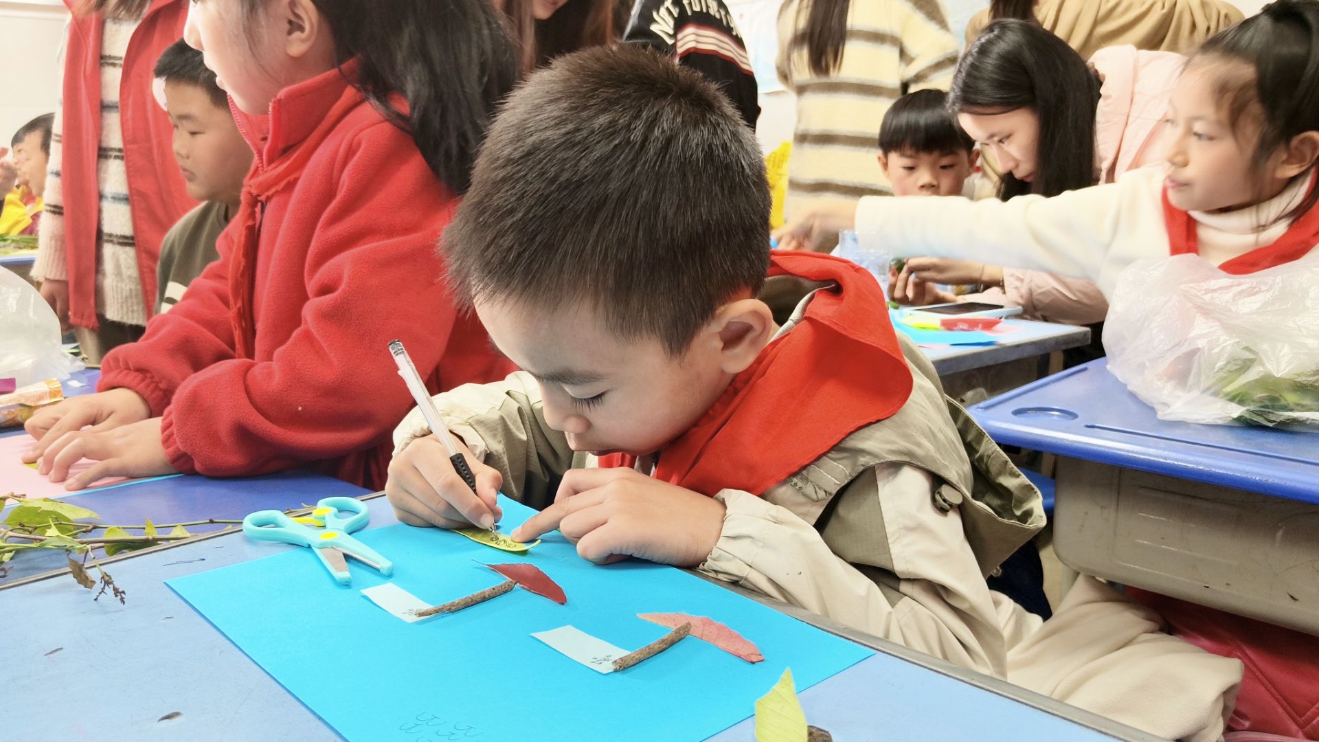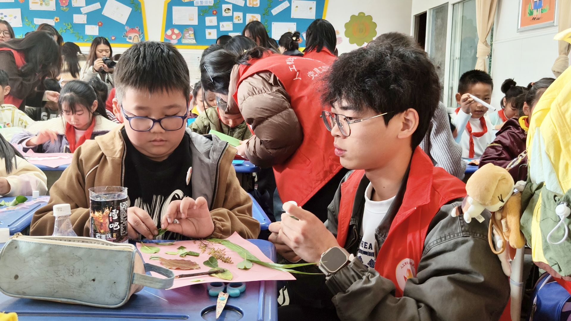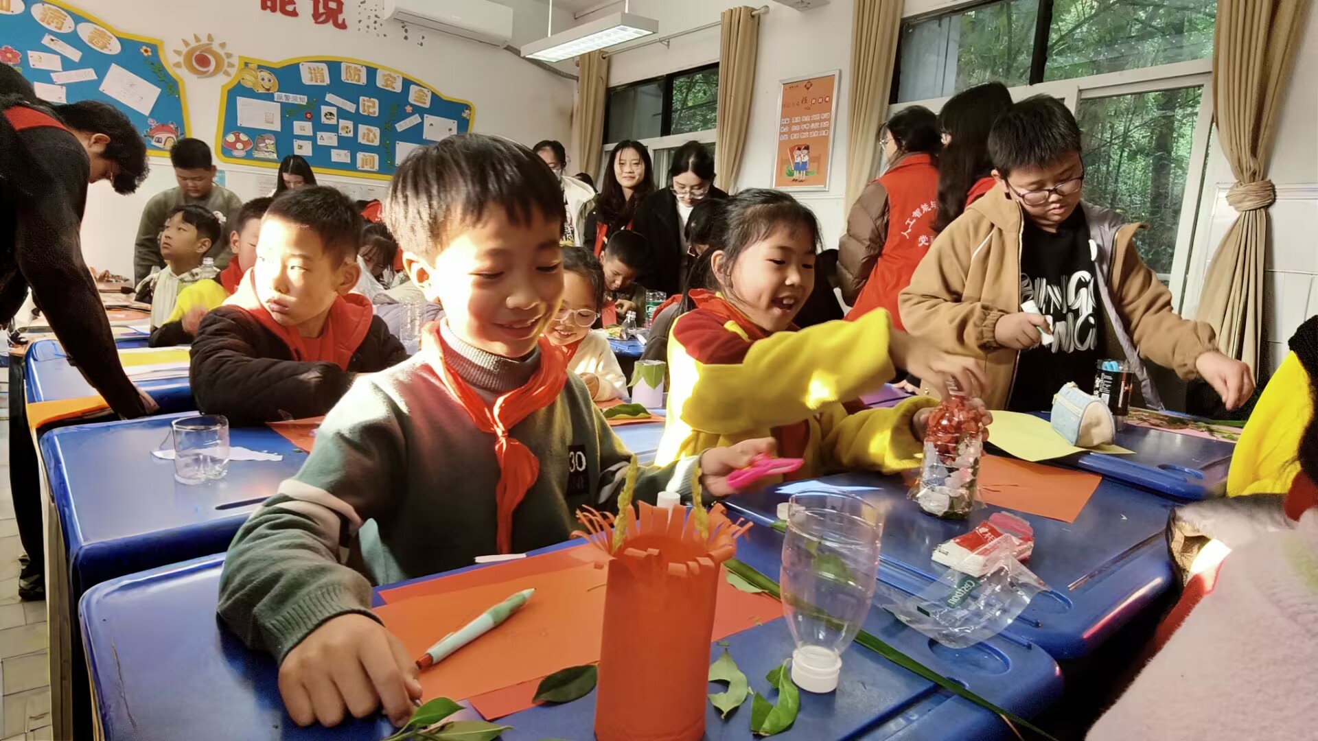 在手工制作环节,志愿者与同学们们结对成组,利用预先收集的塑料瓶、泡沫以及从周边采集的落叶、枯枝等自然材料,共同赋予废弃物品新的生命。同学们在志愿者的引导下,全神贯注地裁剪、拼接、粘贴,普通的材料在他们手中逐渐蜕变为鲜花、金鱼、童话小屋等一个个栩栩如生的“自然精灵”。专注的创作与成功的欢笑声交织在一起,不仅让孩子们亲身体验到“变废为宝”的乐趣,更在他们心中深植绿色发展的理念。