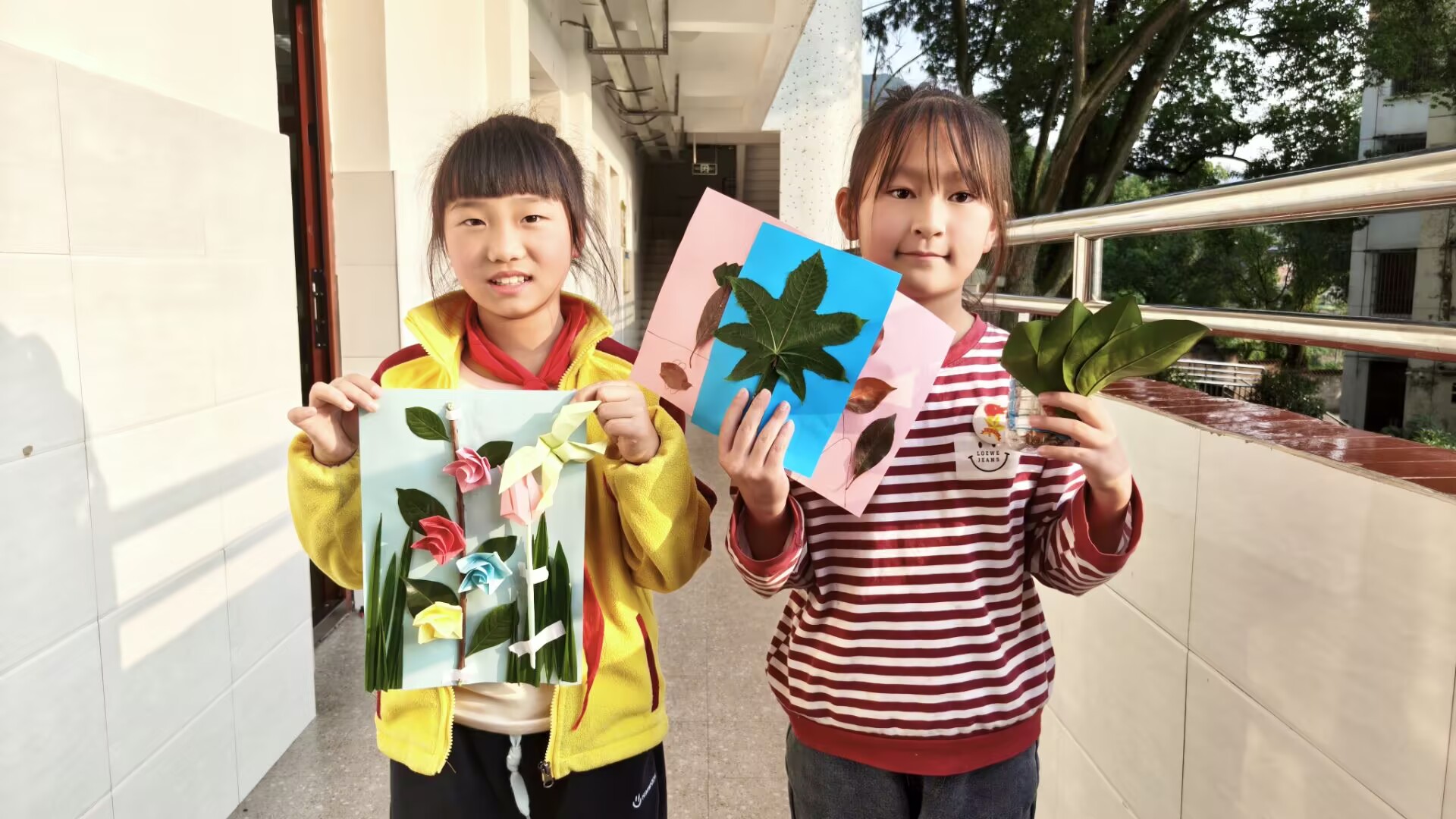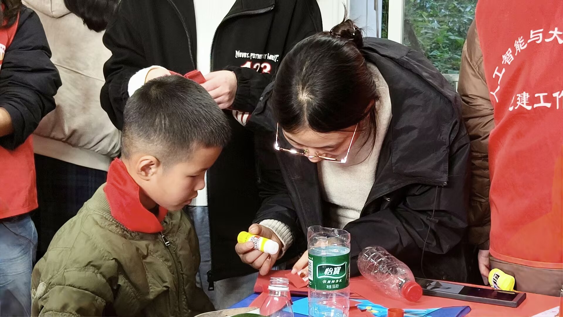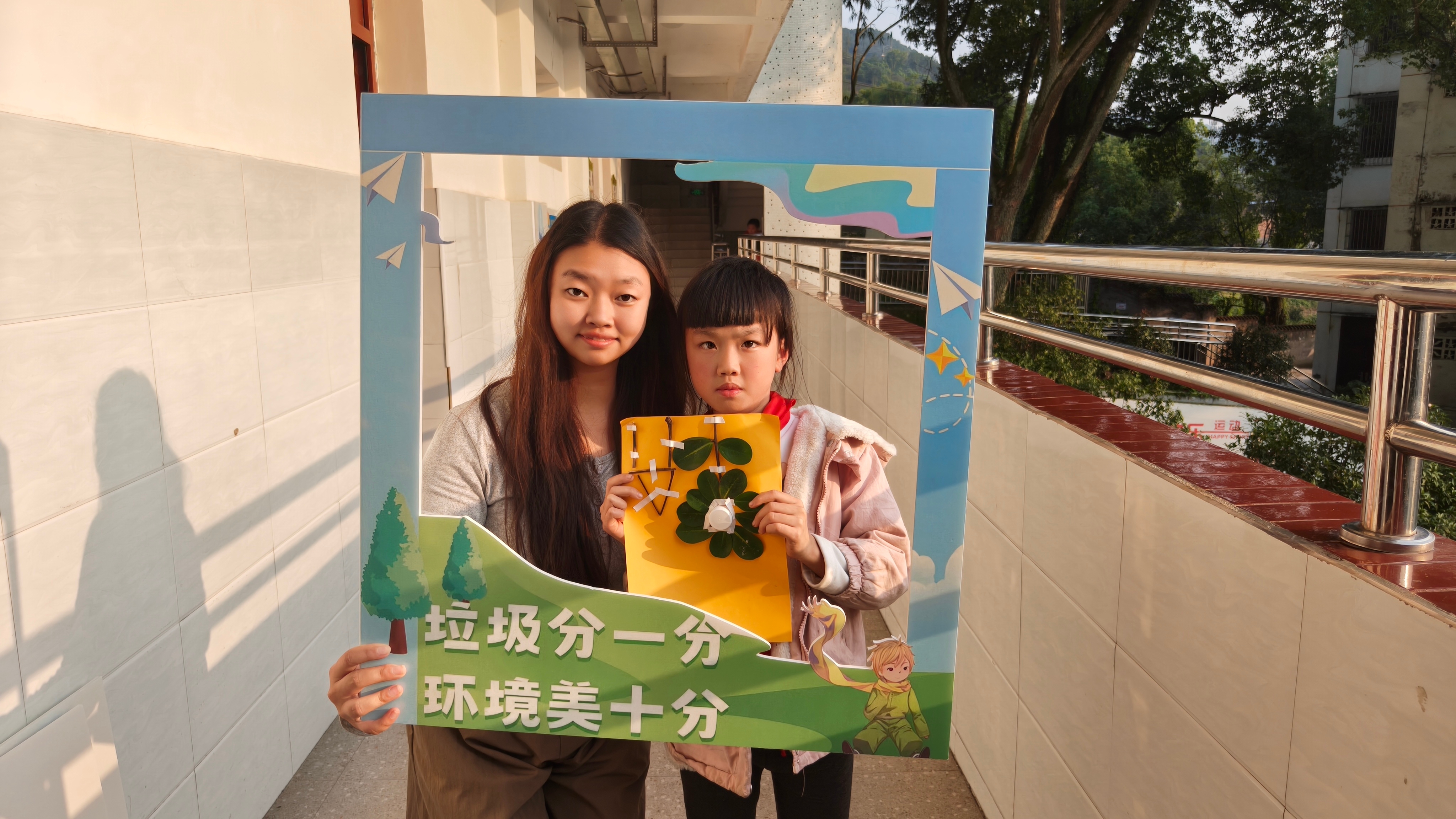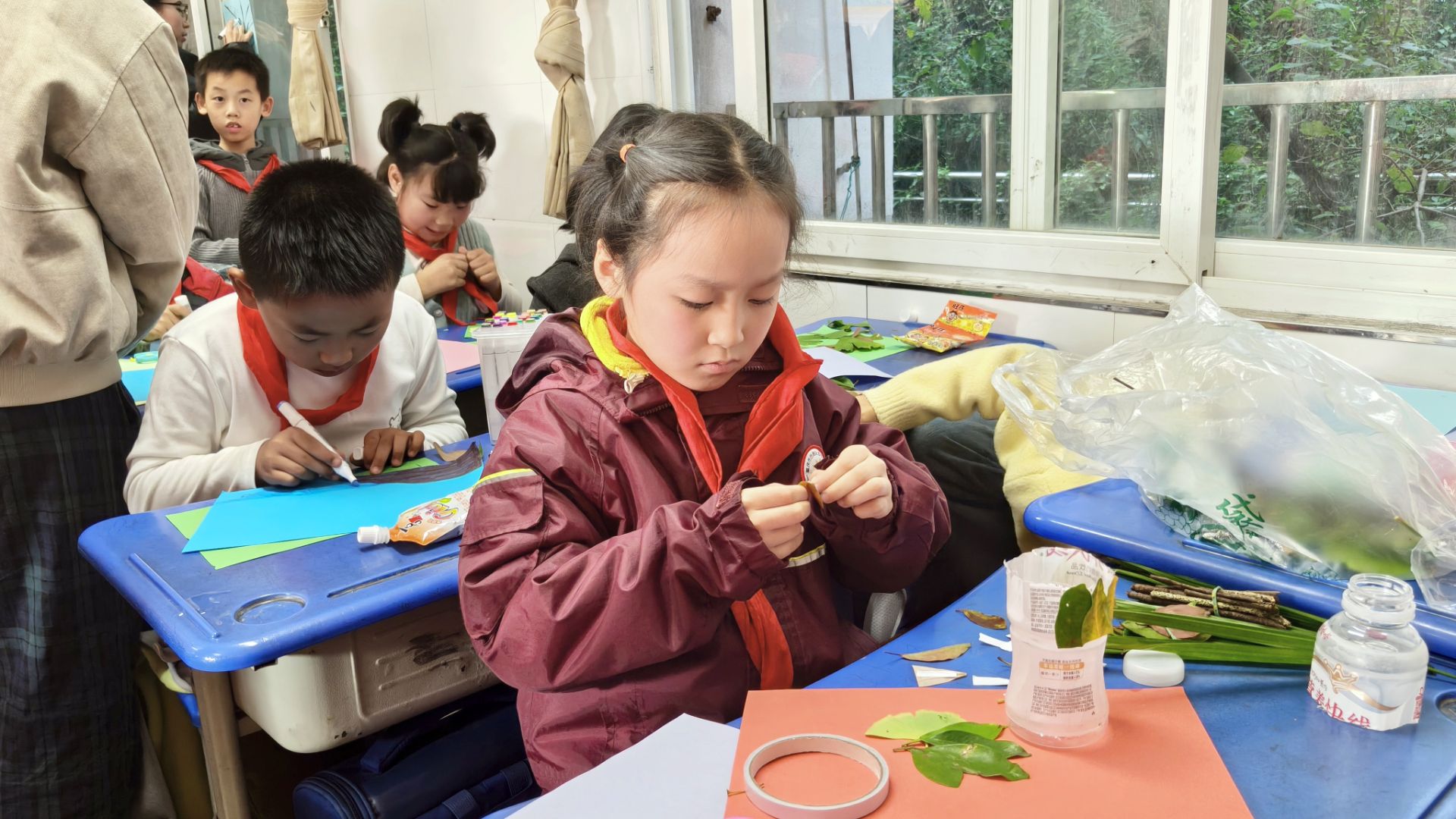 在手工制作环节,志愿者与同学们们结对成组,利用预先收集的塑料瓶、泡沫以及从周边采集的落叶、枯枝等自然材料,共同赋予废弃物品新的生命。同学们在志愿者的引导下,全神贯注地裁剪、拼接、粘贴,普通的材料在他们手中逐渐蜕变为鲜花、金鱼、童话小屋等一个个栩栩如生的“自然精灵”。专注的创作与成功的欢笑声交织在一起,不仅让孩子们亲身体验到“变废为宝”的乐趣,更在他们心中深植绿色发展的理念。