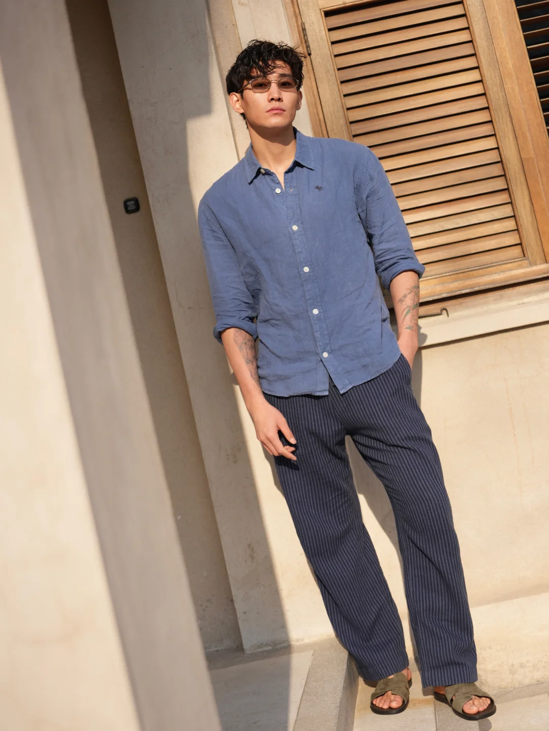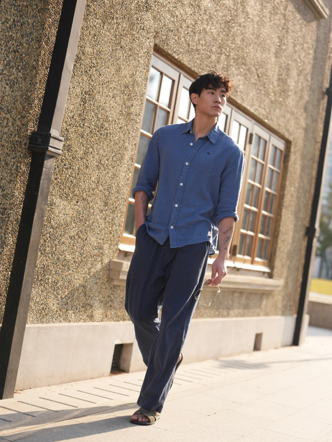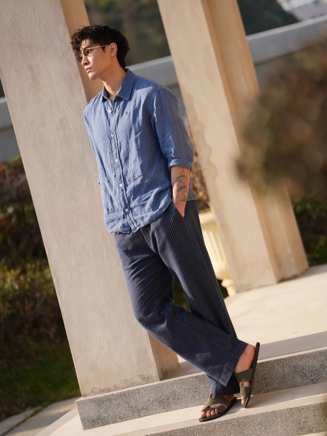 蓝色很清爽,亚麻很自由。假期穿搭不需要用力,舒服本身,就已经很迷人了。