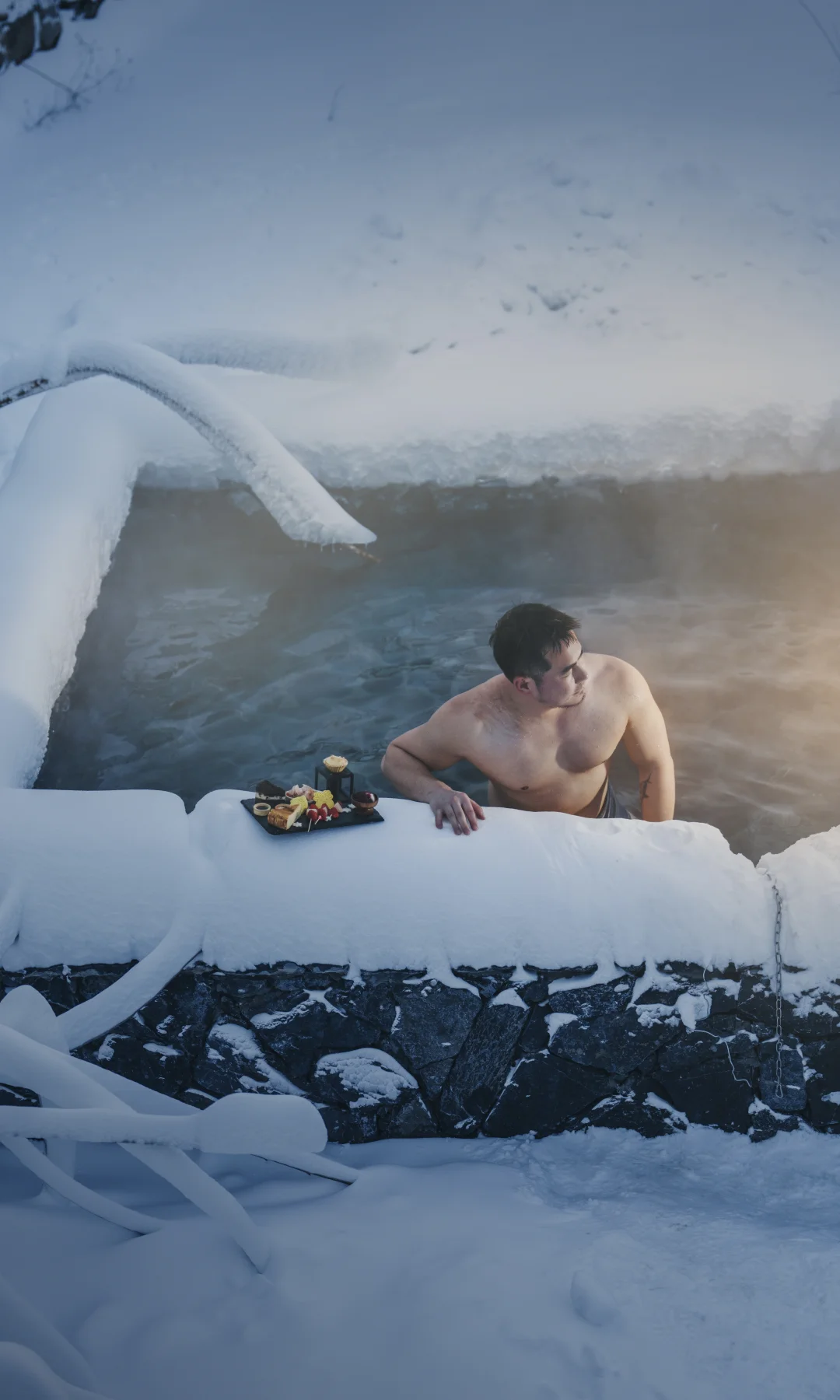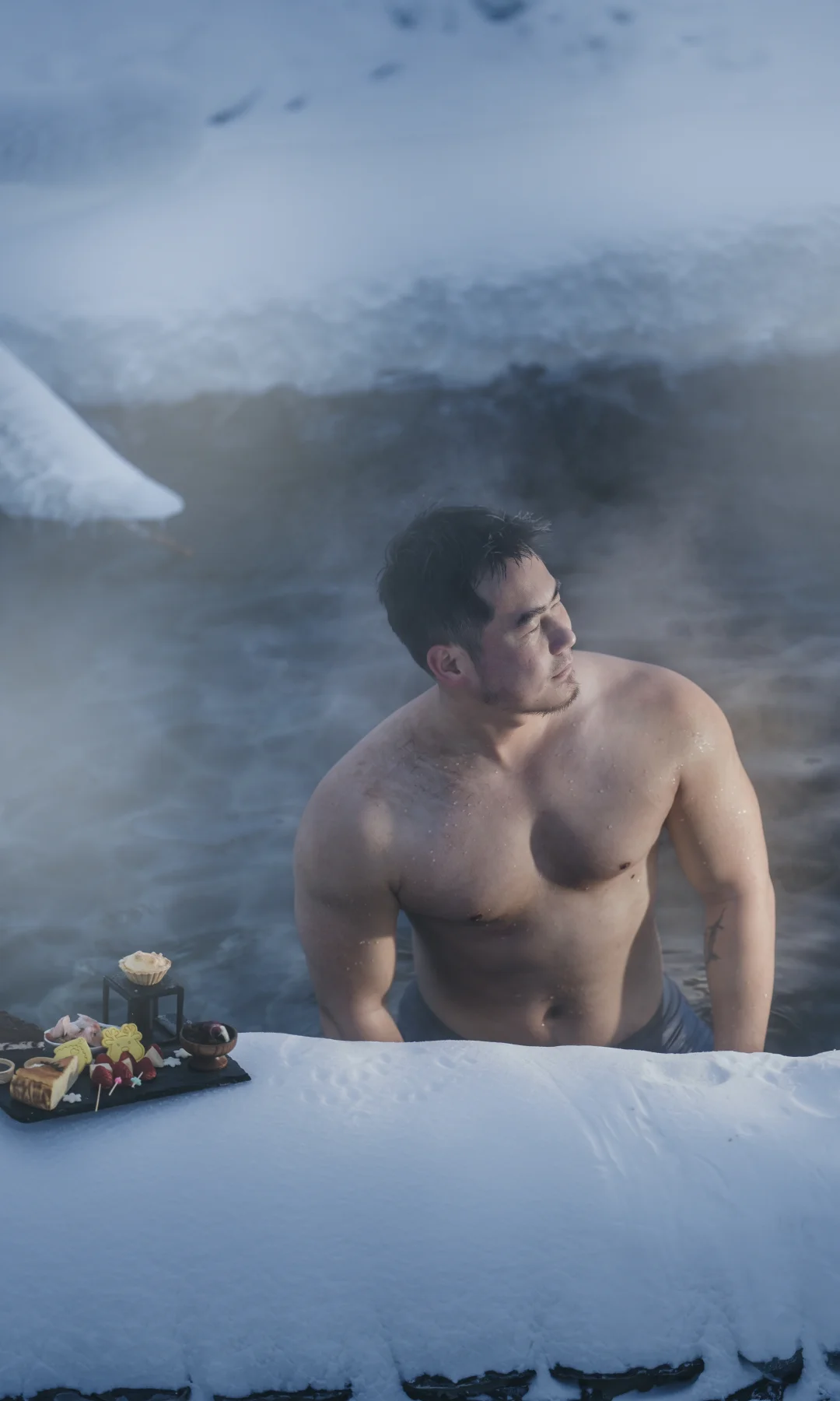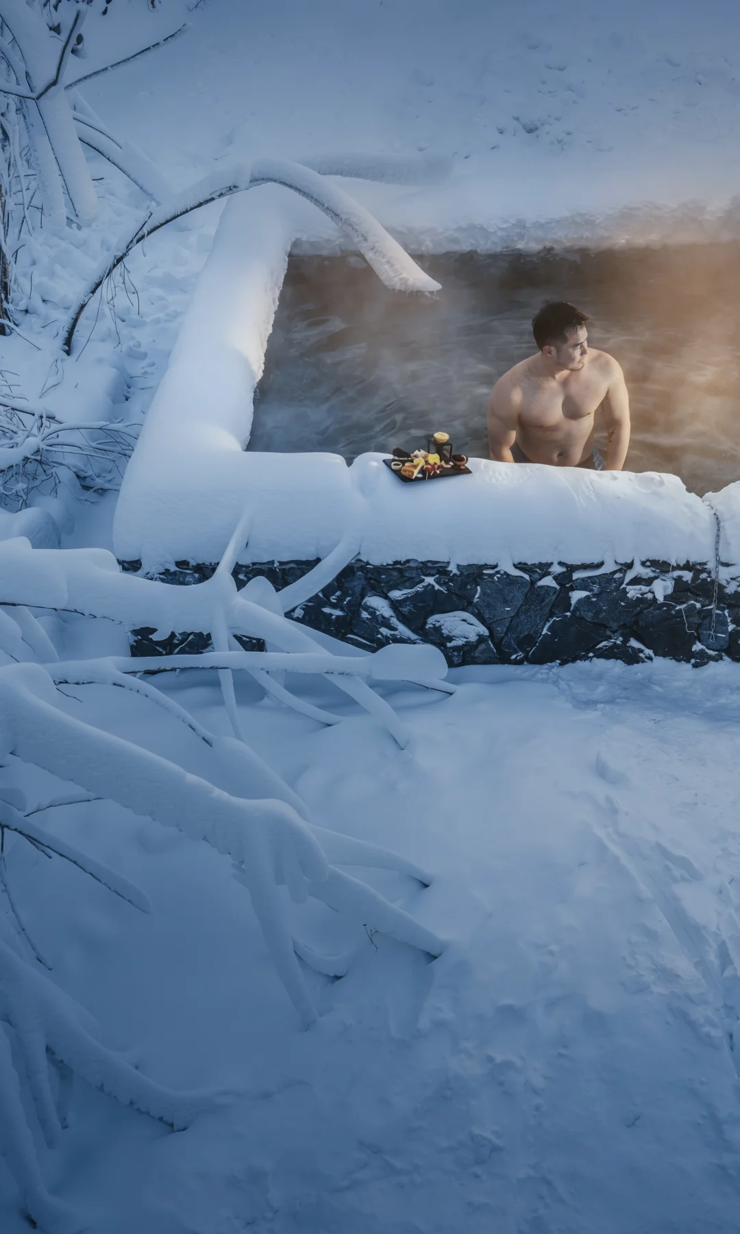 池边铺雪如毯,雾中泡汤观天