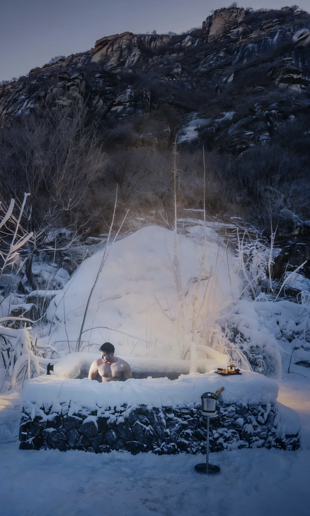 白河峡谷岩壁下,暖汤漫雪