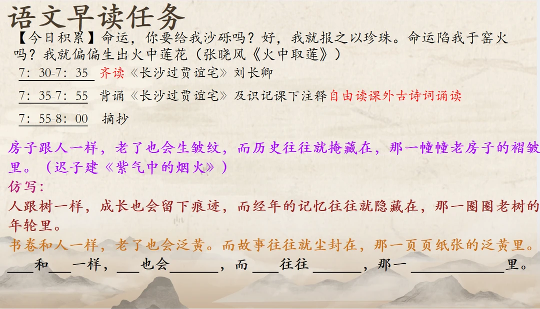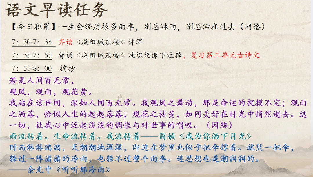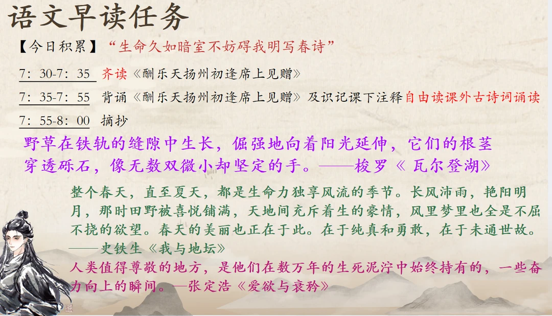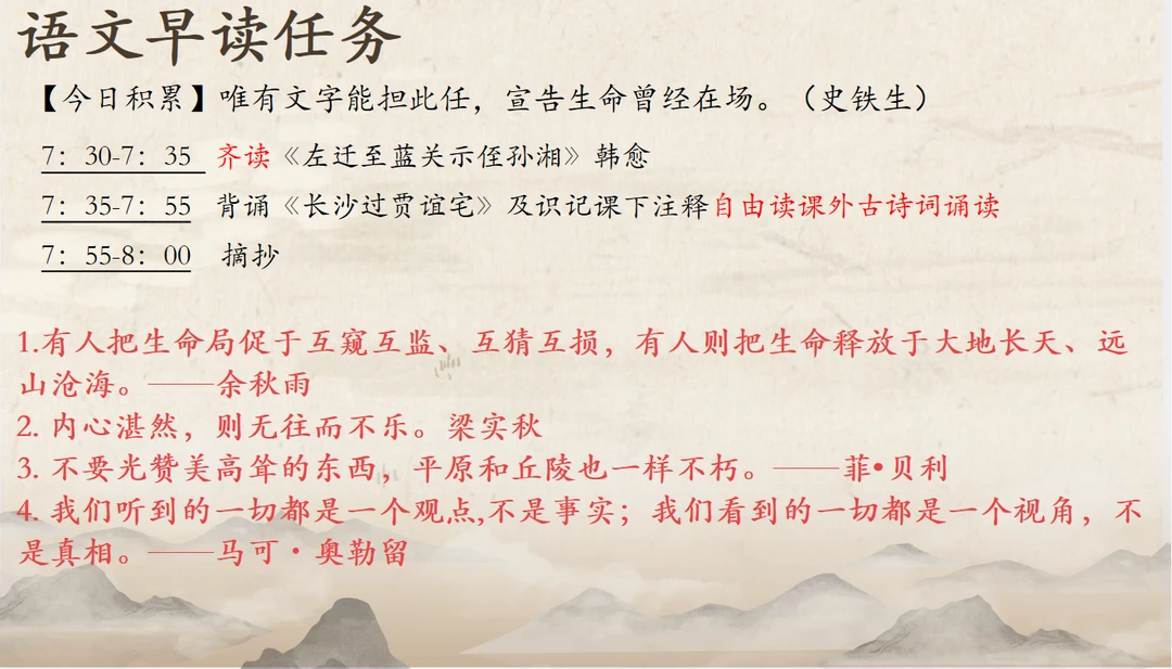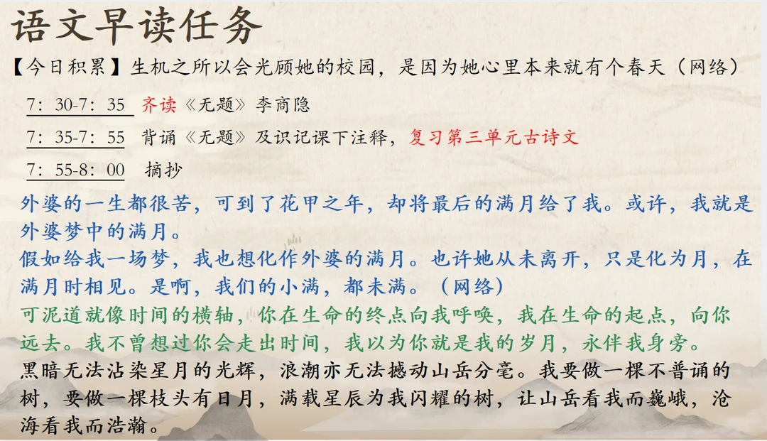 九上早读课件更完啦!有的是根据背诵内容拓展的素材、有的是拓展的诗人生平、还有诗歌主题相关句子,都是极美的文字。 素材来源:名家作品、网络、高中时的素材积累、优秀作文