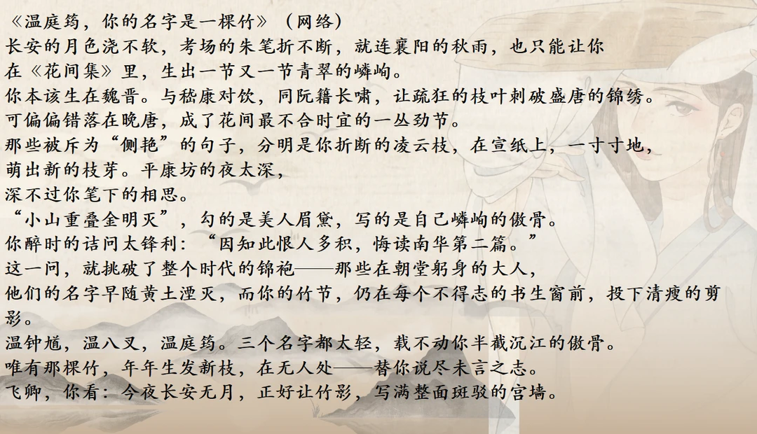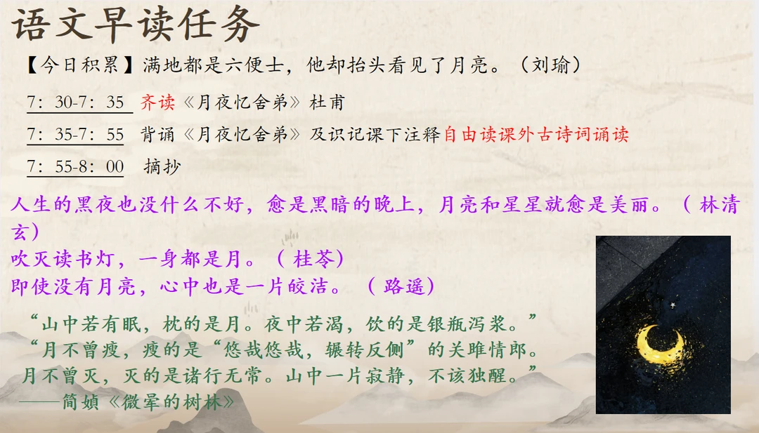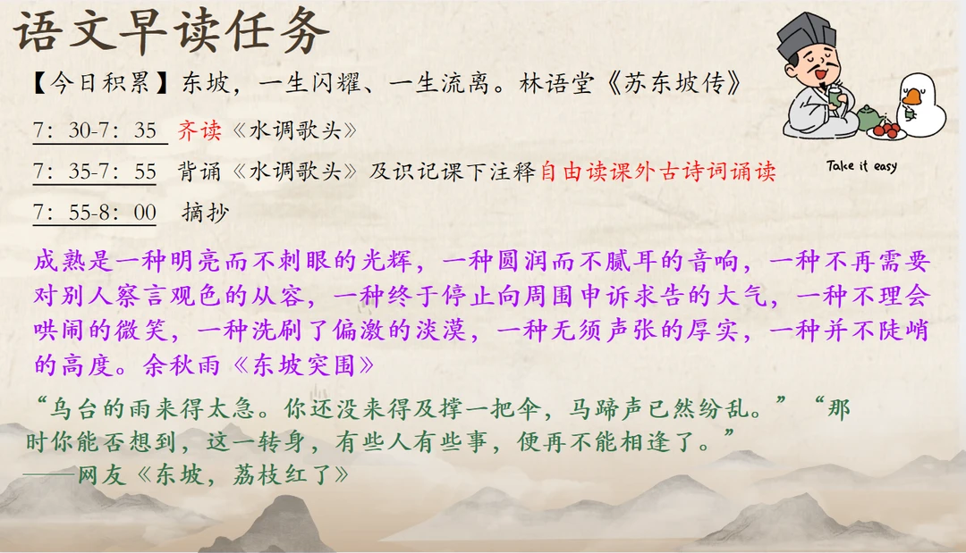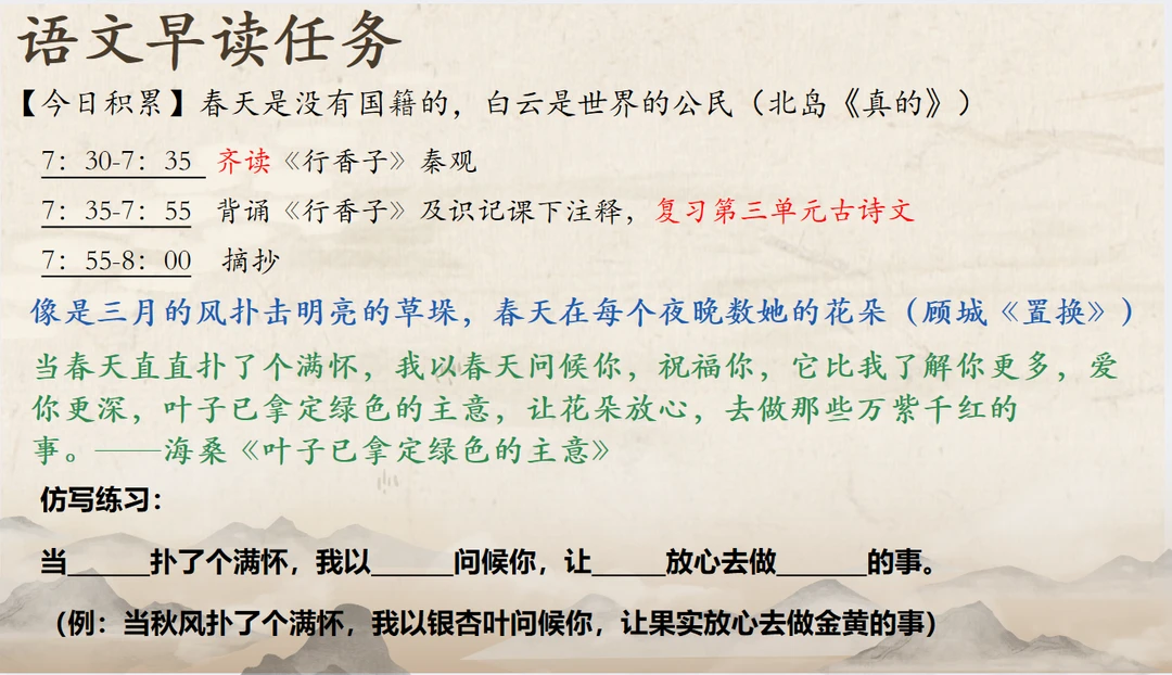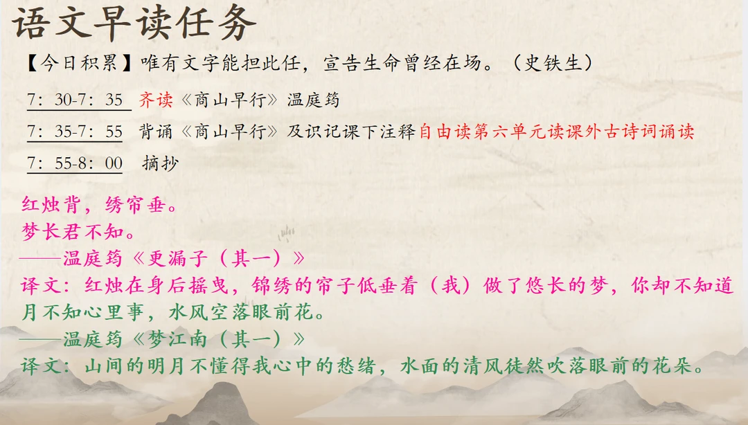 九上早读课件更完啦!有的是根据背诵内容拓展的素材、有的是拓展的诗人生平、还有诗歌主题相关句子,都是极美的文字。 素材来源:名家作品、网络、高中时的素材积累、优秀作文