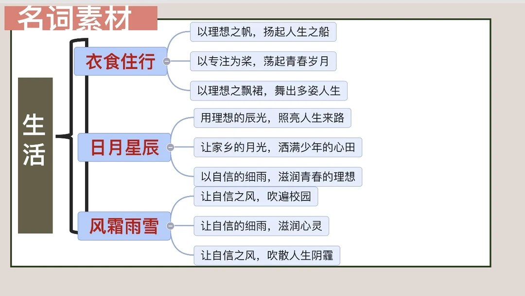 注意:公式中用的名词要和后面的动词搭配,如烛光+点亮,可以写成“用自信的烛光,点亮黑暗岁月”