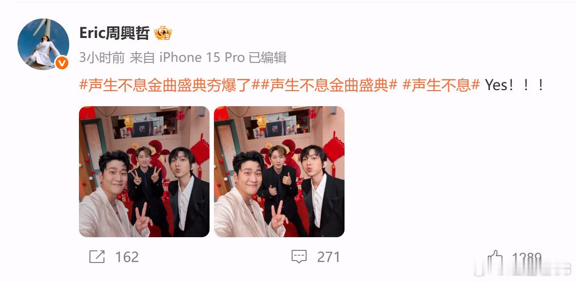 周兴哲晒汪苏泷林宥嘉合照声生不息 红背景衬得三位格外精神,黑白西装又添了几分正式感。这组合照既有创意又不失格调,确实值得点赞。