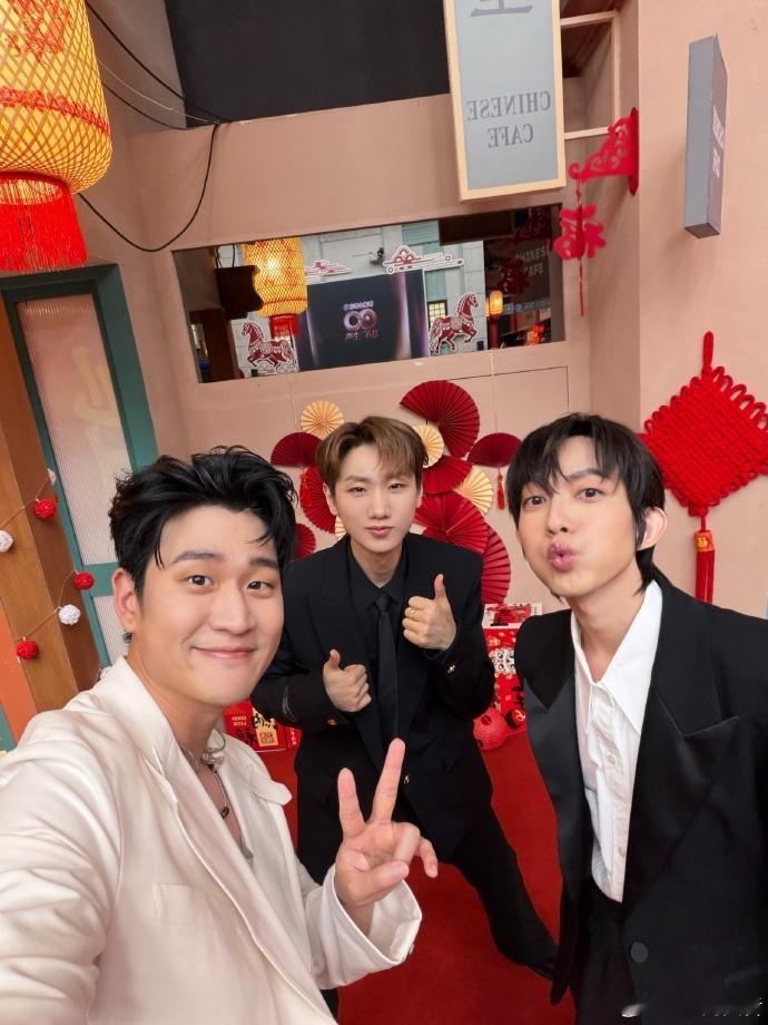 周兴哲晒汪苏泷林宥嘉合照声生不息 红背景衬得三位格外精神,黑白西装又添了几分正式