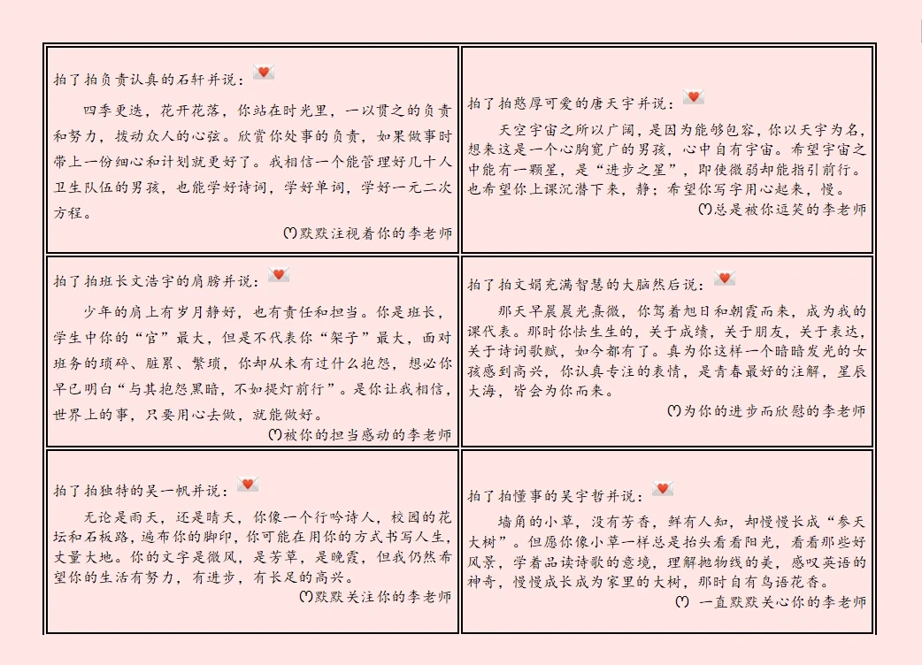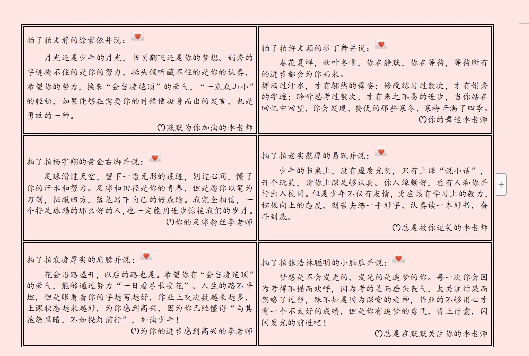 永远年轻,永远喜欢创新 任教第三年,第六次写评语,分享我的思路 💕拍了拍开朗的XXX并说: 🌈中间可以自由发挥,我是先环境描写,渲染情感,或者也可以引用化用优美句子,接下来就是用细节描写或者其他方式写学生的平时表现,抓住一个点即可,最后是期待。 🌸XXXX的李老师(可以是 期待你进步、默默关注你、你的铁杆粉丝、你的超级粉丝、一起成长、被你感动,为你欣慰)