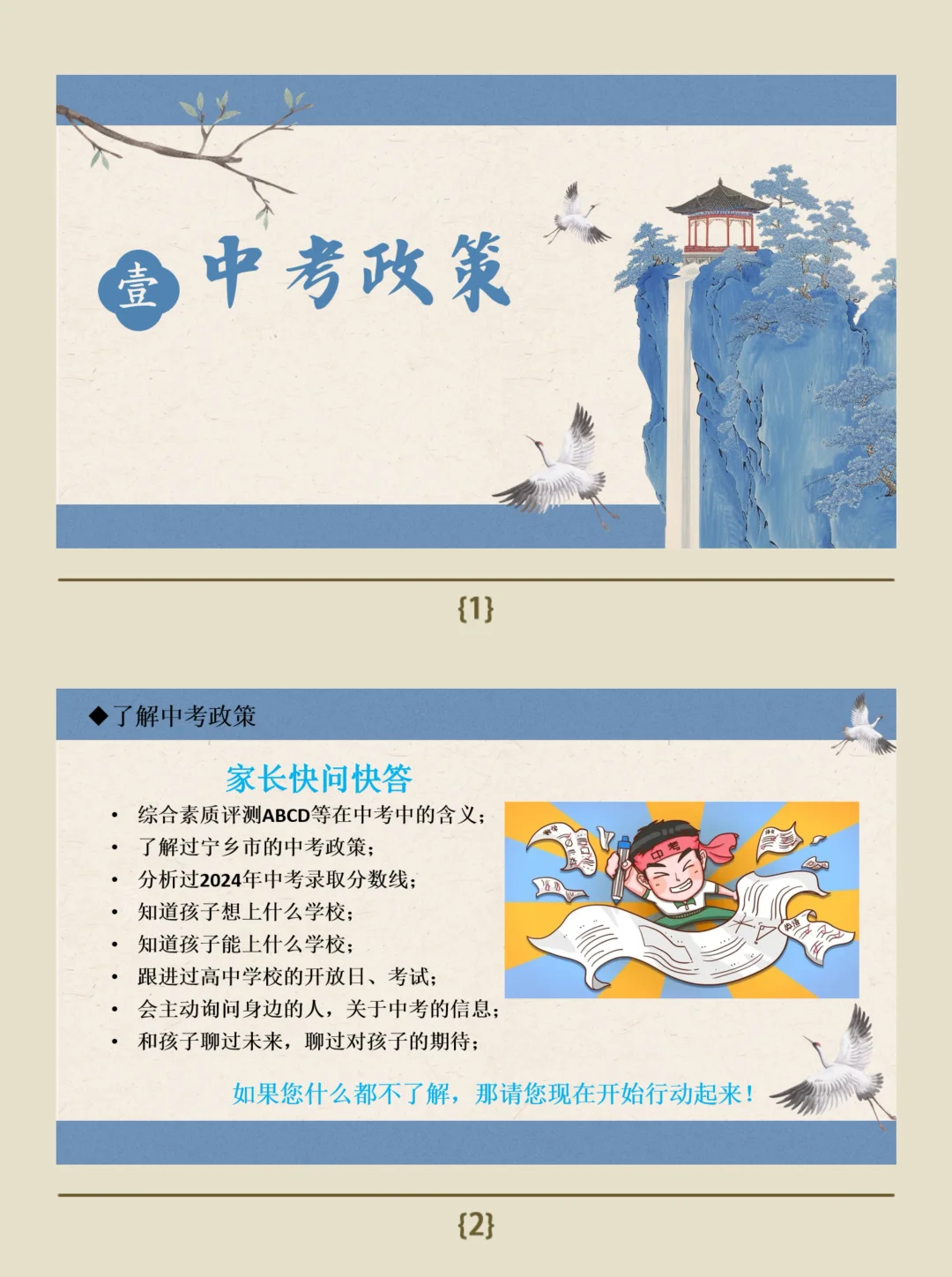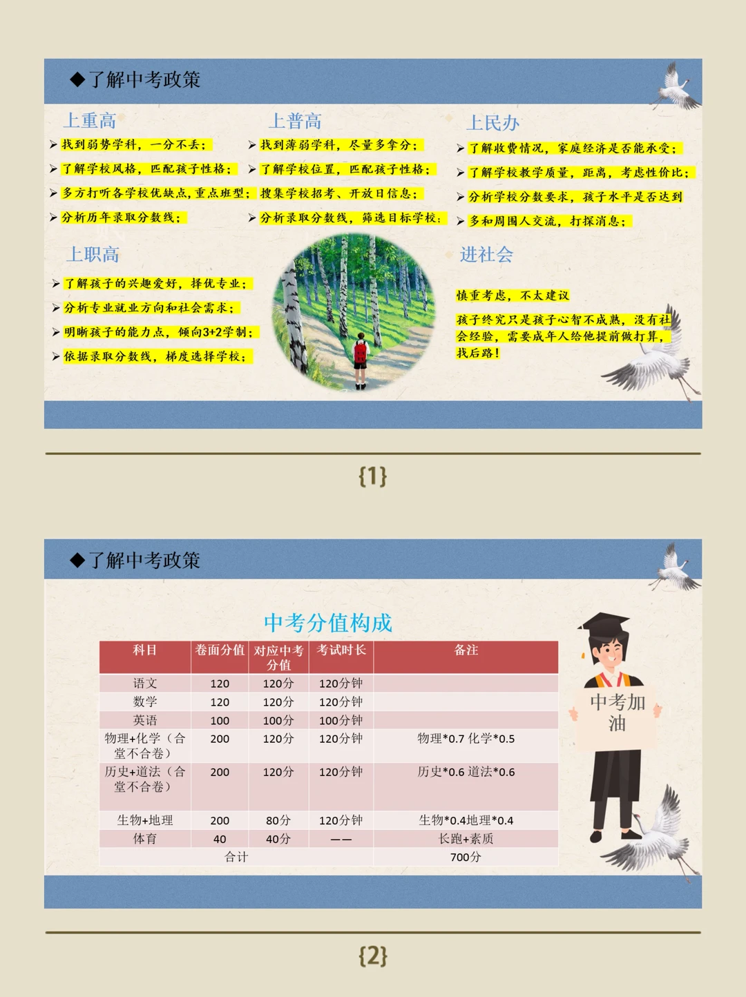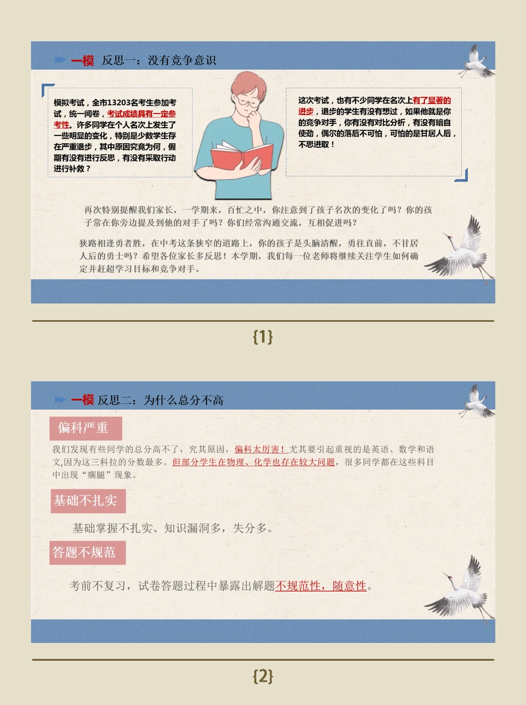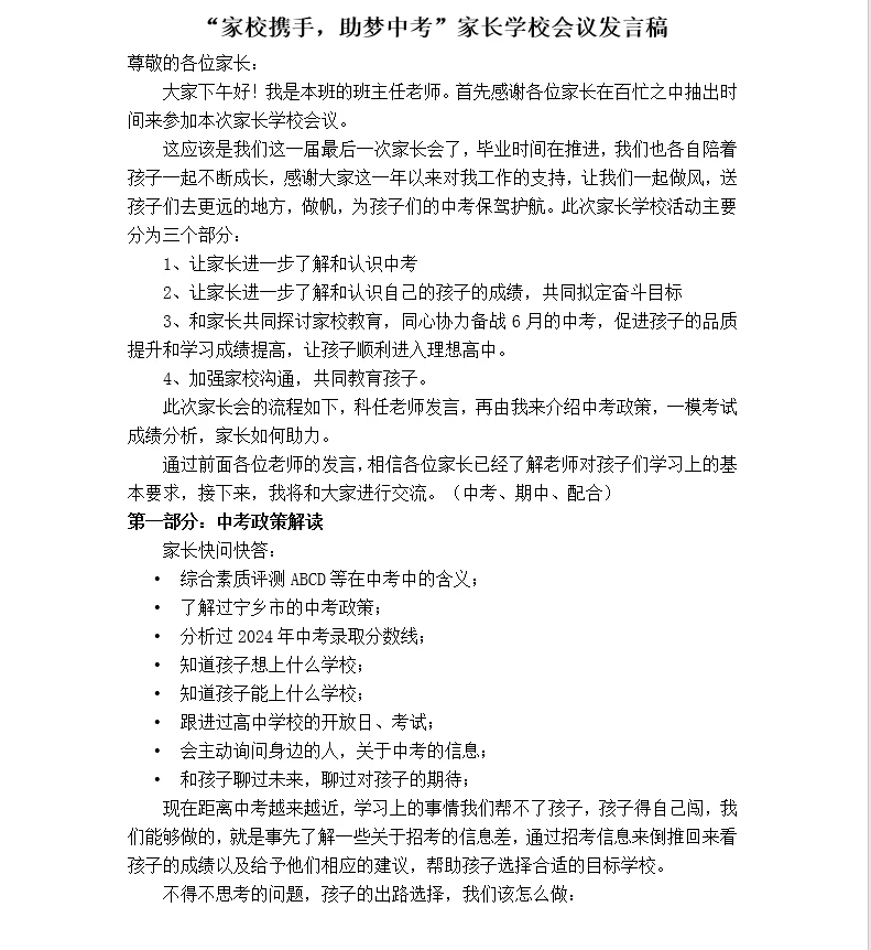 与其他年级家长会的侧重点不同,主要是讲解中考政策和根据一模考试成绩给不同梯队的孩子提出考后学习建议