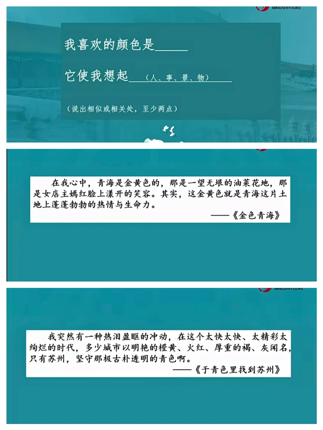 👋亮点:由颜色联想到人的性格其实很好理解,借助范文理解相似联想和相关联想,再应用;课程中学生提到了克莱因蓝和耀月白,但老师却不知道是什么颜色,学生很开心,活跃了课堂气氛,挺有意思的