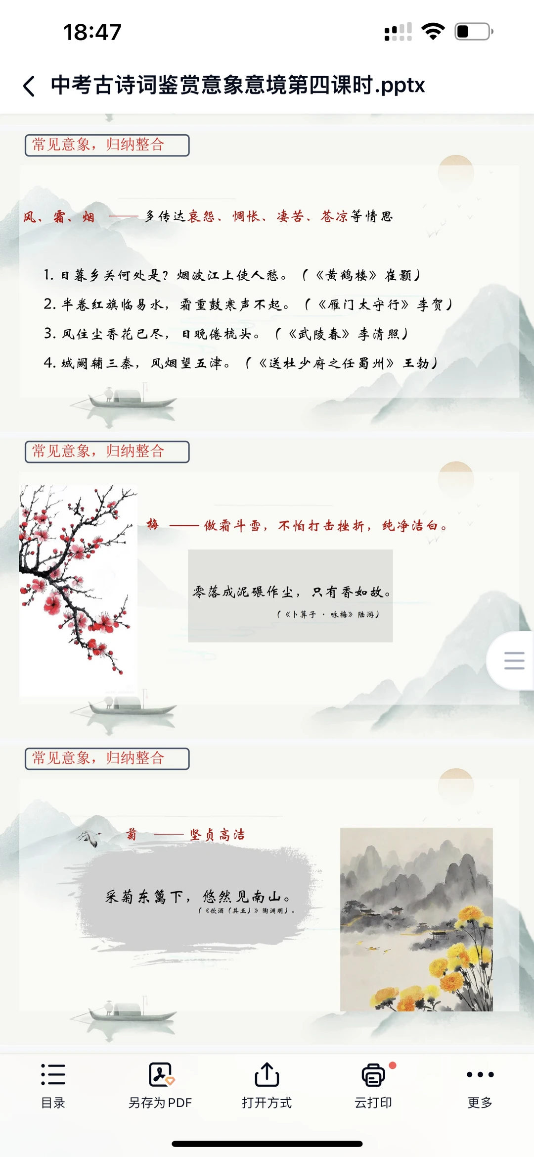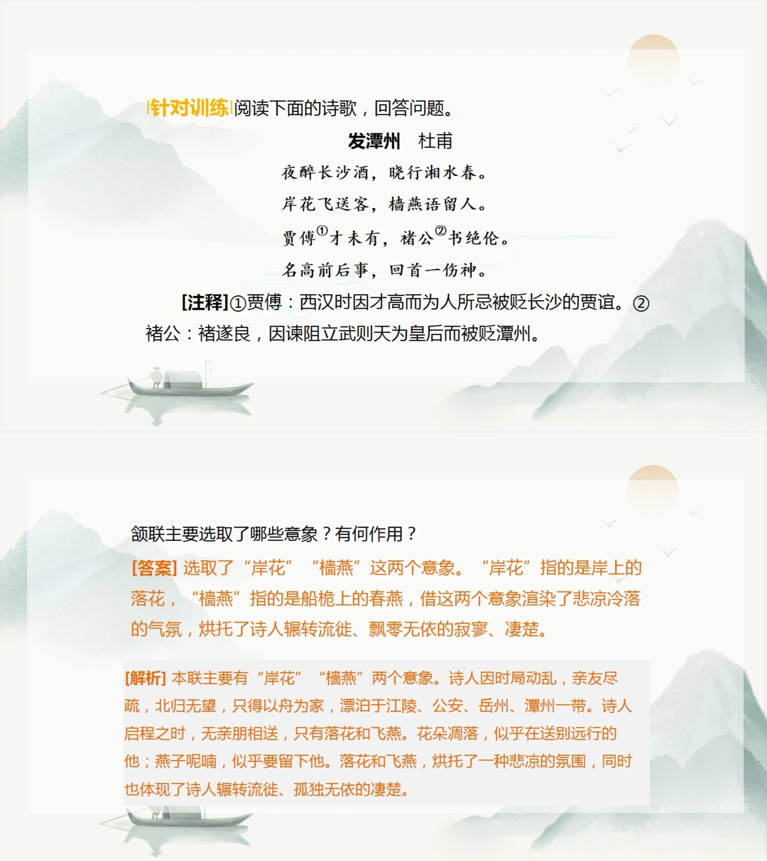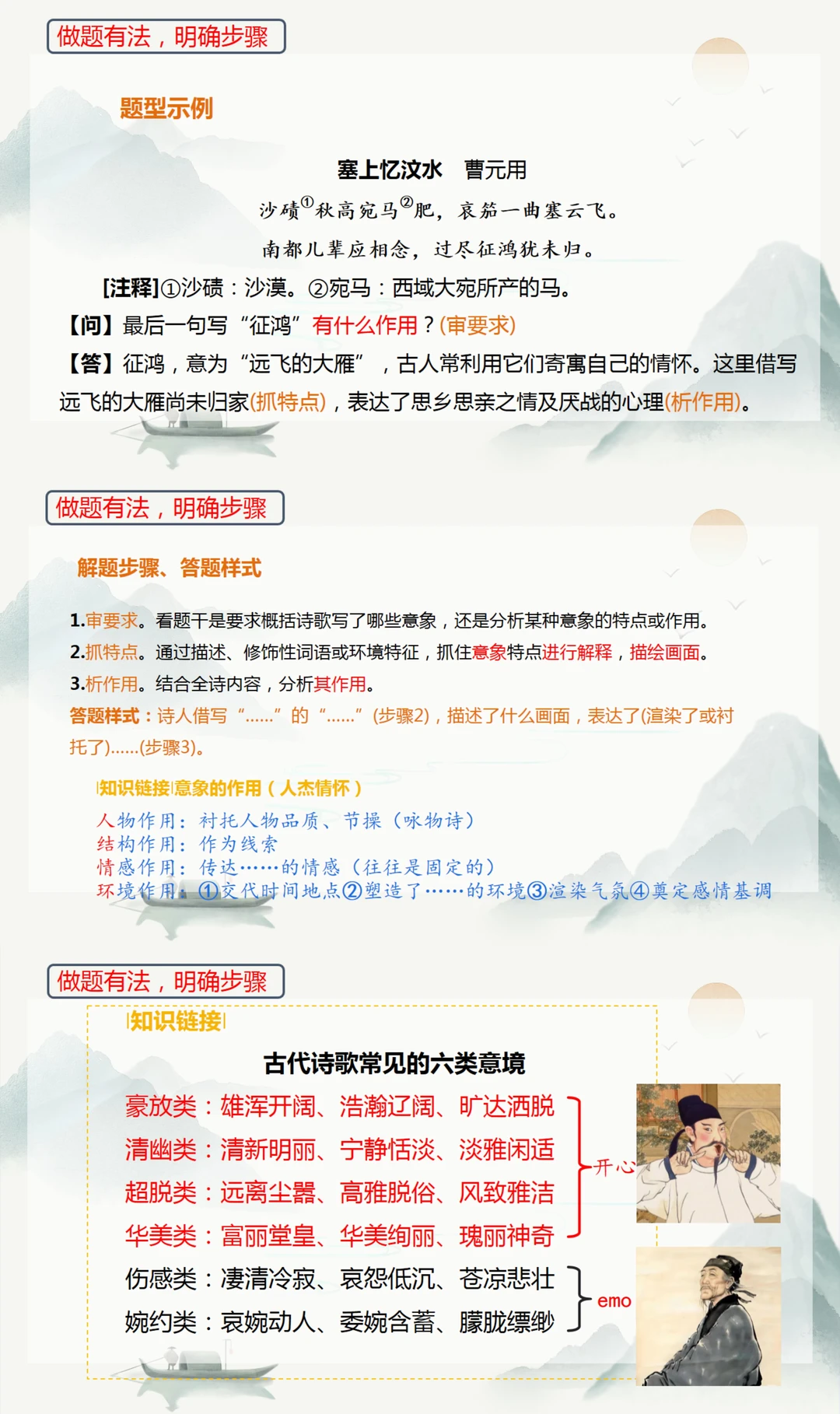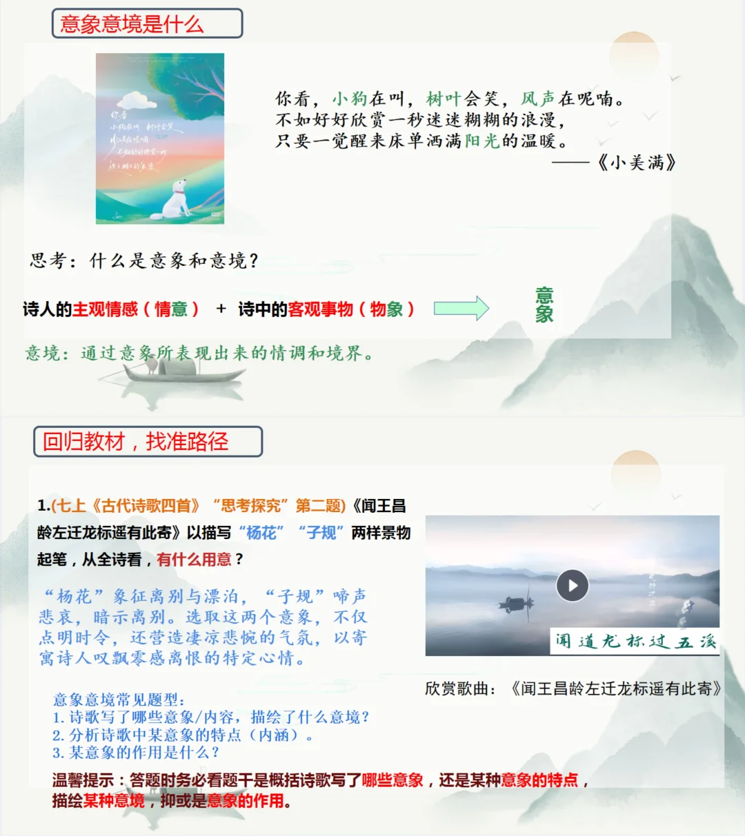 选择了我喜欢的一首歌《小美满》作为导入,希望能把歌曲中的乐观和治愈带给学生,引出意象意境的定义。 明确考点:有哪些意象、意象的特点、营造了什么意境、意象的作用 明确做题思路:审要求、抓特点、析作用 补充意象作用 补充常见意象及其内涵 练习巩固
